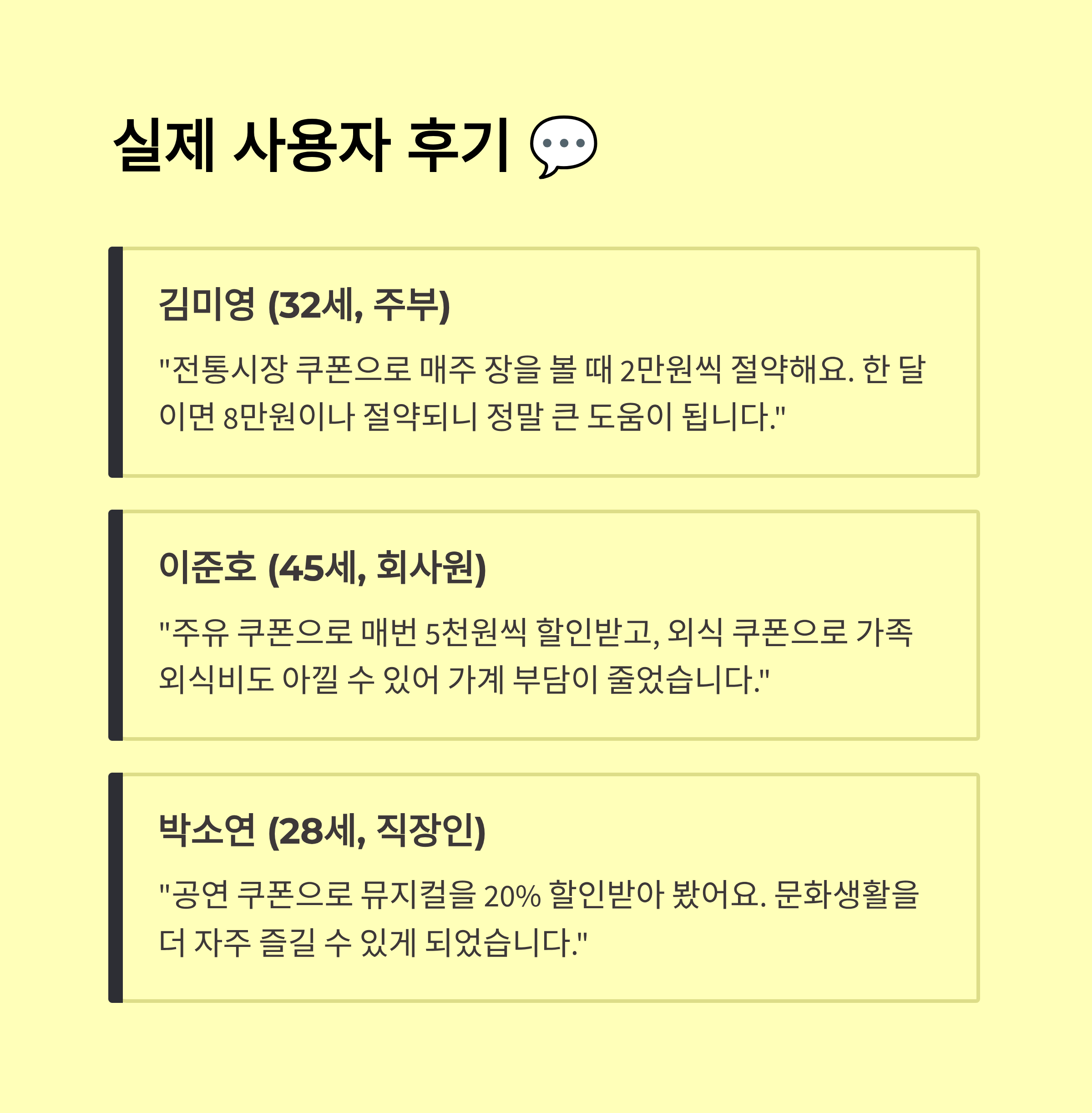 실제 서울 동작구에 거주 중인 박민지(42세) 씨는 쿠폰을 활용해 한 달에 약 8만원 정도를 절약했어요. 평소에는 자녀와 함께 외식을 자주 하는데, 민생 소비쿠폰으로 지원받은 4만 원 상당을 **동네 분식집과 전통시장 장보기**에 사용했고, 나머지는 문화센터 연극 관람에 썼다고 해요.