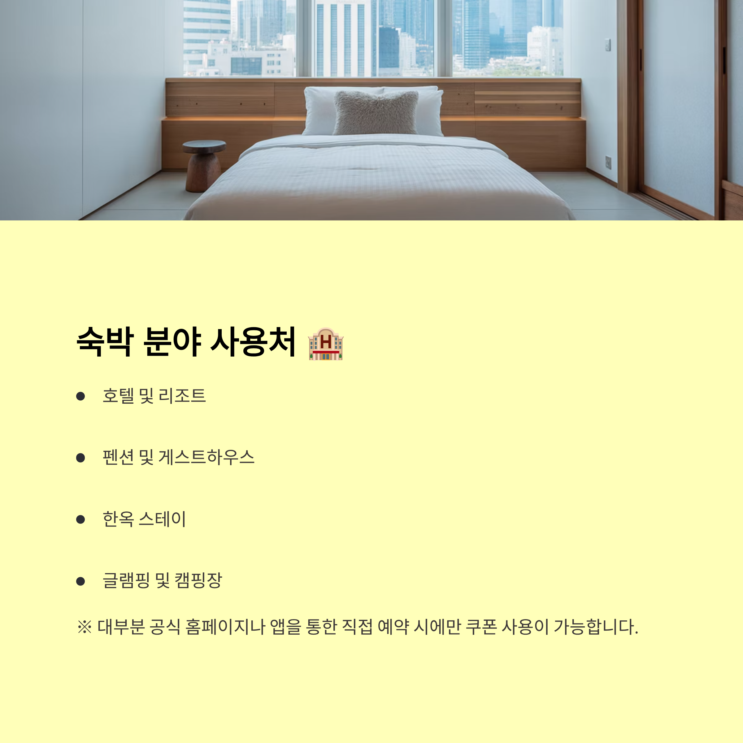 | 숙박 | 호텔·펜션 일부 연계 | 호텔+리조트 할인 | 관광숙소 객실 할인가 |