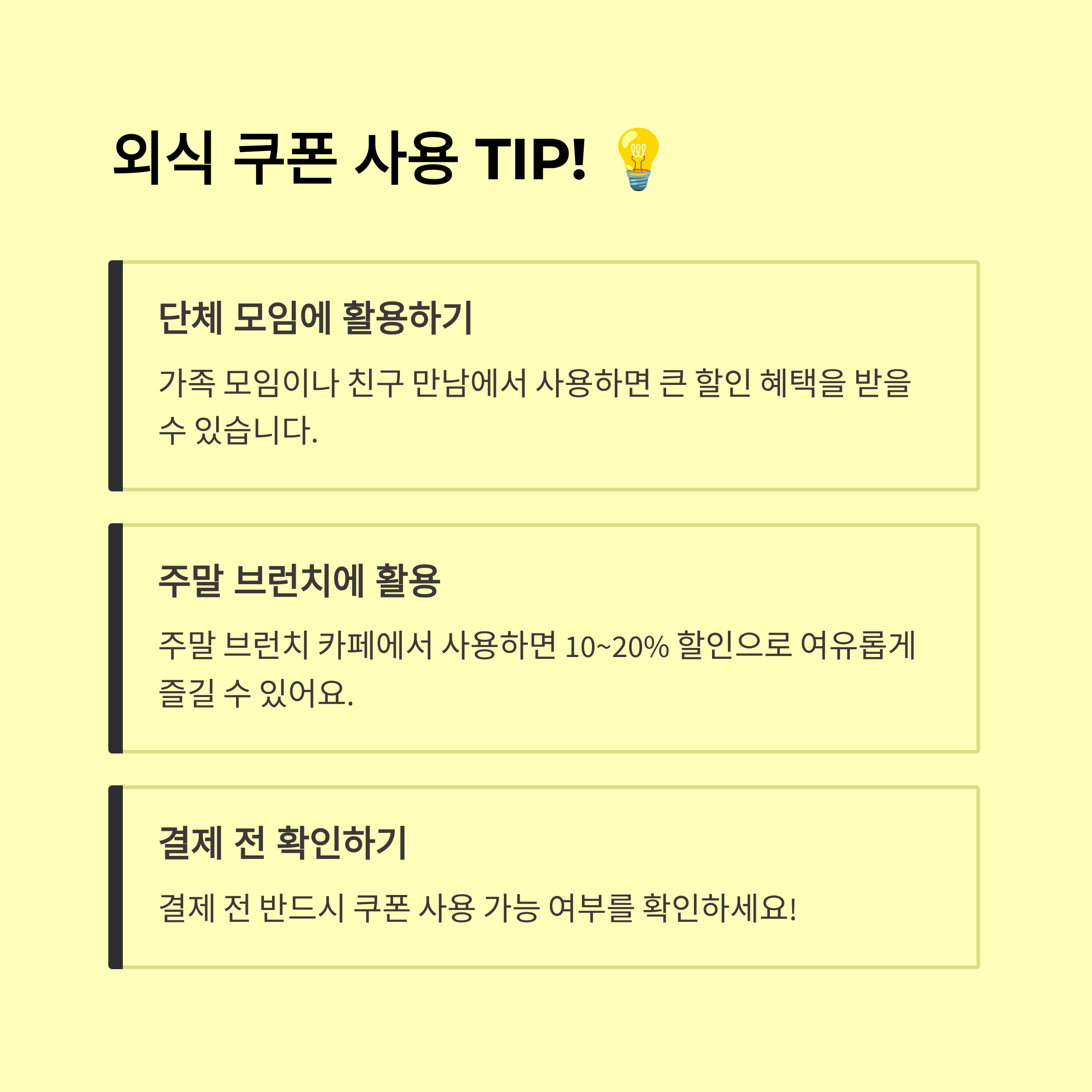 - 1) 평일 점심 외식 활용 – 쿠폰 + 점심 특선 할인 중복
