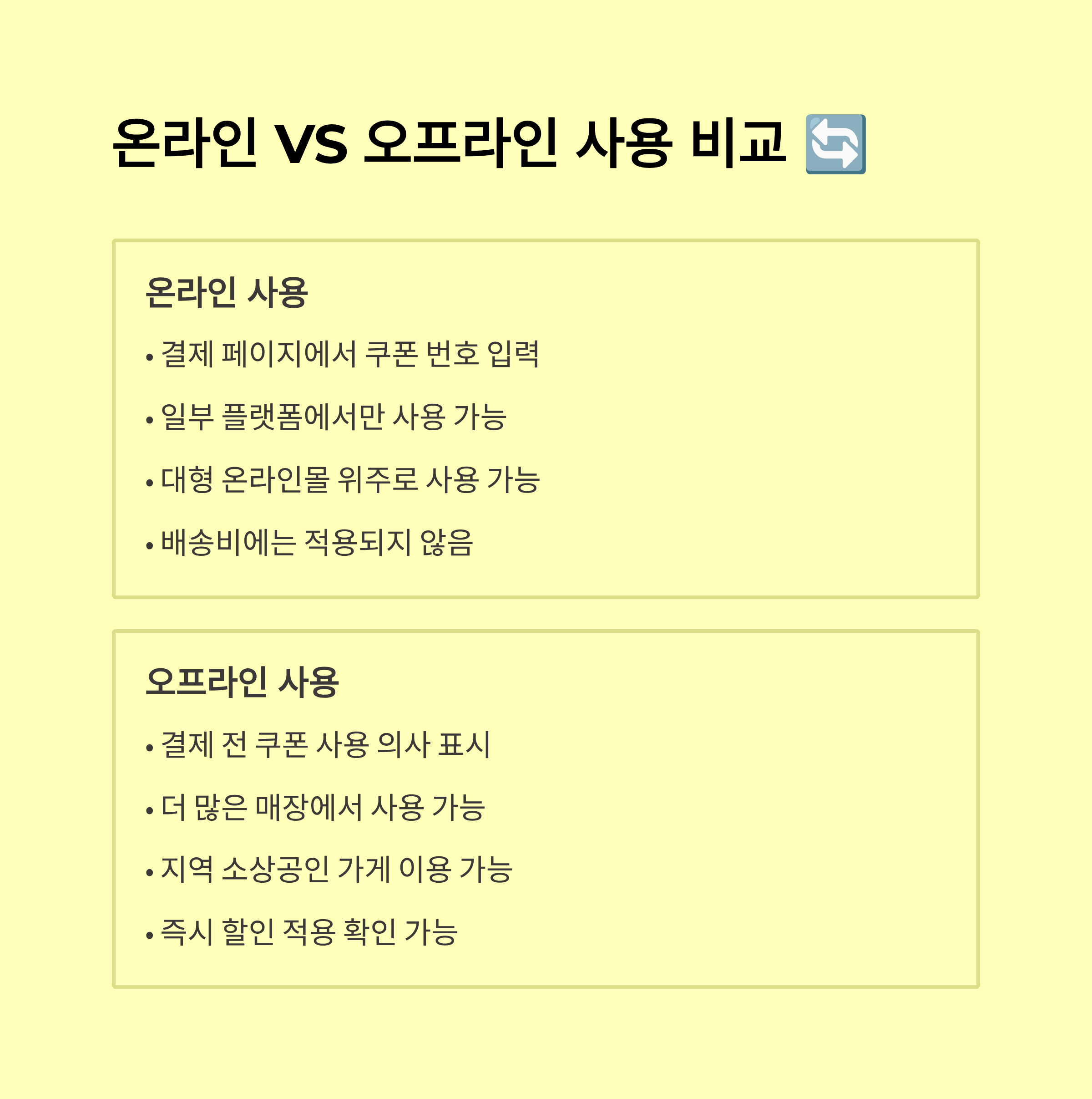 쿠폰은 모바일 앱 또는 종이 형태, 신용카드 포인트처럼 연동되는 방식까지 다양해서 **디지털에 익숙하지 않아도 문제없어요**. 특히 요즘은 스마트폰으로 문자를 받고 QR 코드를 스캔하면 끝나는 방식이라 간편하답니다.
