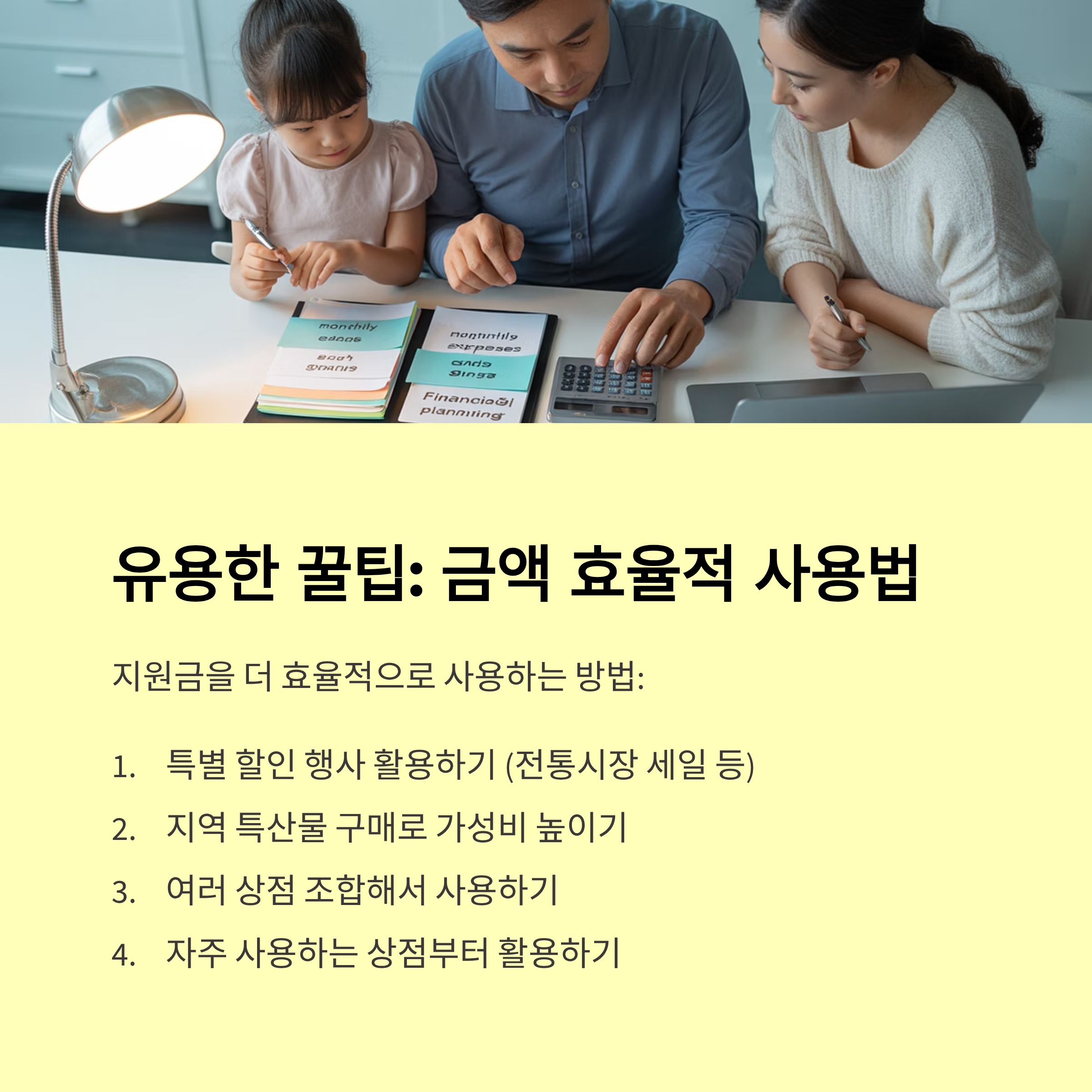 예를 들어 매달 지출되는 학원비, 병원비, 미용실비 등을 먼저 정리해서 그 중 지원금으로 대체 가능한 부분부터 사용하는 게 좋아요.