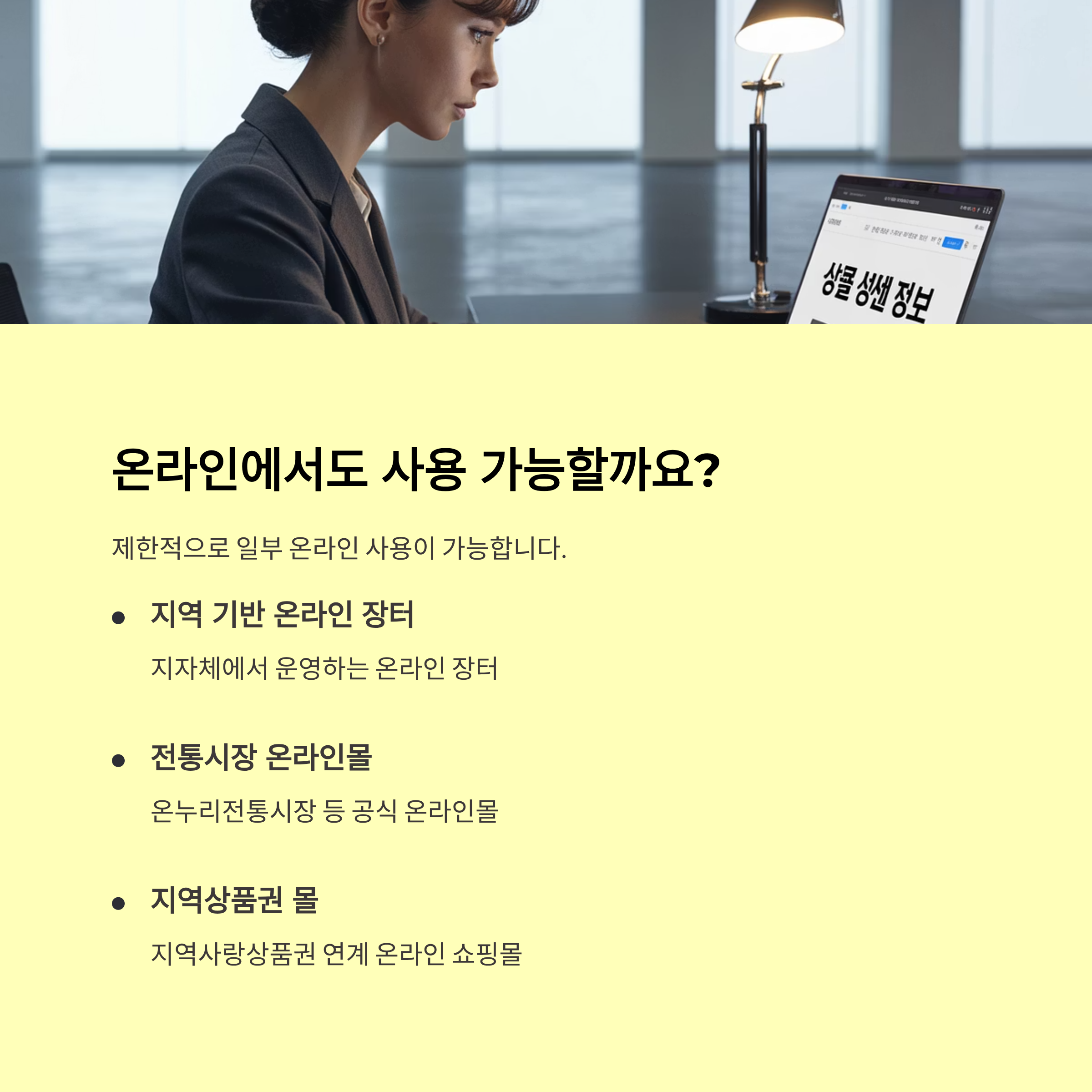 기본적으로는 오프라인 매장 중심으로 설계된 정책이기 때문에 온라인 사용은 제한적인 편이에요. 다만 몇몇 지자체는 지역 소상공인이 운영하는 온라인몰에서 사용 가능하도록 제도를 개선했어요.