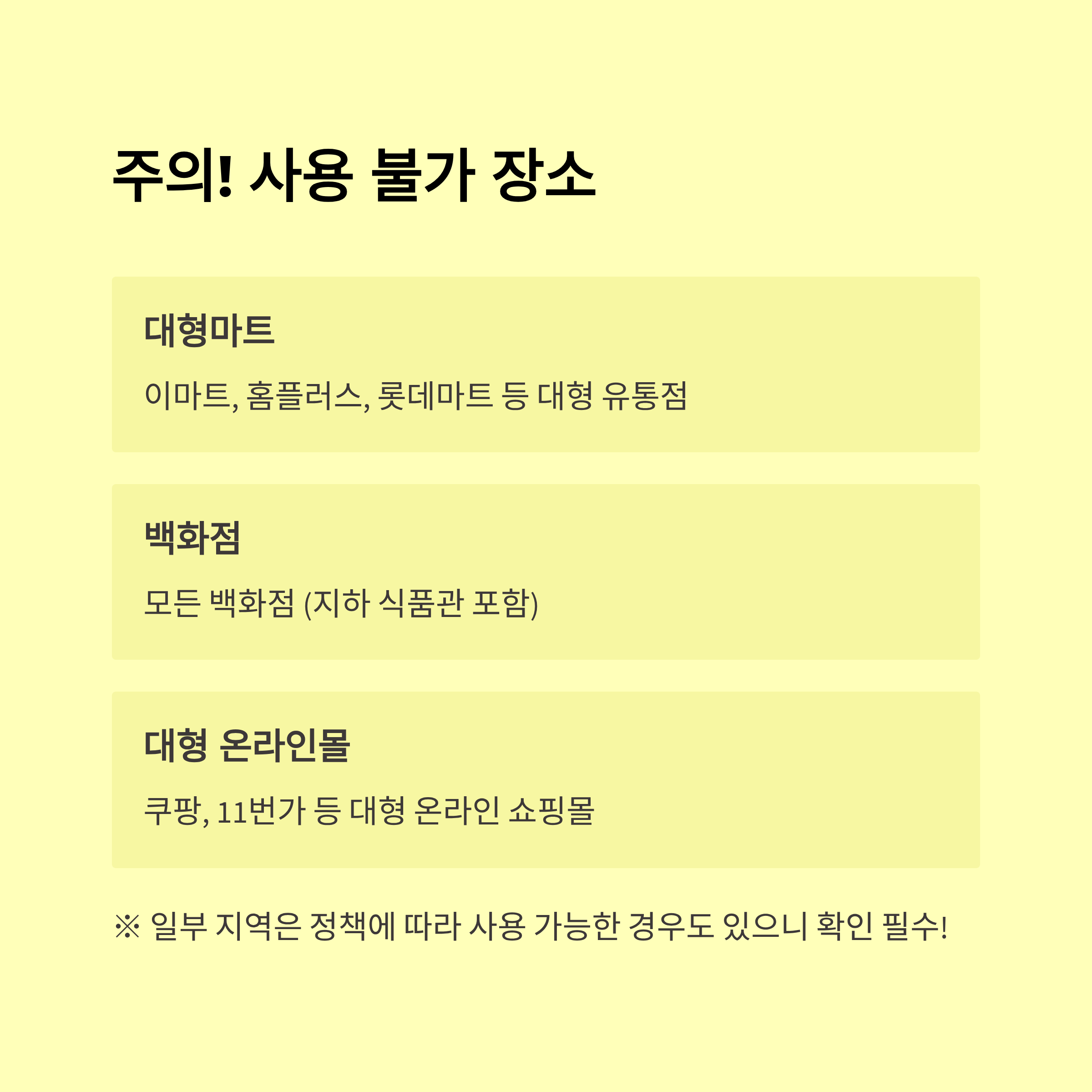 하지만 쿠팡, G마켓, 네이버쇼핑, 11번가 같은 대형 플랫폼에서는 사용할 수 없기 때문에 온라인 쇼핑 시 꼭 확인이 필요해요. 😢