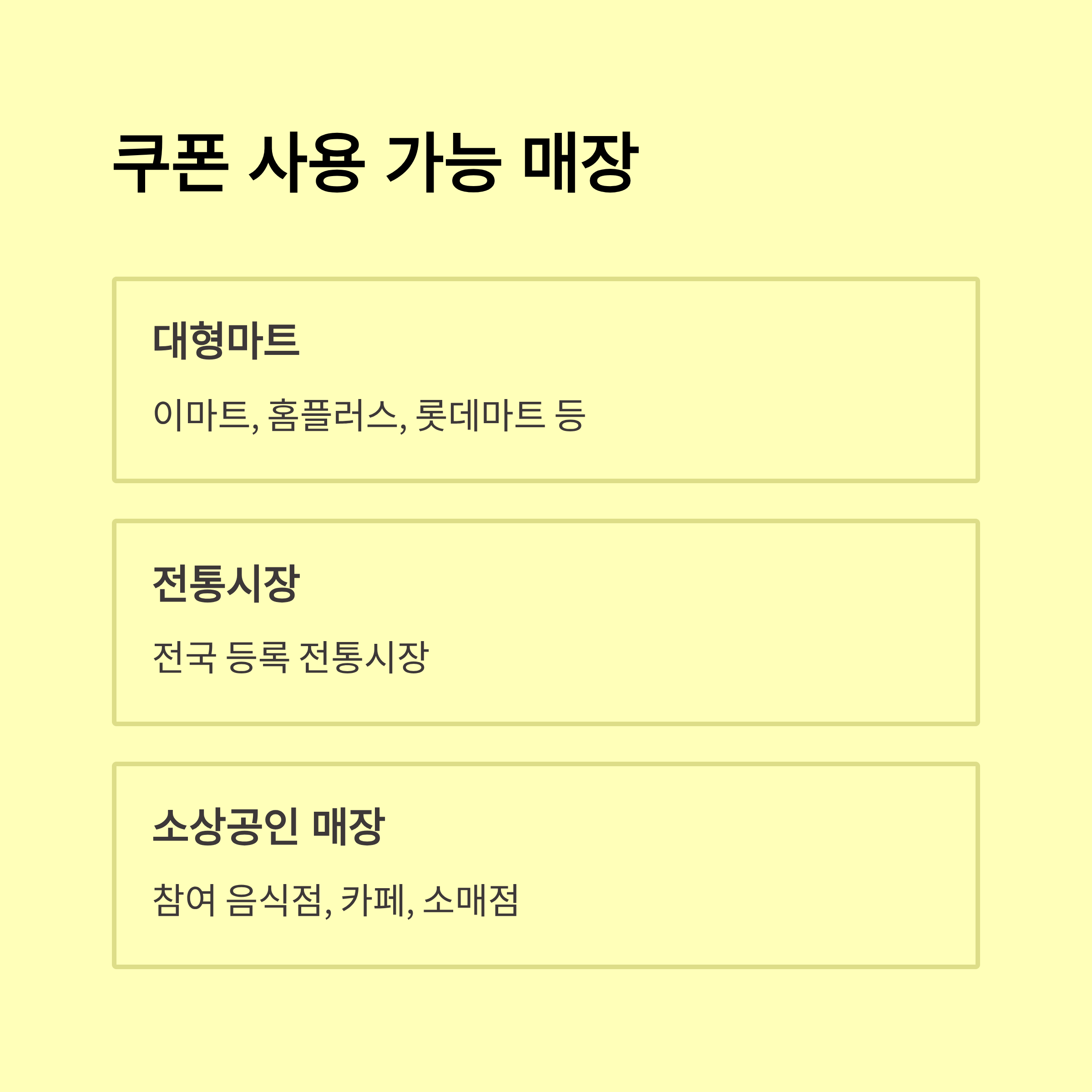 | 사용 불가 매장 | 대형마트(이마트, 홈플러스), 백화점, 스타벅스 직영점, 온라인몰(쿠팡, 11번가 등) |