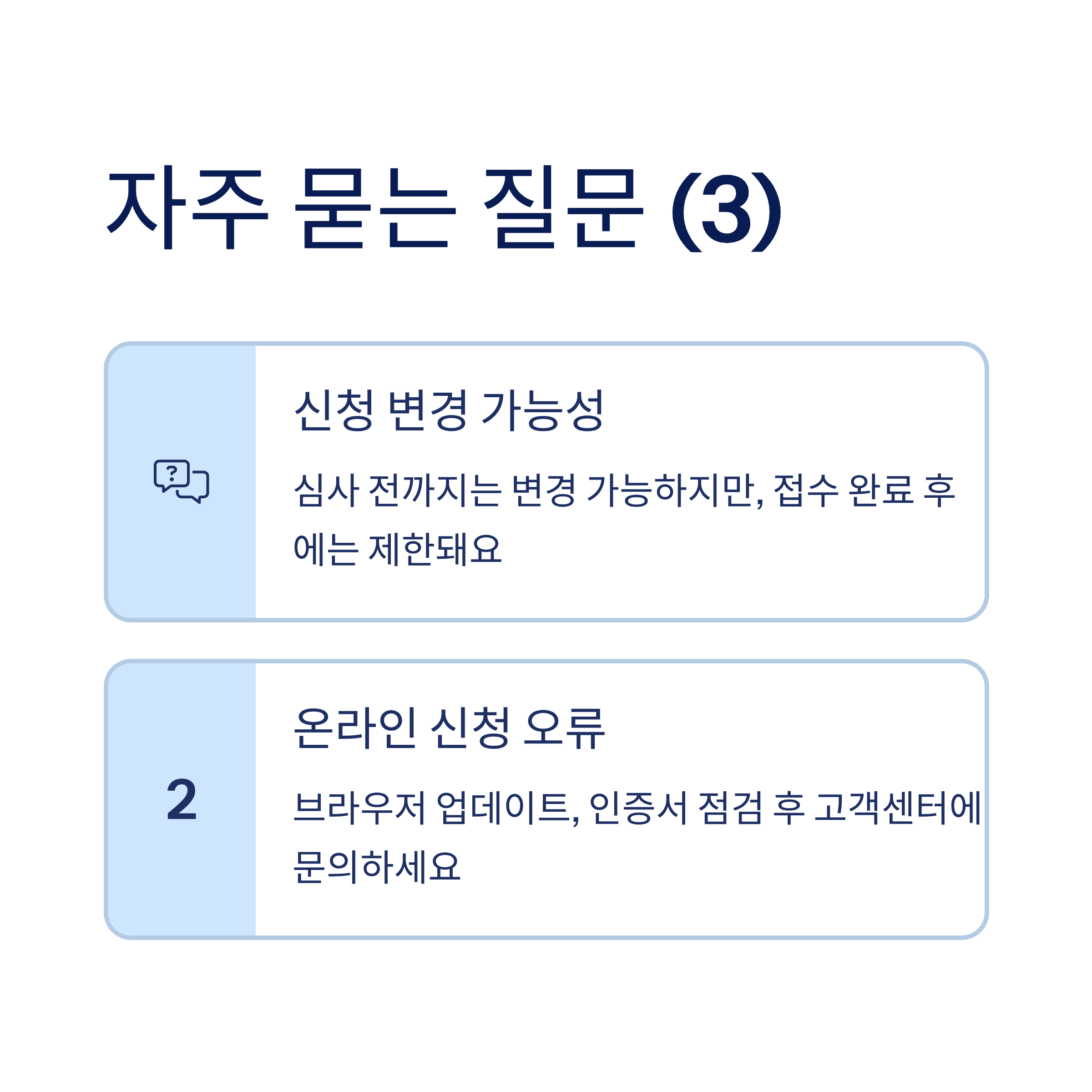 A5. 신청 후 심사 전까지는 변경 가능하지만, 접수 완료 후에는 변경이 제한돼요. 처음부터 정확하게 입력하세요.