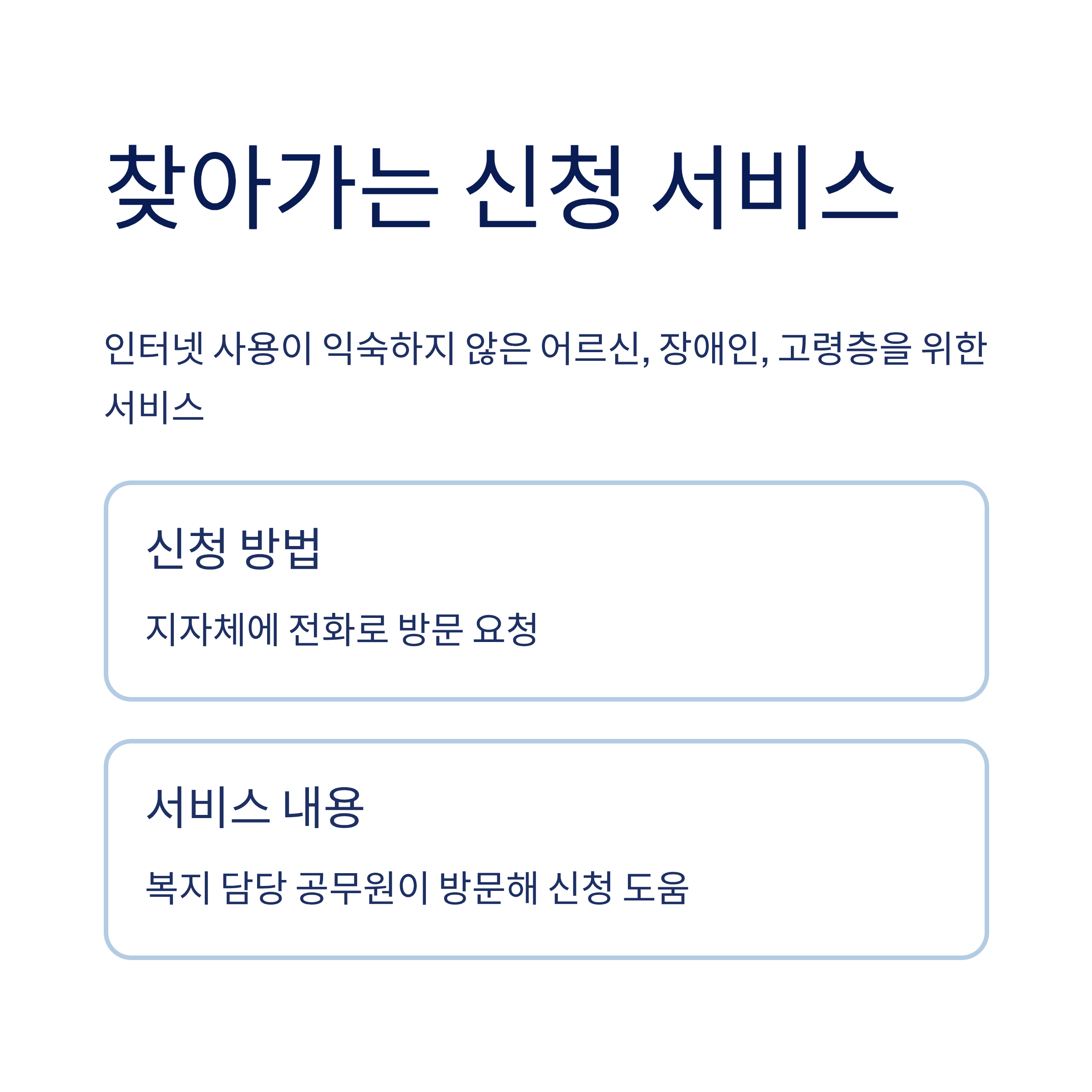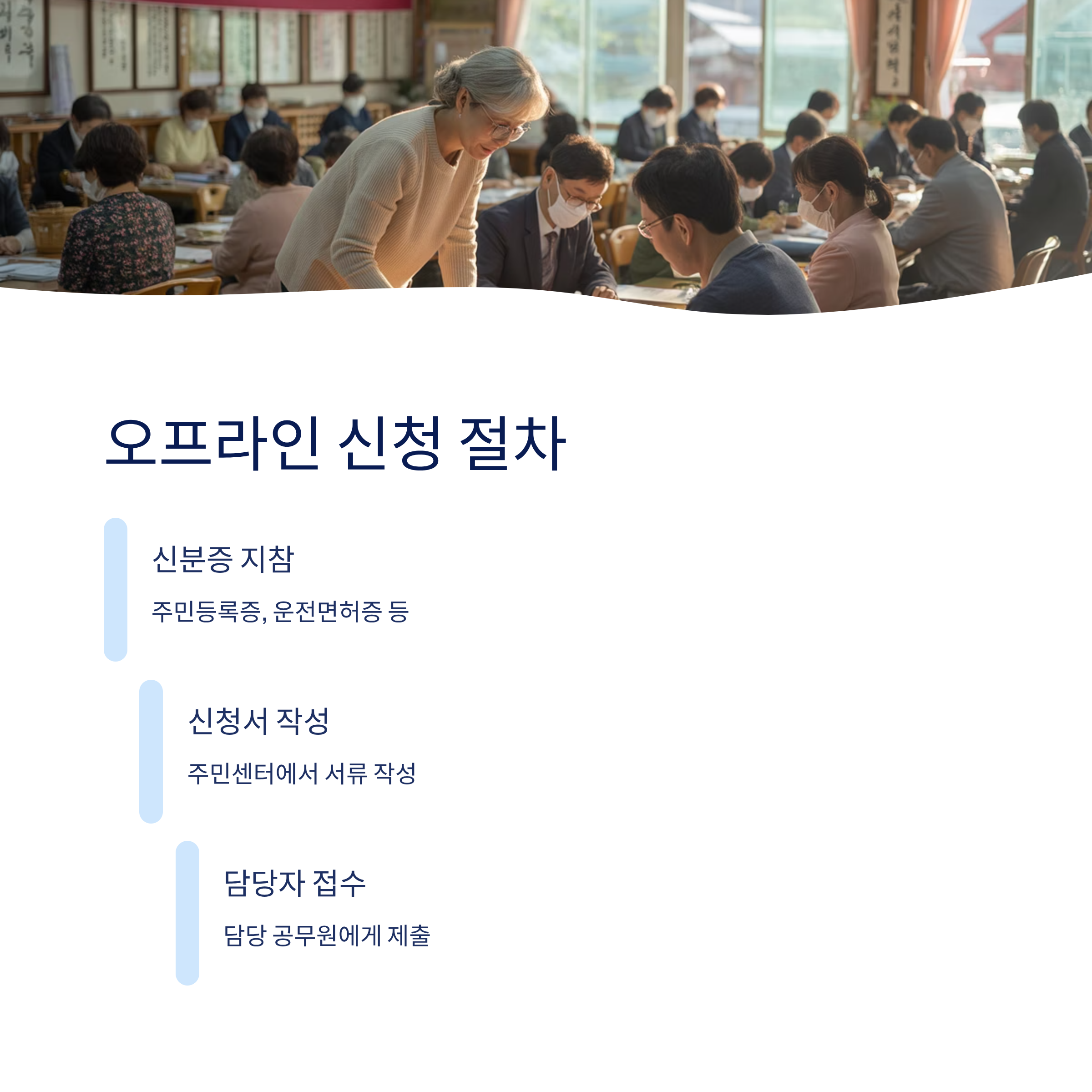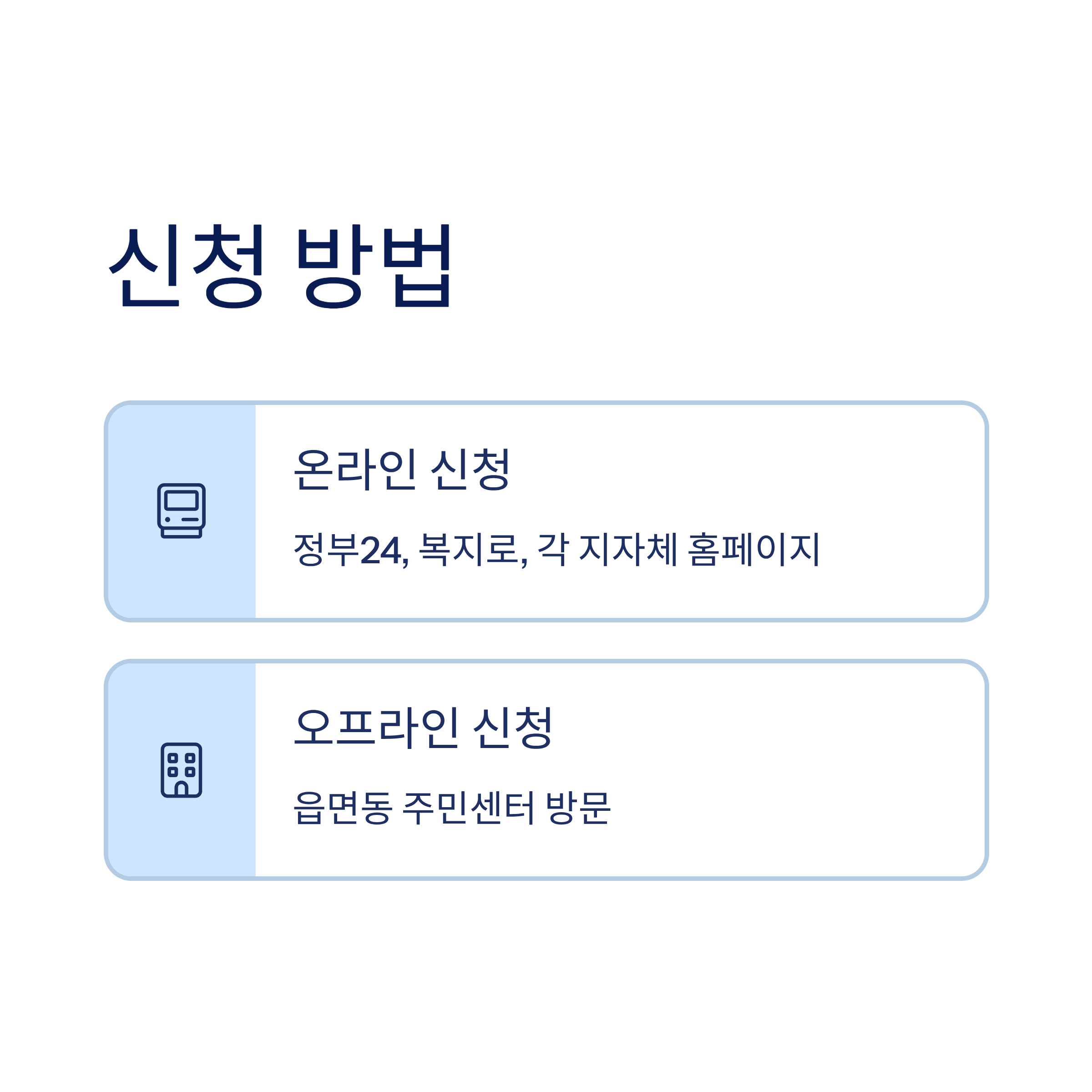 | 오프라인(읍면동 주민센터) | 신분증 지참 → 신청서 작성 → 담당자 접수 |