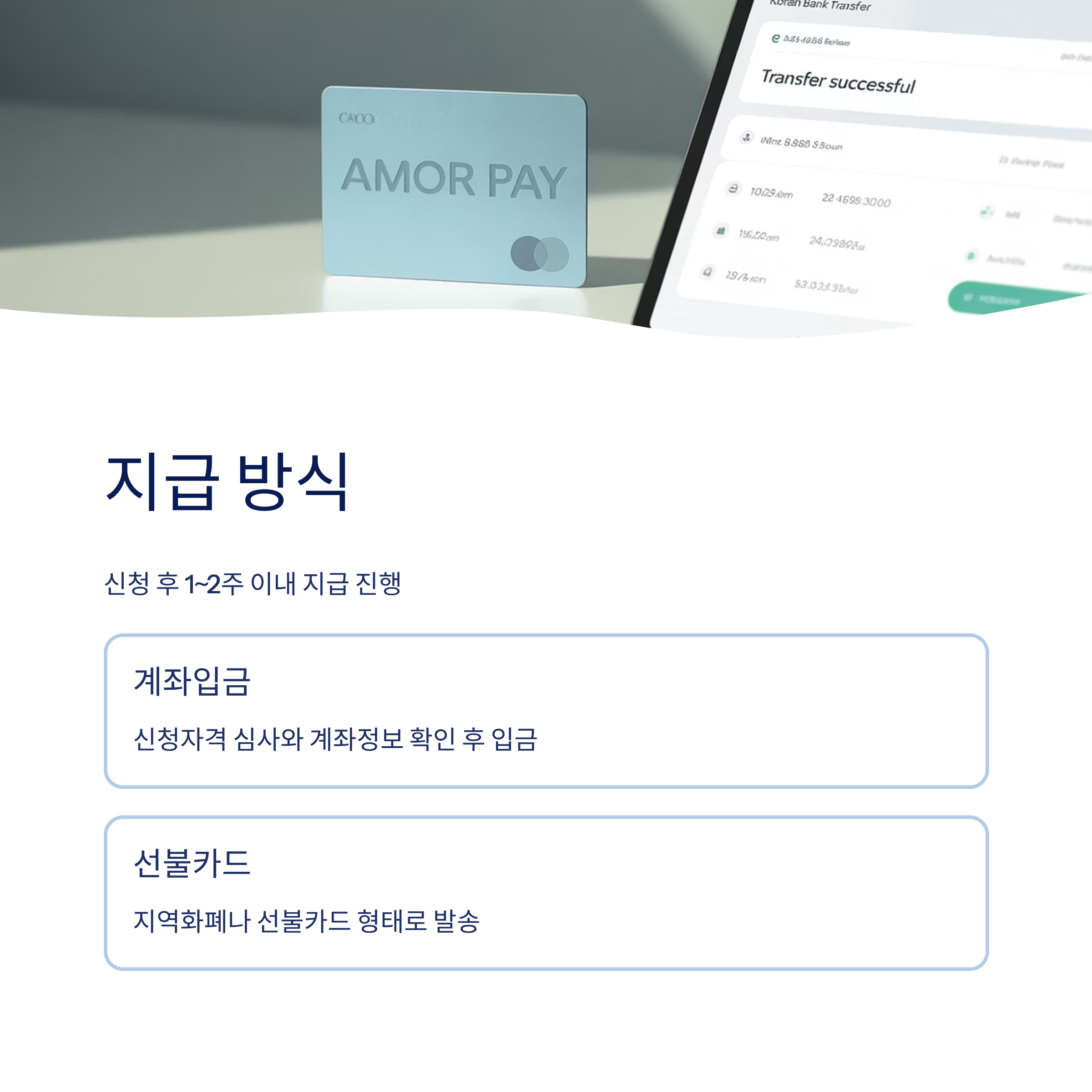 지급은 신청 후 1~2주 이내로 진행되며, 신청자격 심사와 계좌정보 확인이 끝난 뒤 바로 계좌입금 또는 선불카드 발송 방식으로 지급된답니다. 🕒