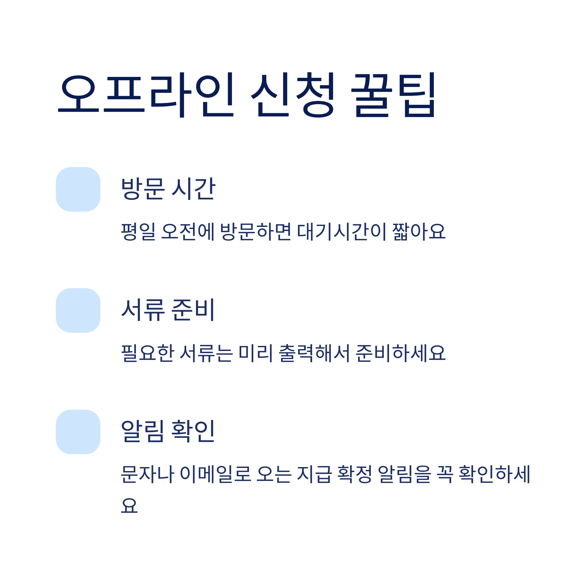 오프라인 신청의 경우 평일 오전을 노리면 대기시간이 짧고, 주민센터 직원의 안내도 훨씬 원활해요. 필요한 서류는 미리 출력해서 준비하면 실수 없이 접수할 수 있답니다.
