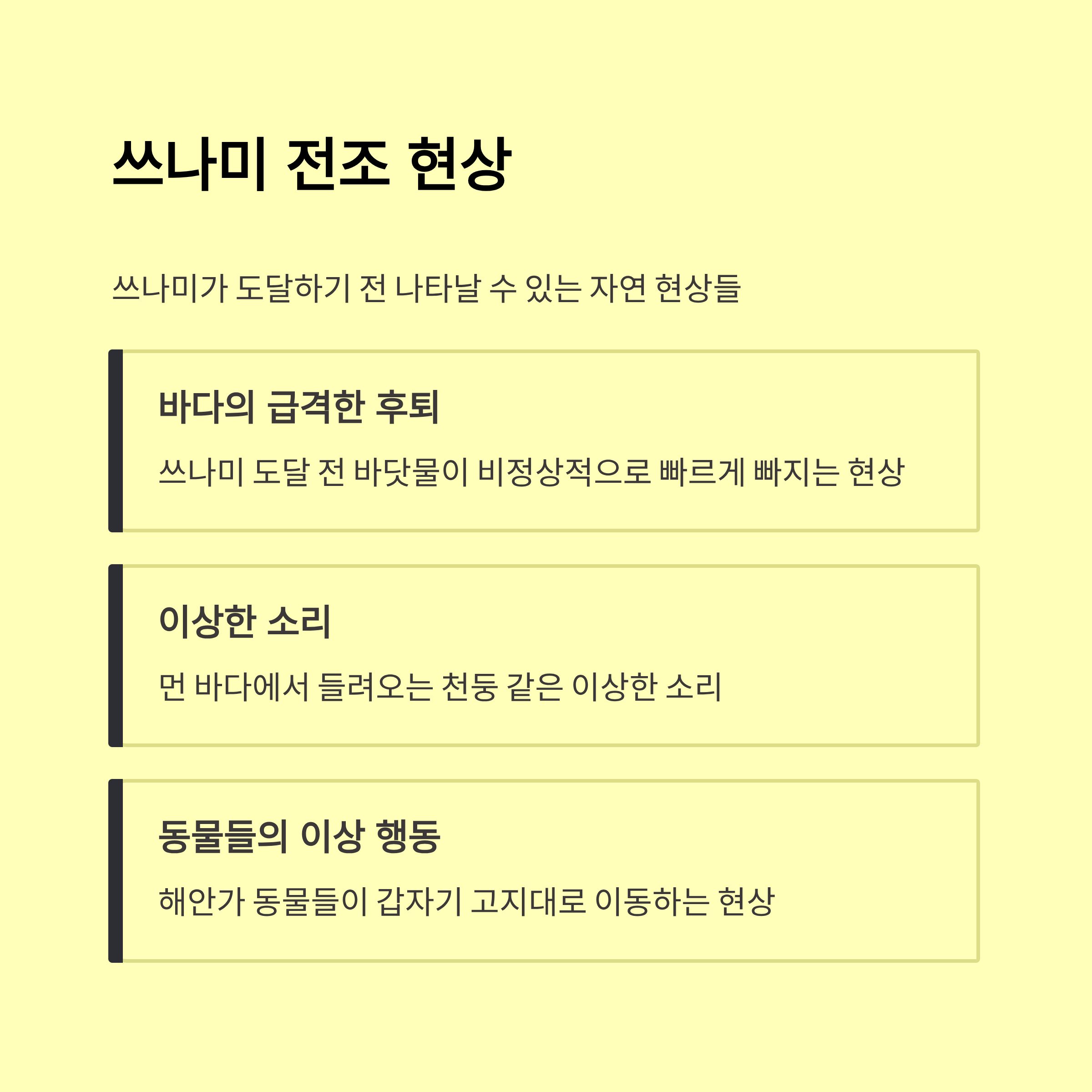 현재까지는 이상 조짐은 없지만, 바닷물이 갑자기 물러나거나 흐름이 바뀌는 현상이 감지된다면 쓰나미 전조일 수 있어요. 이럴 때는 즉시 고지대로 피하는 것이 생명을 지키는 지름길이랍니다.