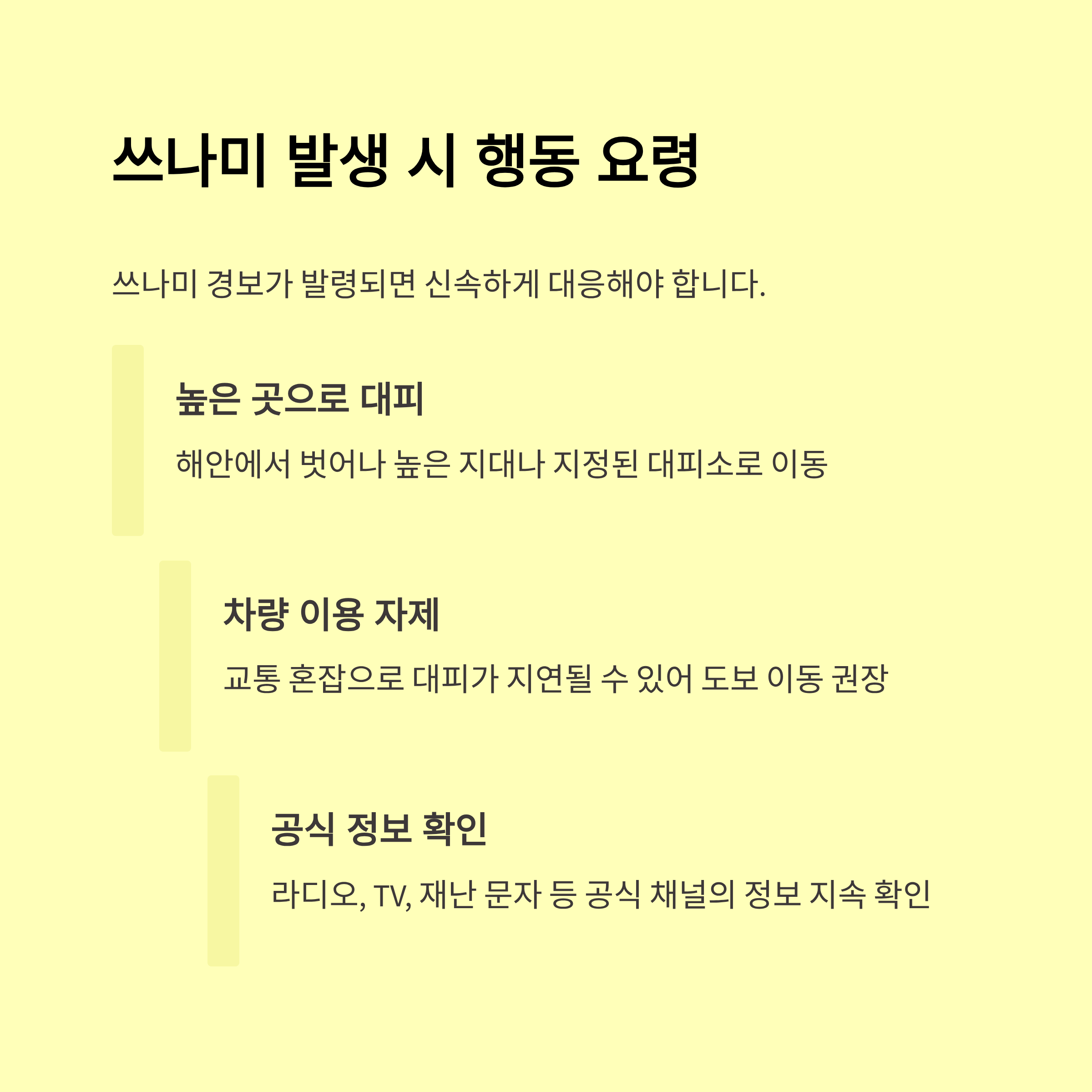 A8. 쓰나미 경보가 울리면 즉시 고지대로 대피하고, 해안가 접근을 삼가는 것이 가장 좋아요.