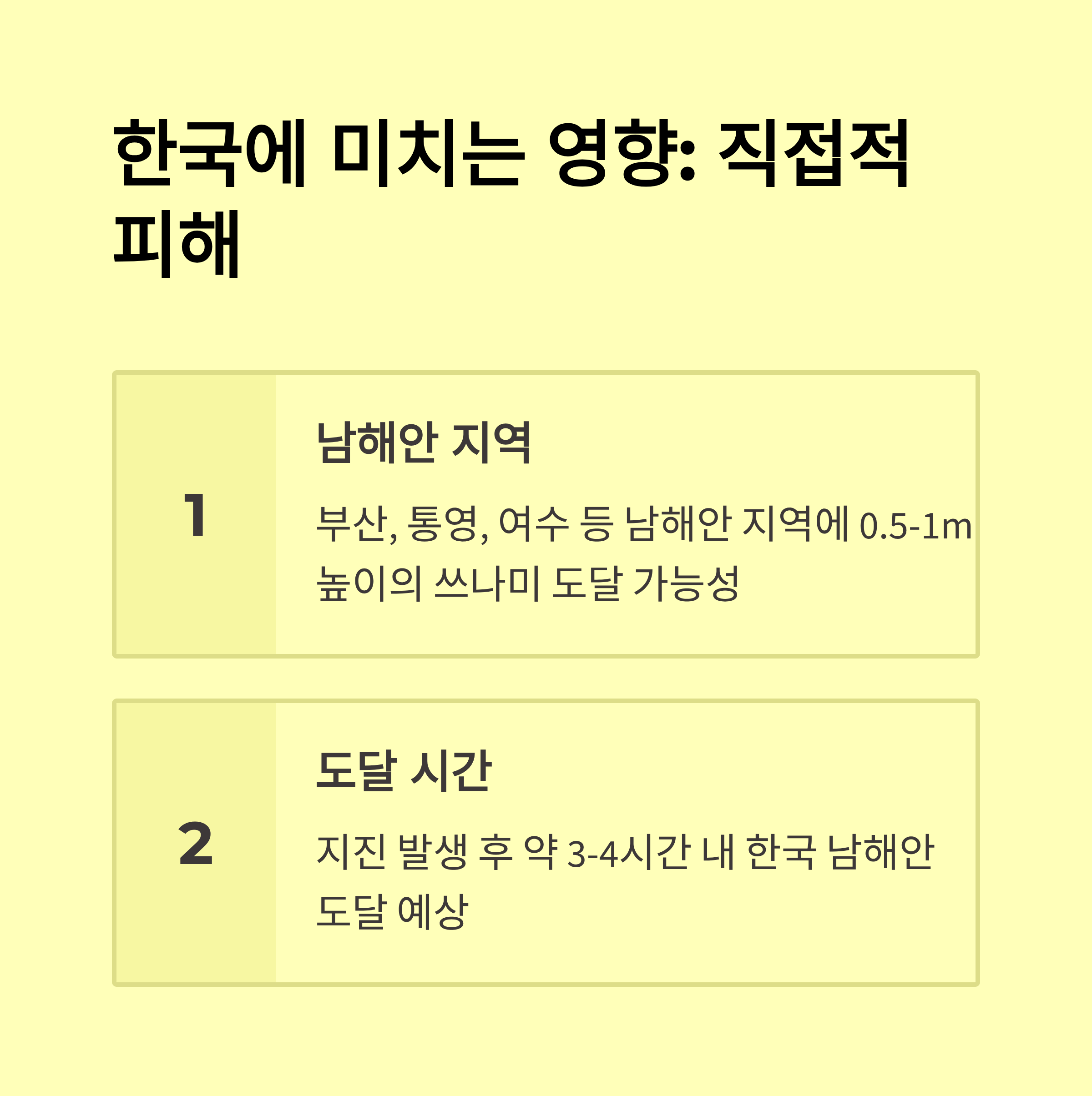 한국 기상청은 현재까지 한반도에 실질적인 피해는 없을 것으로 보고 있어요. 하지만 이번 지진이 워낙 규모가 커서, 해류를 타고 미세한 쓰나미가 남쪽 해안까지 도달할 가능성이 있다고 밝혔어요. 예측 수치는 0.3m 미만이에요.