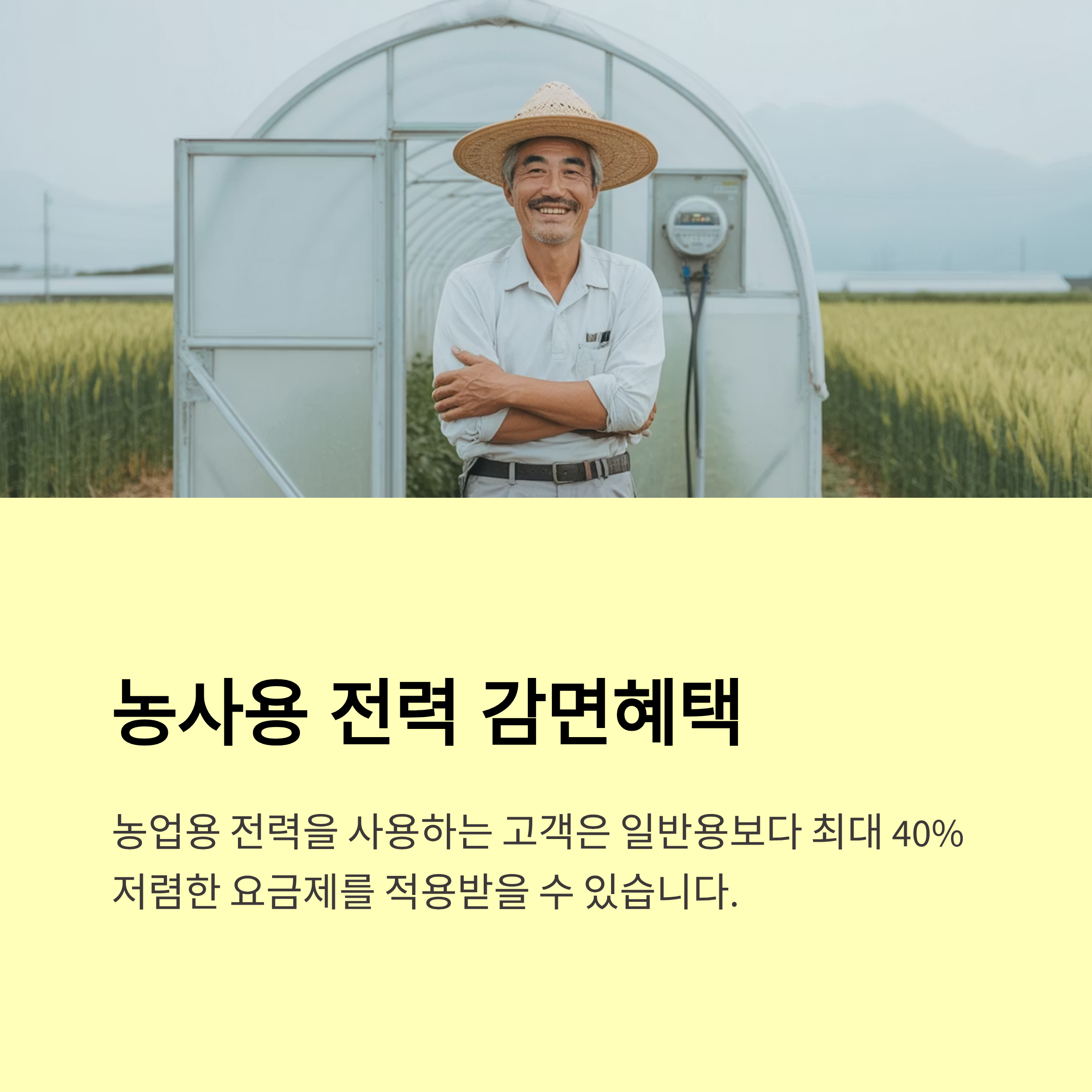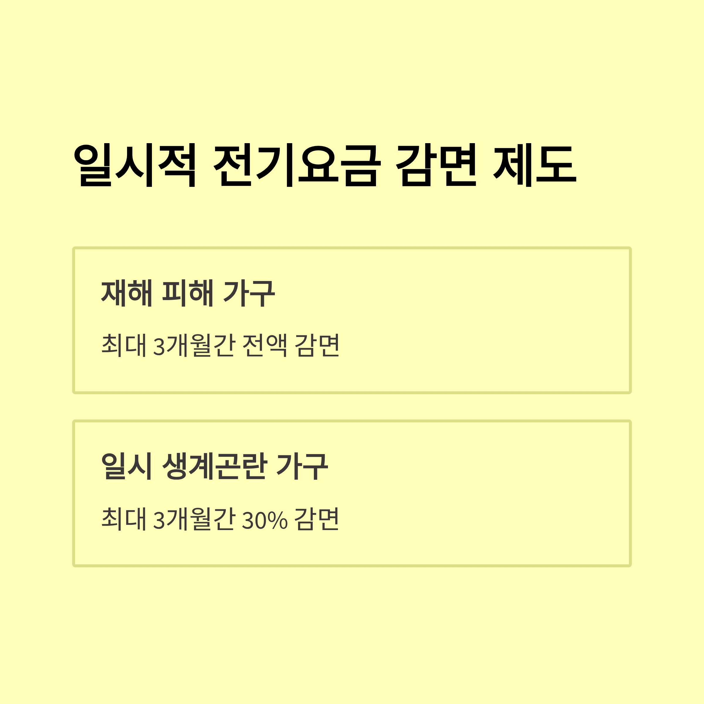 | 기초생활수급자 | 매월 기본요금 전액 면제, 전력량요금 일부 감면 |