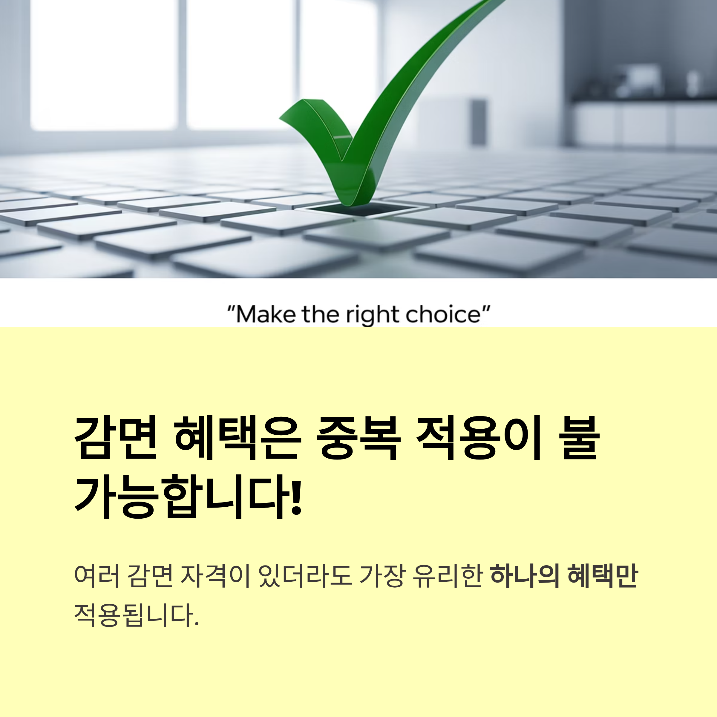 감면 대상이 중복되더라도 혜택은 가장 높은 등급 하나만 적용돼요. 예: 장애인 + 다자녀일 경우, 감면 금액이 큰 장애인 기준 적용.