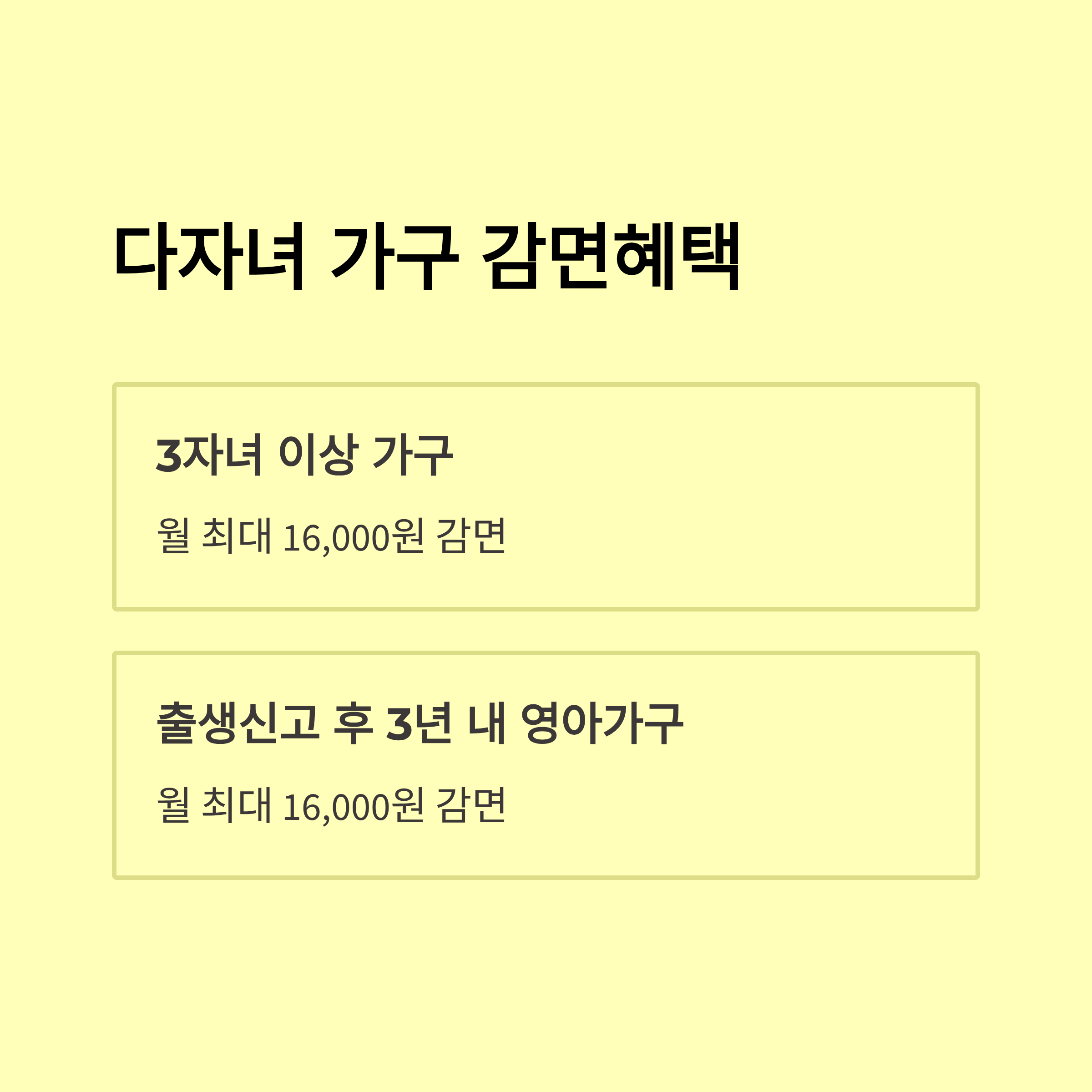 | 대가족/다자녀 | 기본요금 30~100% 감면 |
