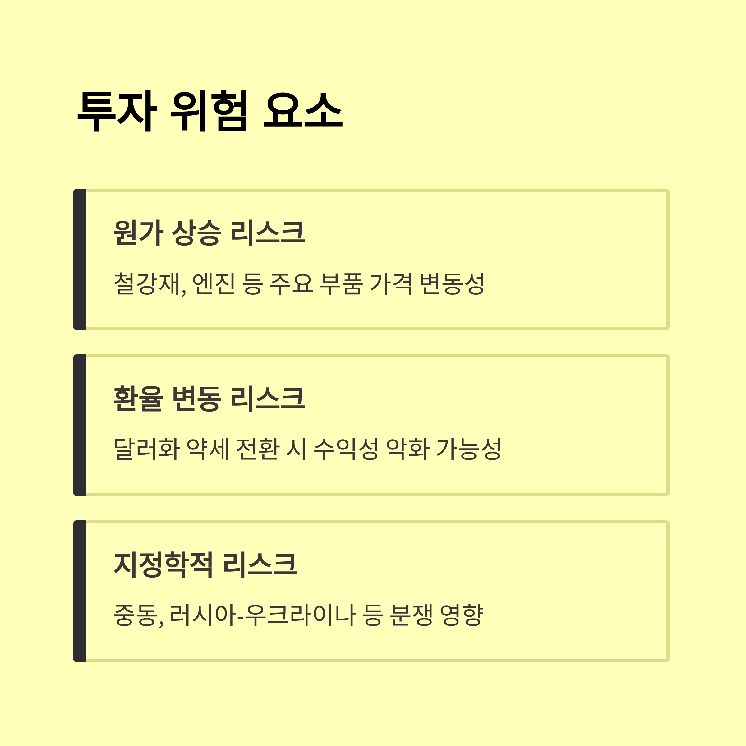 | 원자재 가격 | 철강·동 가격 상승 시 수익성 하락 |