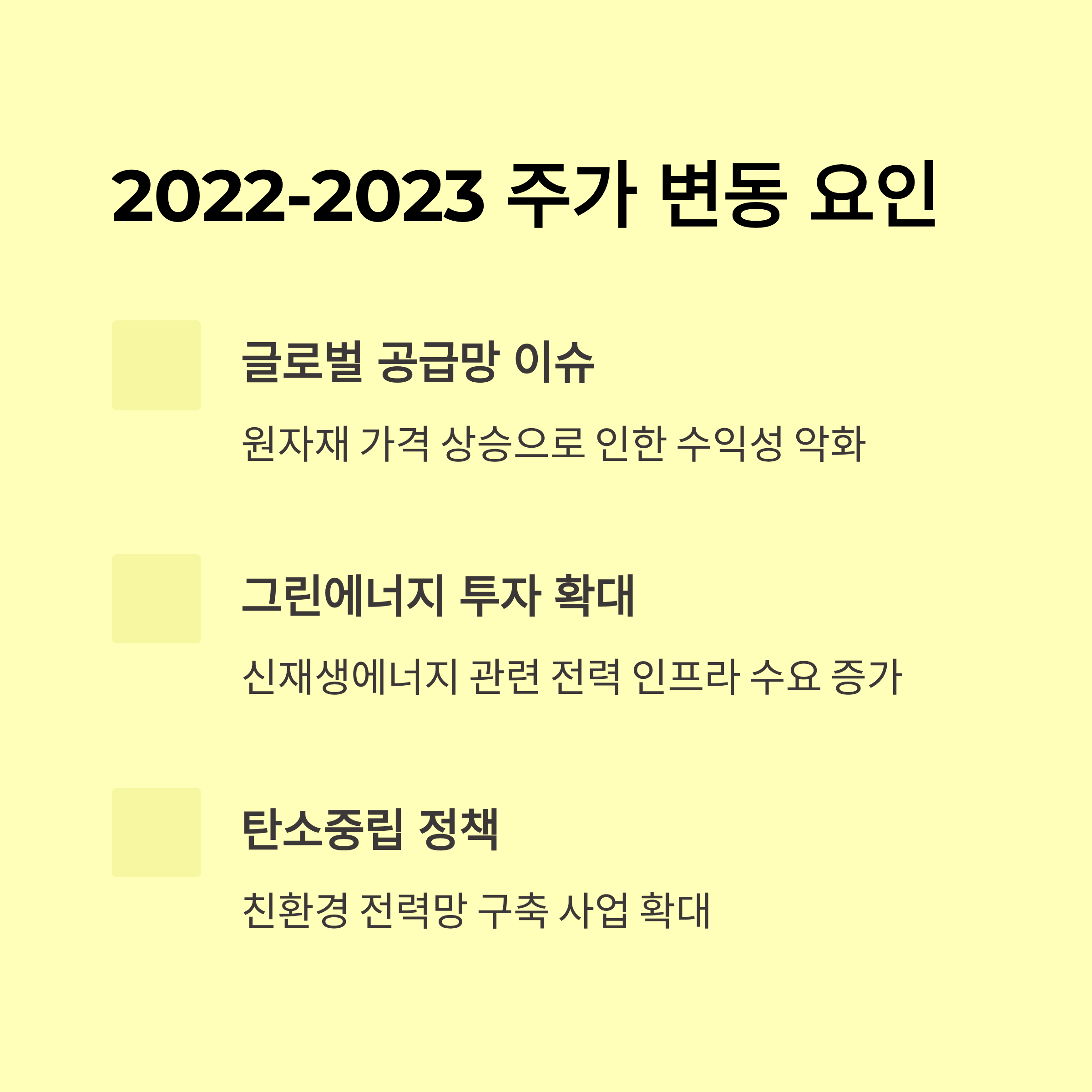 ④ 정부 정책 : 한전 40조·미국 IRA 등 메가프로젝트 직수혜, 에너지정책 변화에 따라 추가 급등·조정 모두 열려 있음.