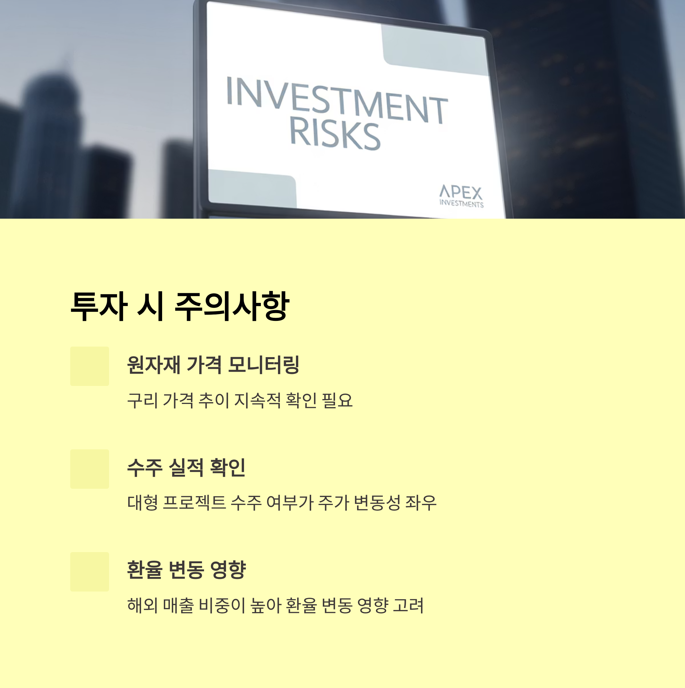 초보 투자자라면 분할 매수/수익분할, 숙련 투자자라면 뉴스·실적/수주 동향·기관수급을 실시간 체크하며 접근해야 하겠습니다.