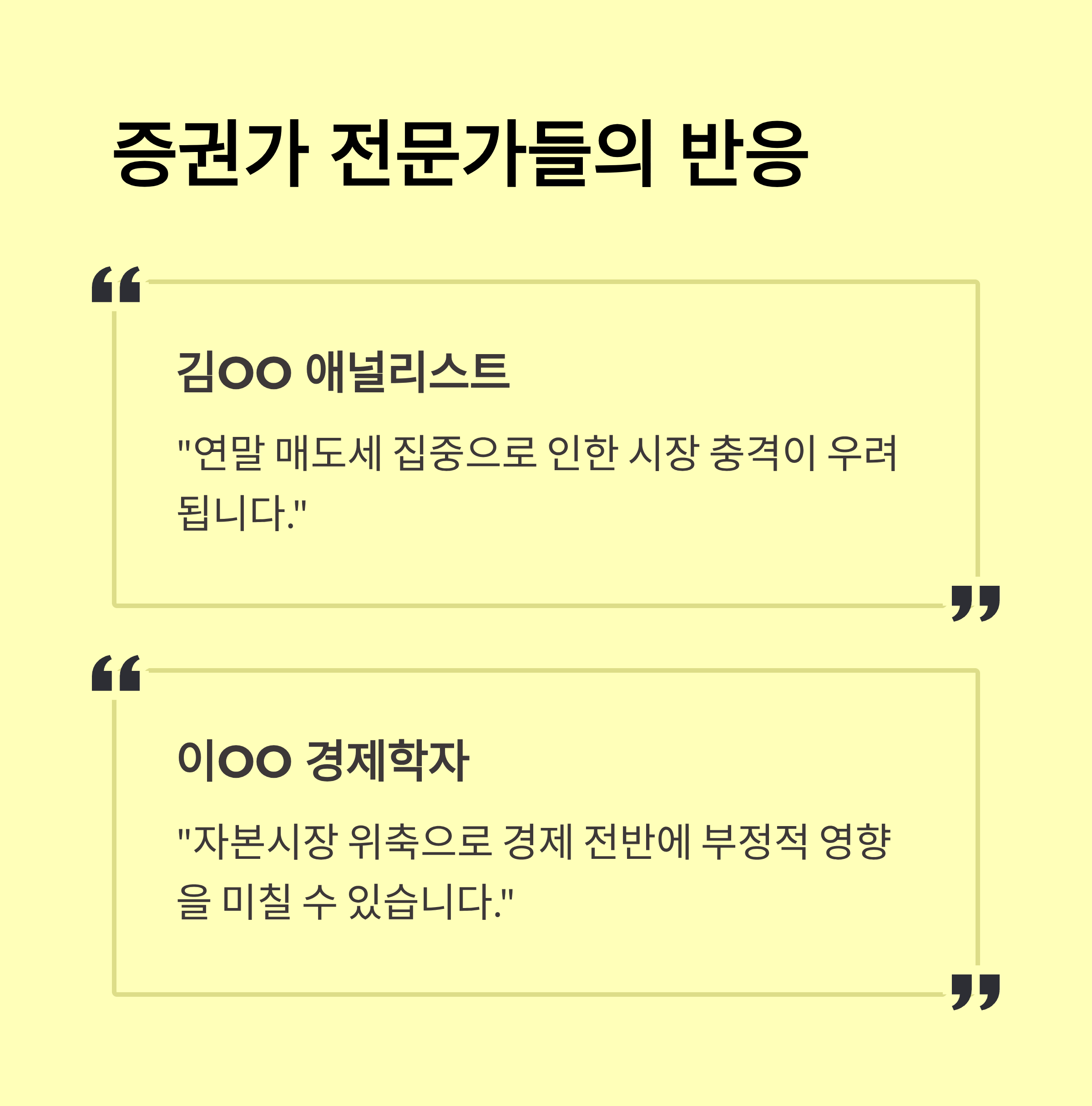 시장 전문가들은 이번 조치가 재정 정책 상 필요성이 분명하지만, 그 과정에서 투자 심리 위축, 단기 코스피 변동성 확대는 불가피한 측면이라고 봅니다. 일부는 “강화된 대주주 기준이 장기 투자 저해 요인”이라고 분석하는 반면, “과세 형평성 강화가 시장의 신뢰를 높일 것”이라는 낙관론도 존재합니다. 투자자들은 단기 부담 증가와 세금 회피 우려에 따른 매도 압박 사이에서 신중한 접근과 분할 매수·매도로 대응하는 모습입니다. 특히 세법 준수 강화에 따라 절세 전략 및 가족 간 증여 방식도 복잡해지고 있어 투자자 교육과 컨설팅이 중요해지고 있습니다.