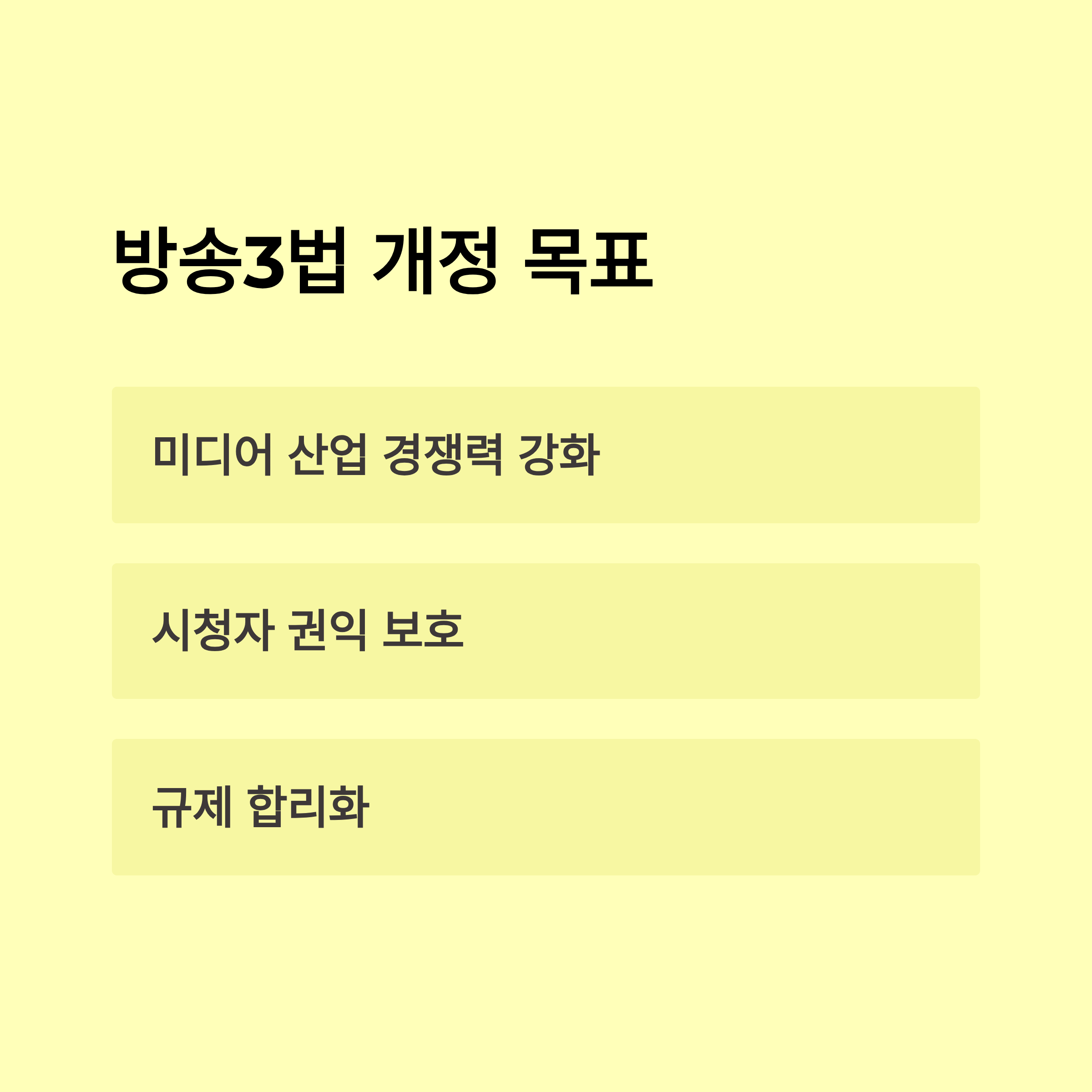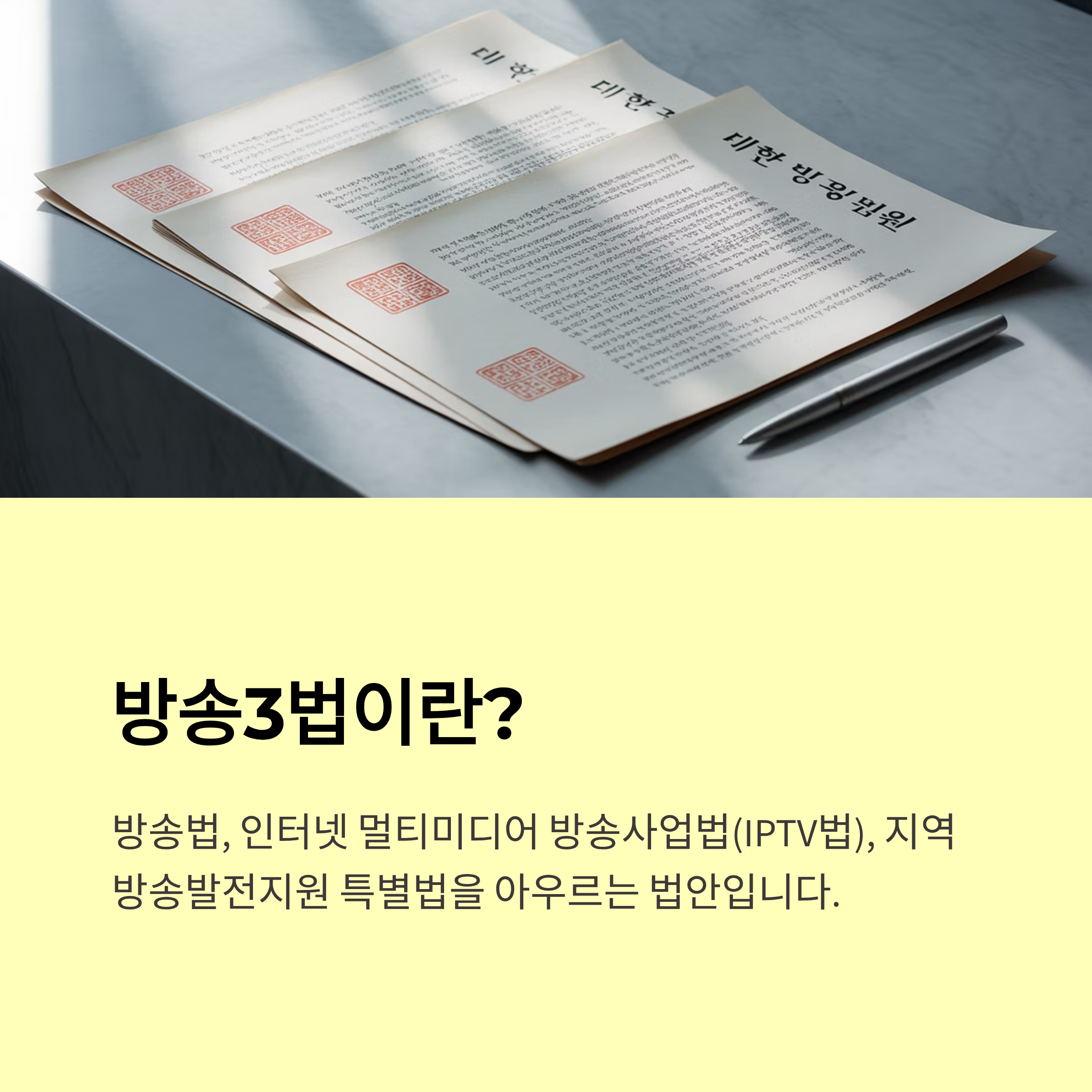 '방송3법'이란 각기 방송법, 방송문화진흥회법, 한국교육방송공사법 개정안을 묶어 부르는 용어입니다.