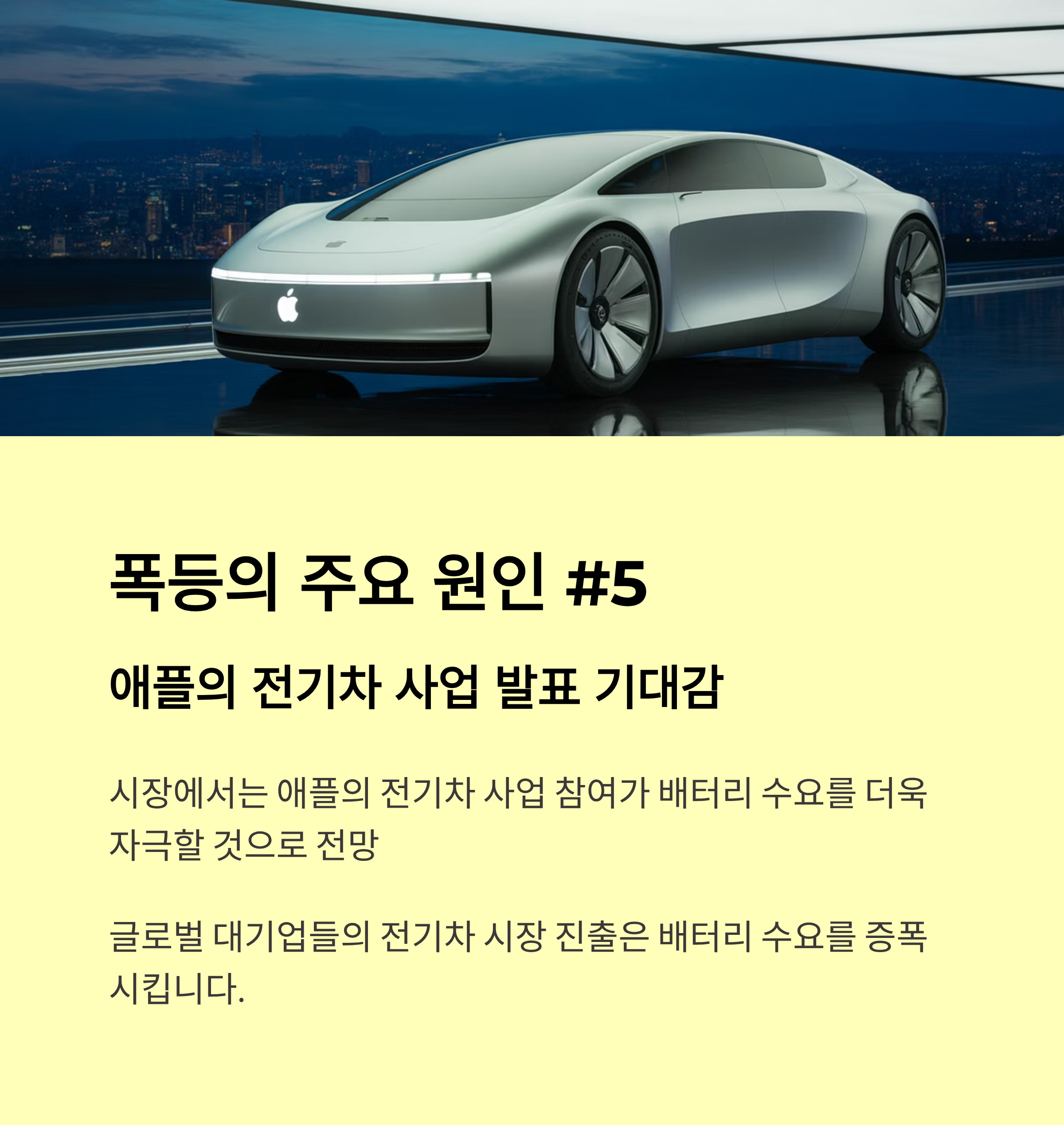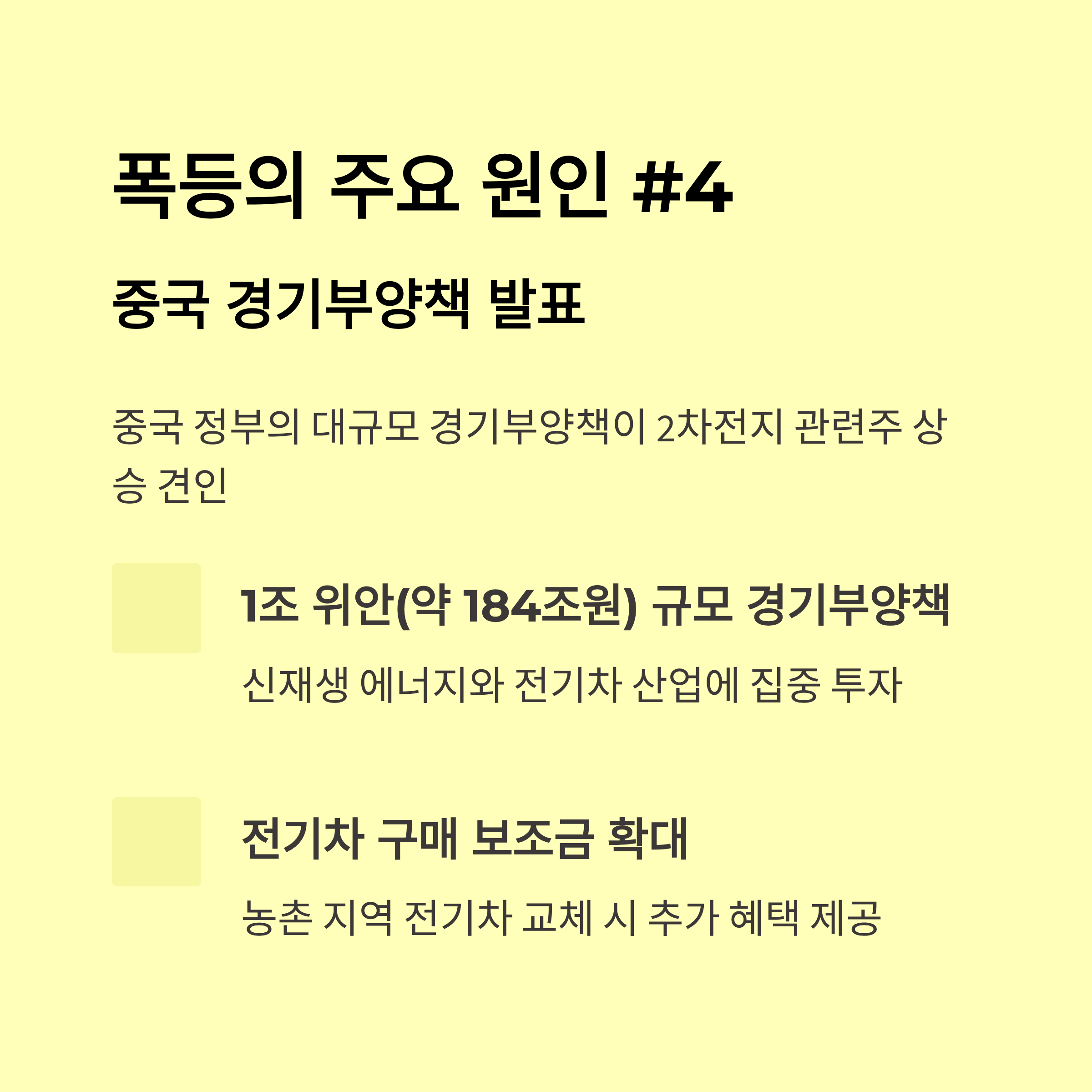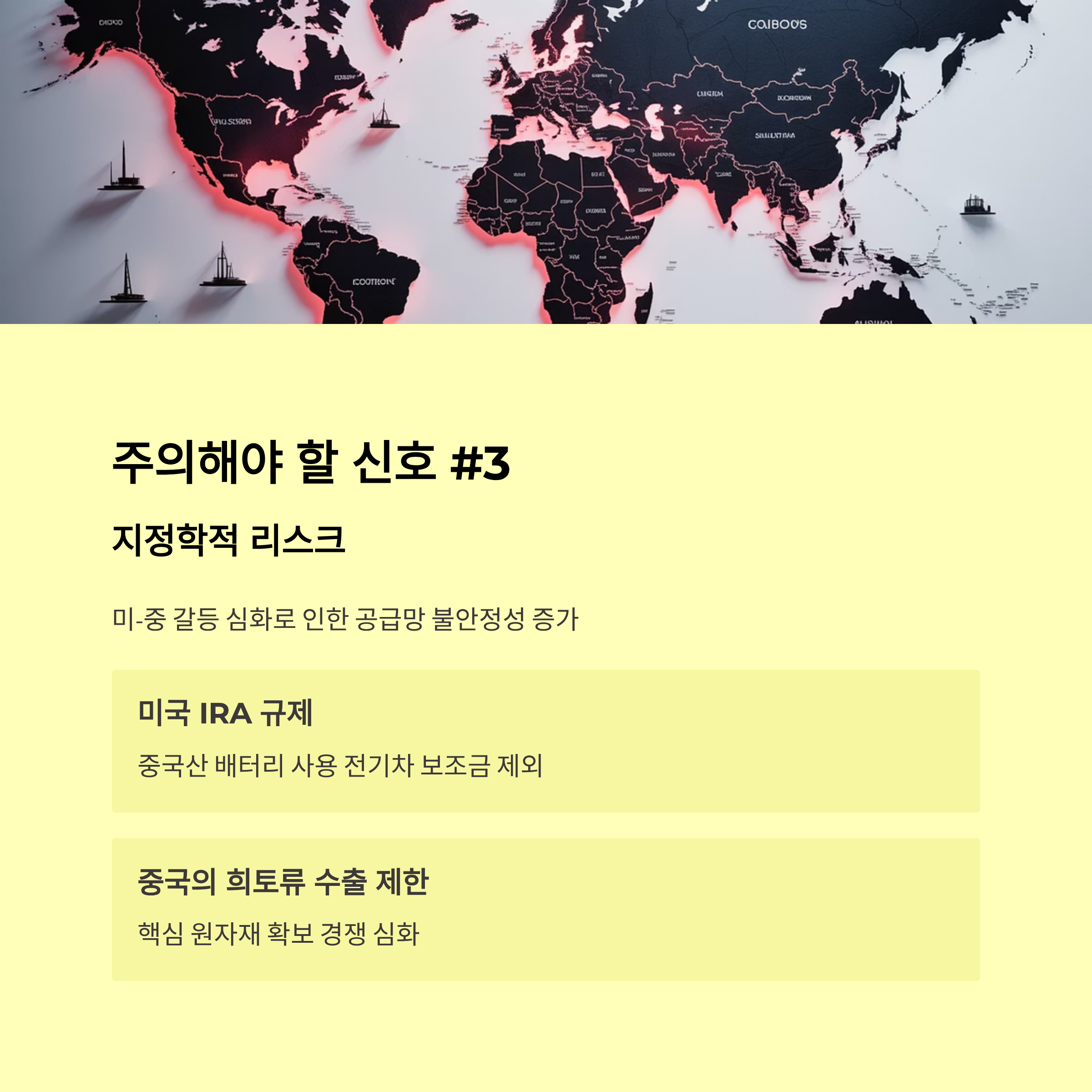 - 리튬 가격 바닥→반등: 중국 리튬 대기업 공급 조절로, 핵심 원재료 가격 반등 및 기업 수익성 기대 심리↑