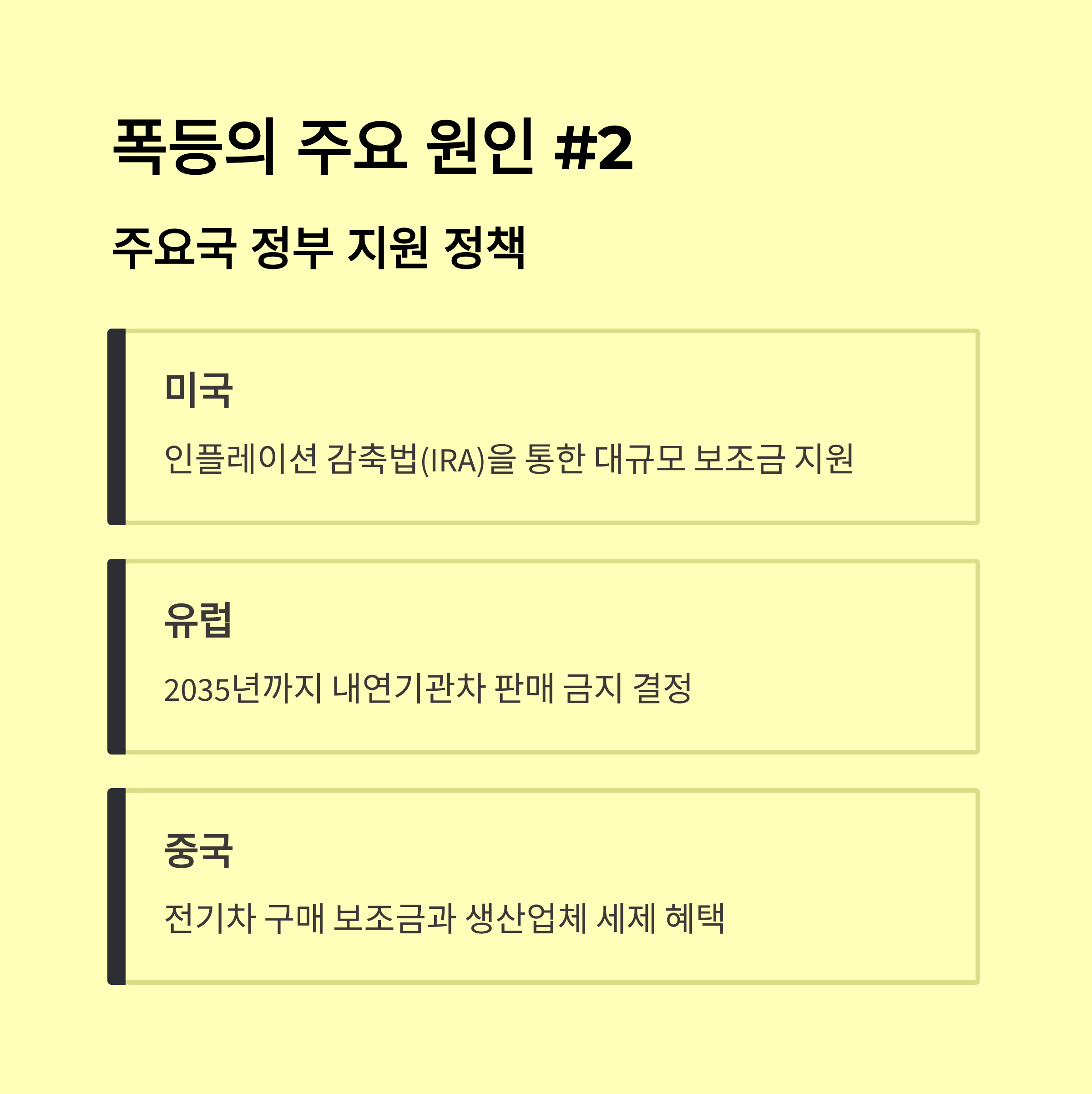 - 전기차 산업: 미국·EU·중국 규제/보조금 정책별 급등락 반복, EV수요 VS 배터리공급 변수 혼재