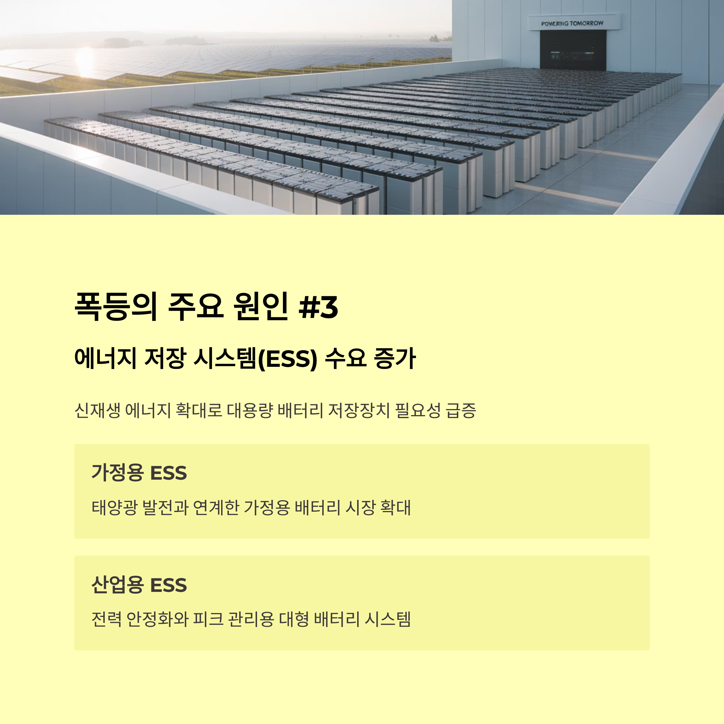 A. 단기 악재 해소(감산, 리튬, 업황), ESS 폭발적 성장 기대감, 국내외 유동성 유입 등이 복합적으로 작용했습니다.