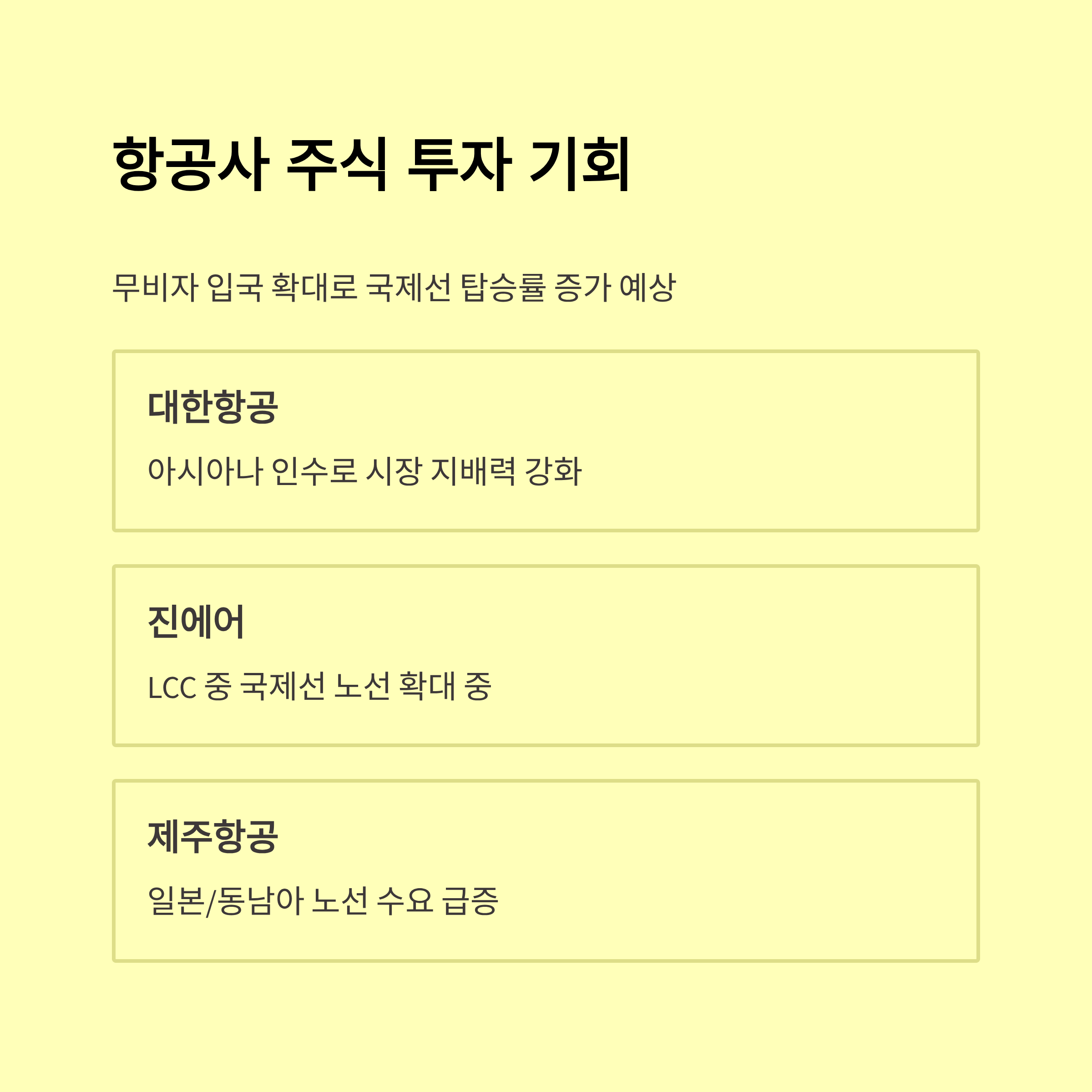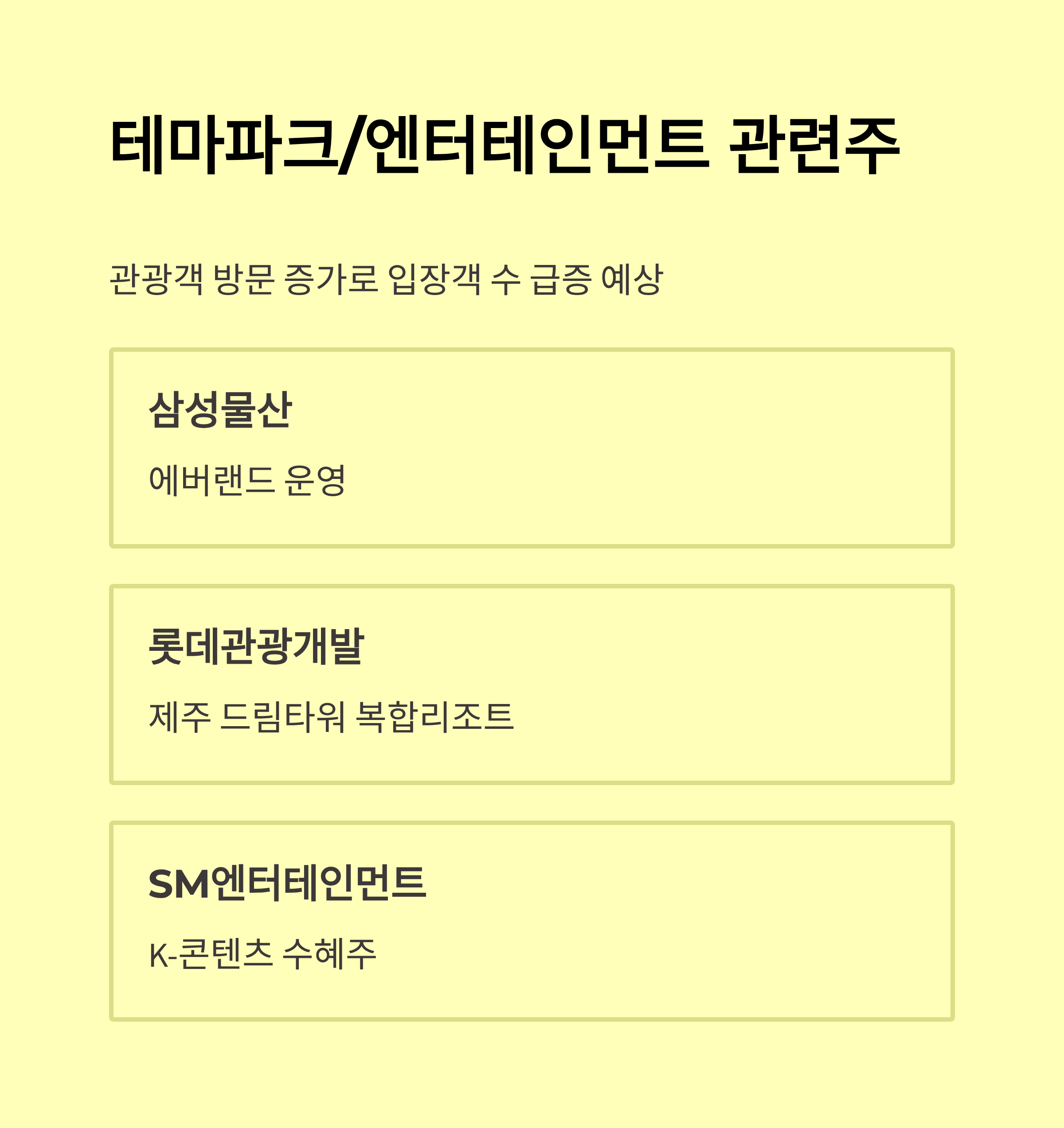 - 관련 업종 추가 파급 – 항공(대한항공, 제주항공, 에어부산) – 유통(현대백화점, 이마트, 아모레G 등) – 식음료·엔터(삼양식품, CJENM, 에스엠 등 K-콘텐츠)