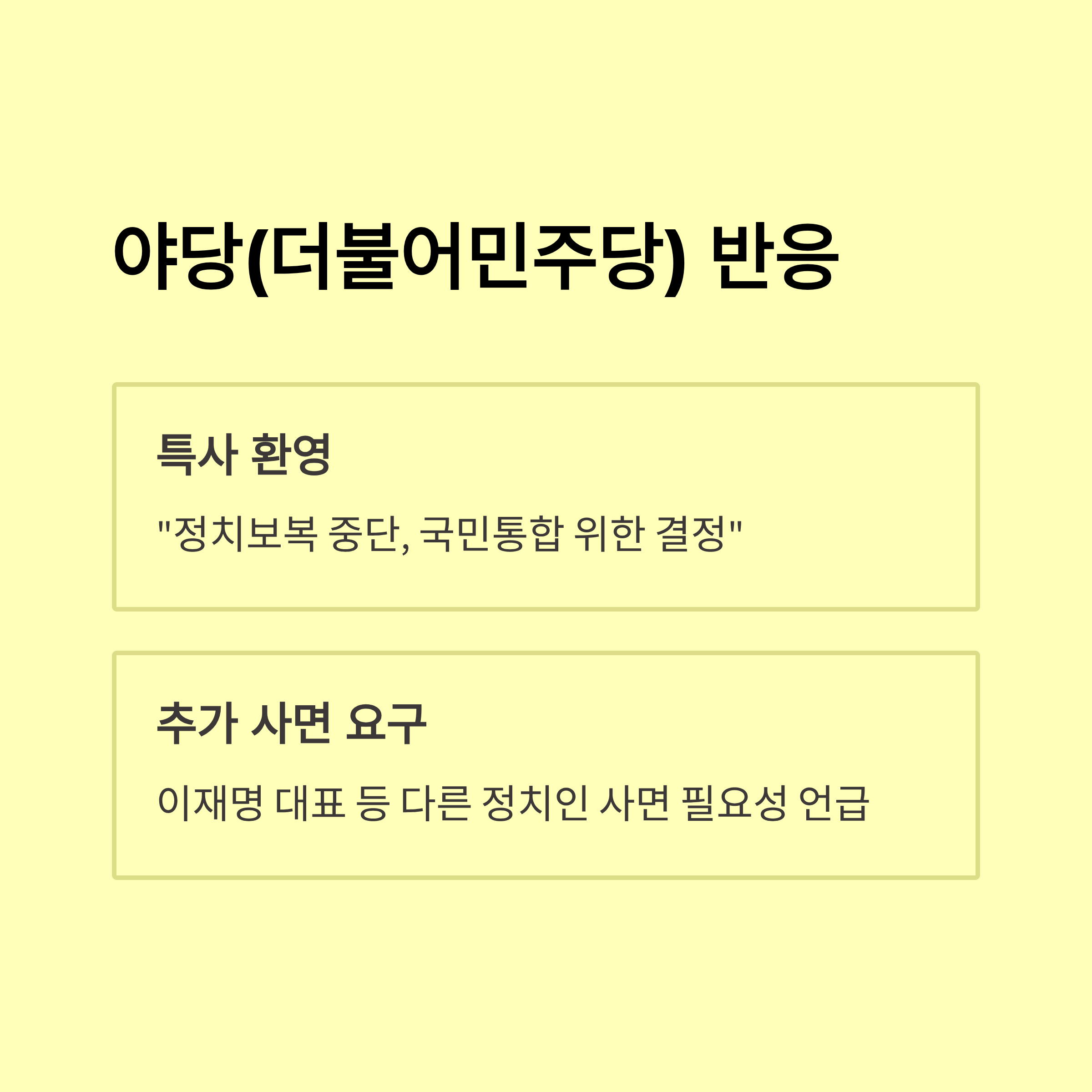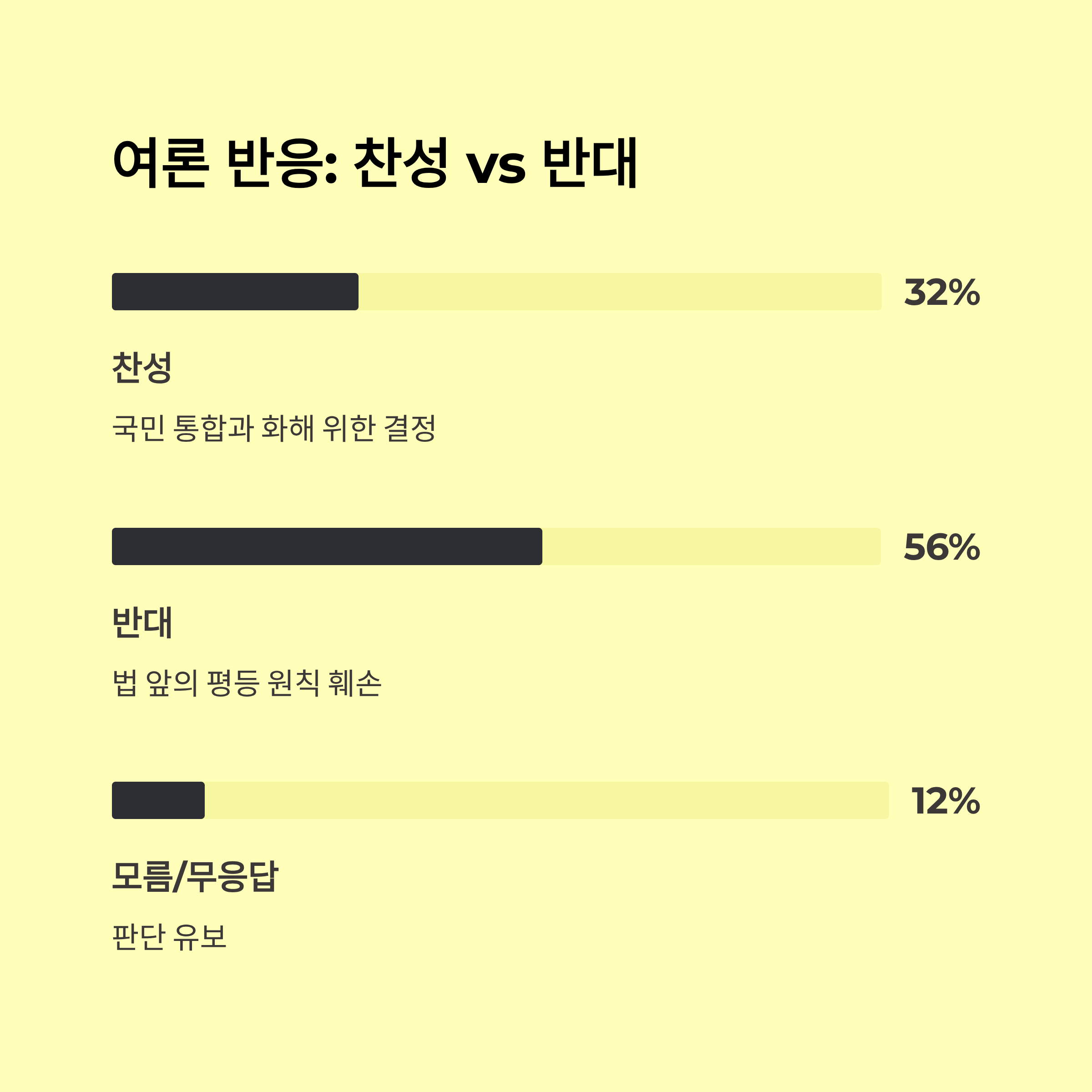 - 반면 정부 및 여당은 “사회 통합과 국민 화합을 위한 불가피한 선택”이라며 사면 이유와 절차의 정당성을 강조하고 있습니다.
