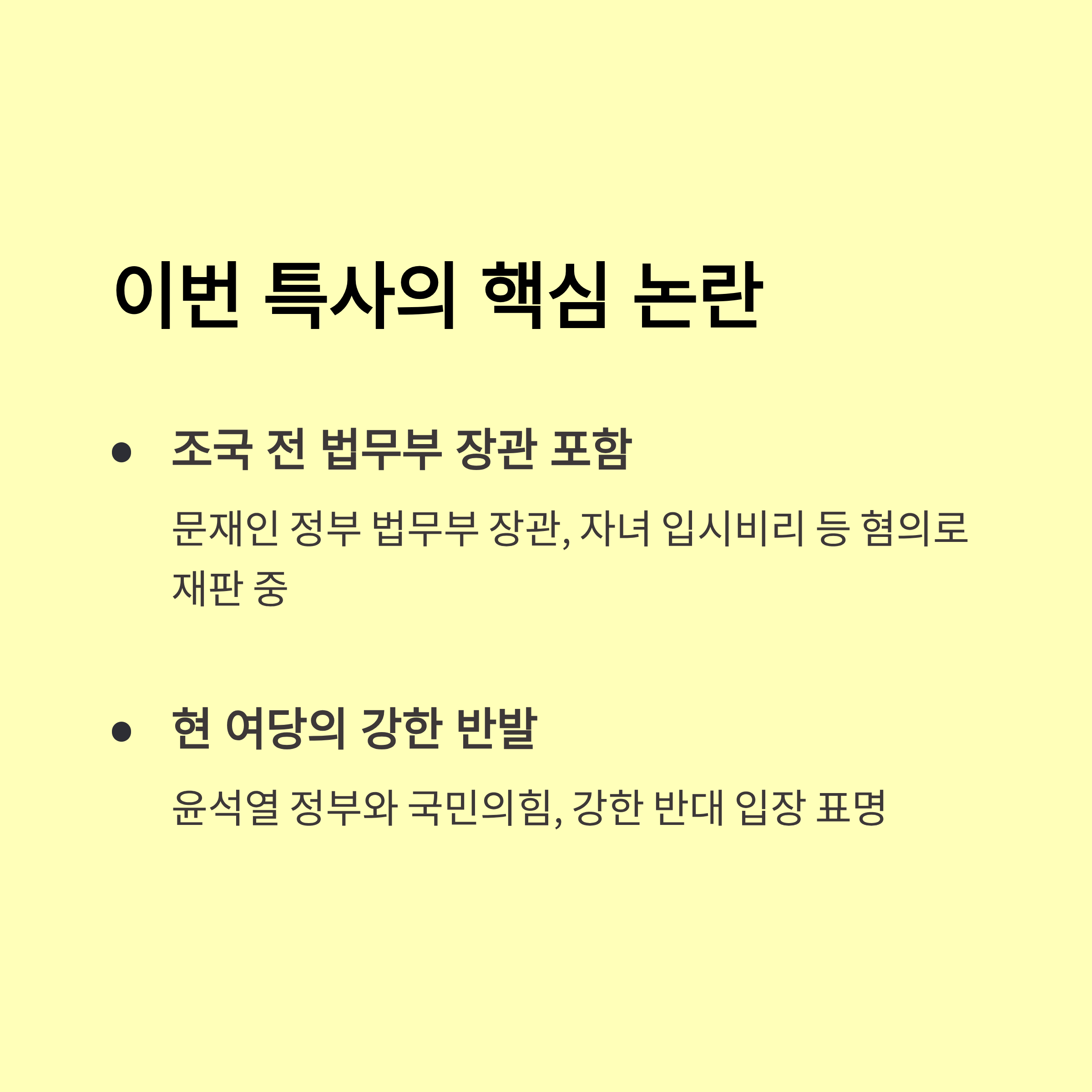 - 조국 전 대표 및 가족, 최강욱 전 의원 등 민주당·진보 진영 인사들의 포함으로 정치권과 촛불, 시민단체 사이에서 격렬한 찬반 논쟁이 일어나고 있습니다.
