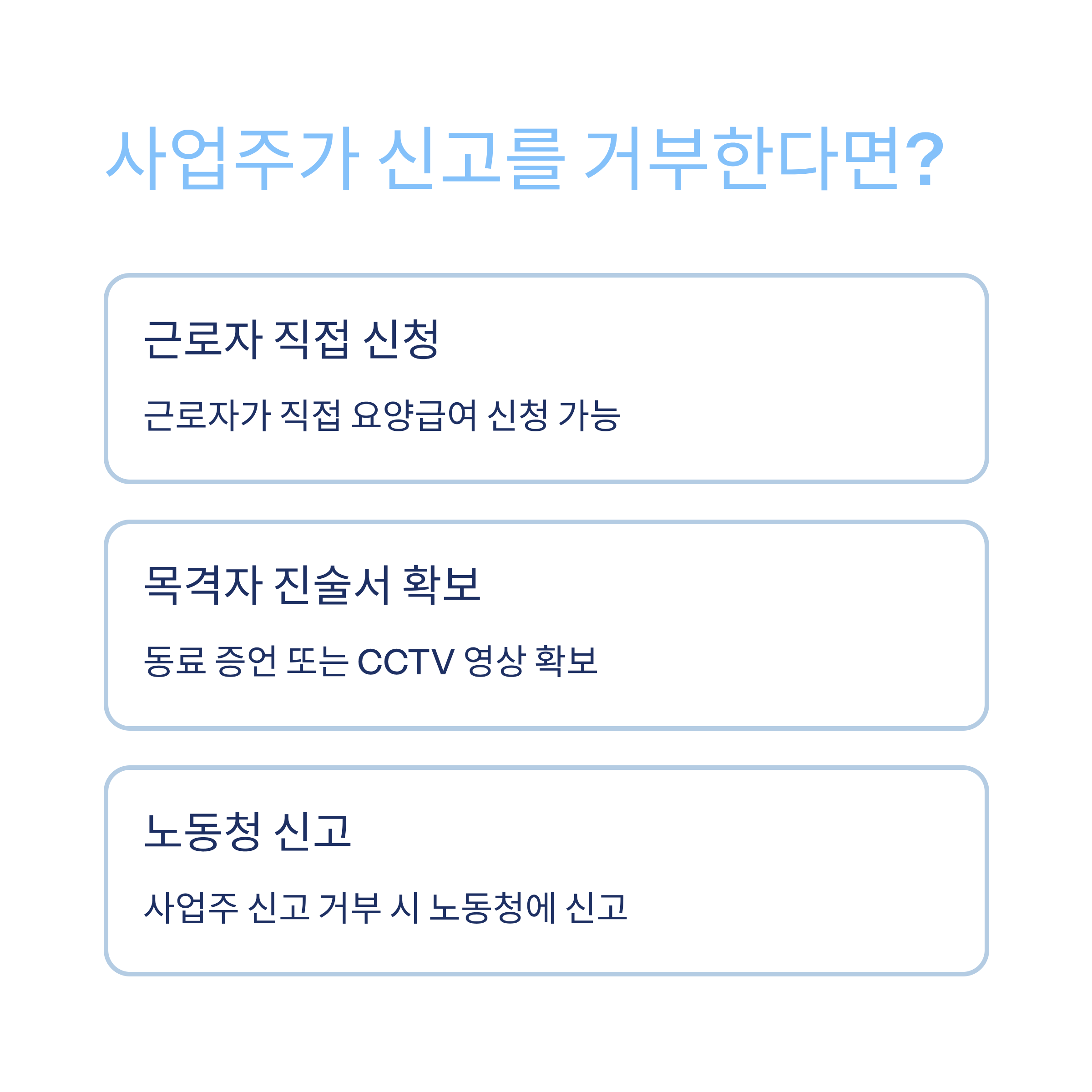만약 사업주가 신고를 거부하면, 근로자가 직접 신고할 수 있으며, 이때는 근로계약서, 급여명세서, 출퇴근 기록 등이 근로자 신분과 사고 시점을 증명하는 자료가 돼요.