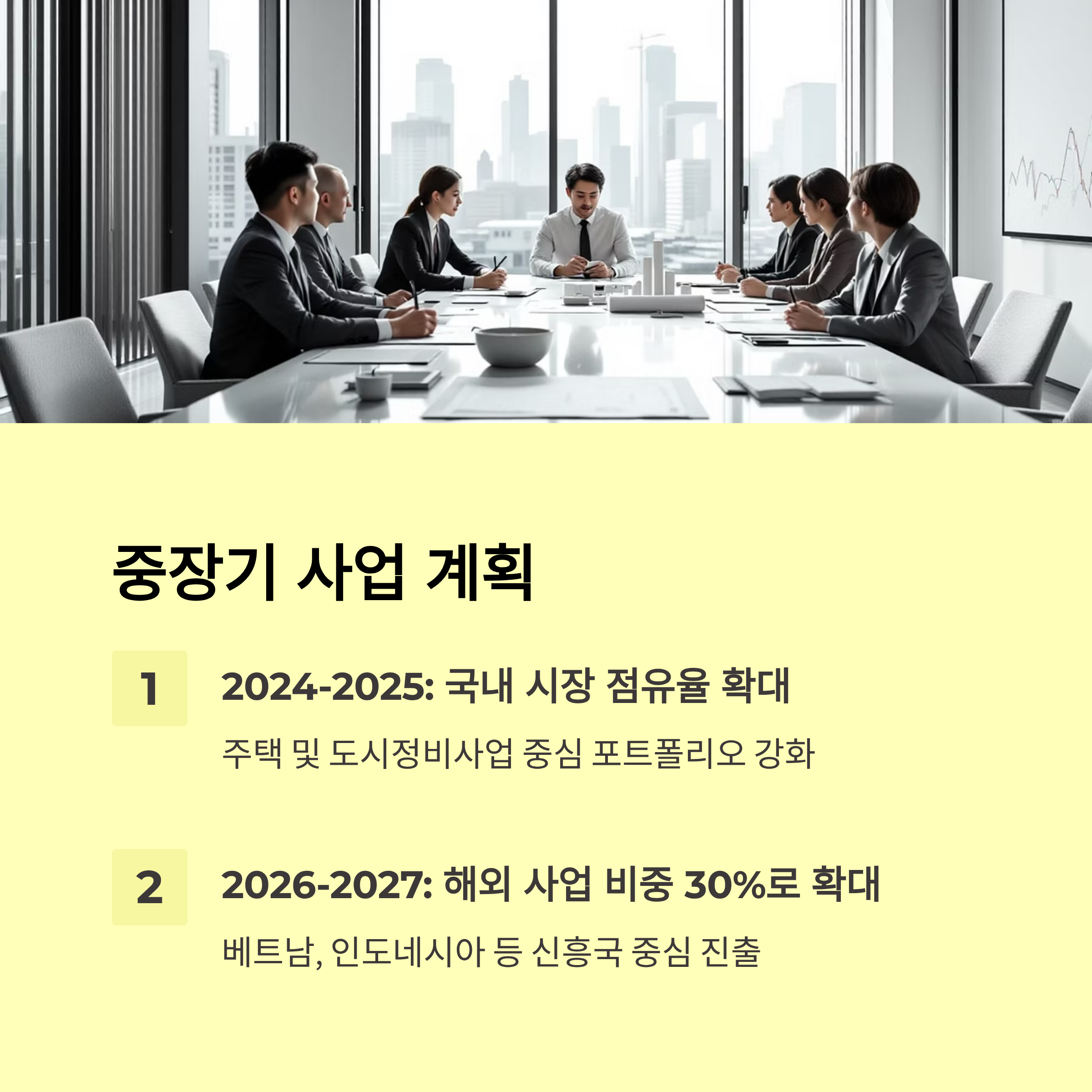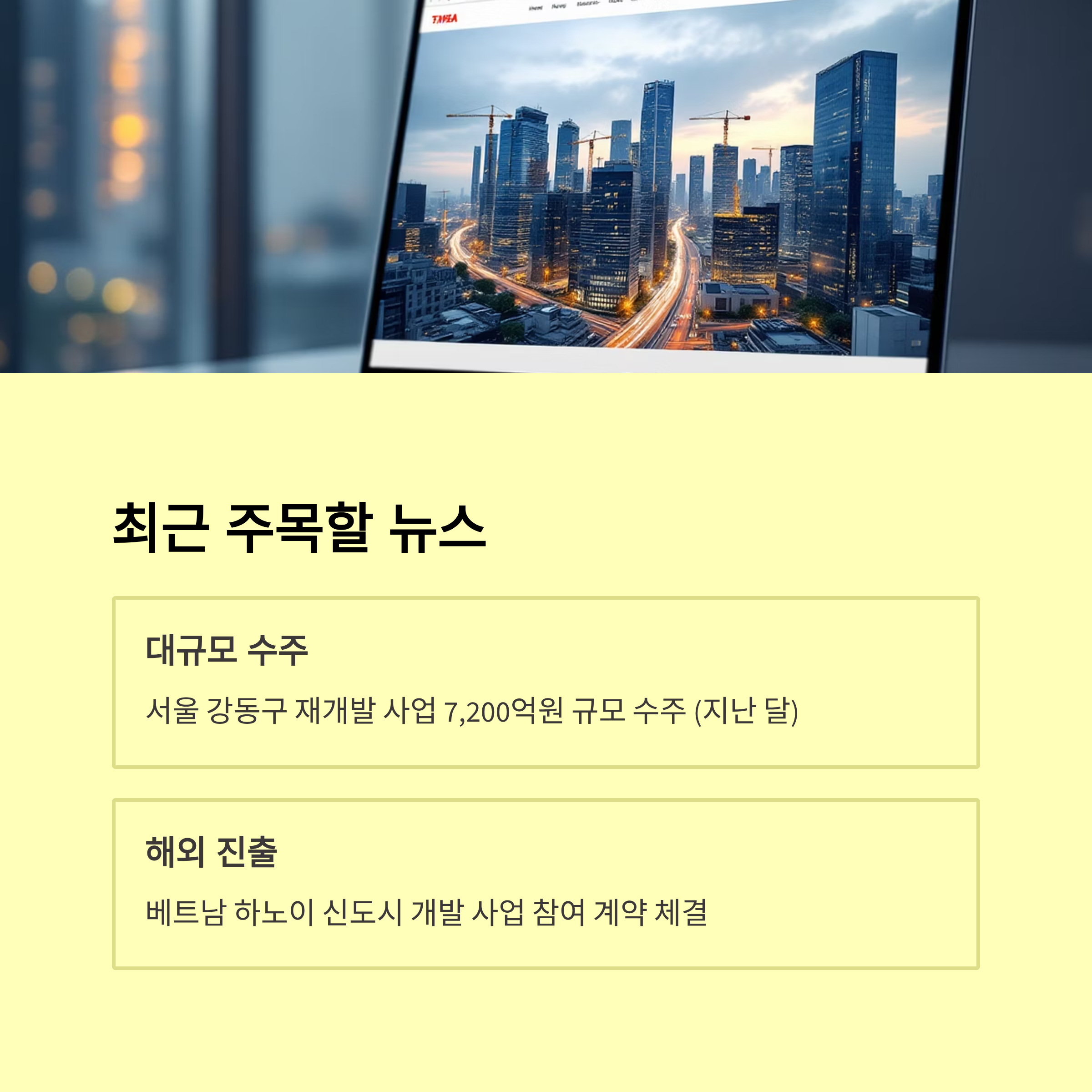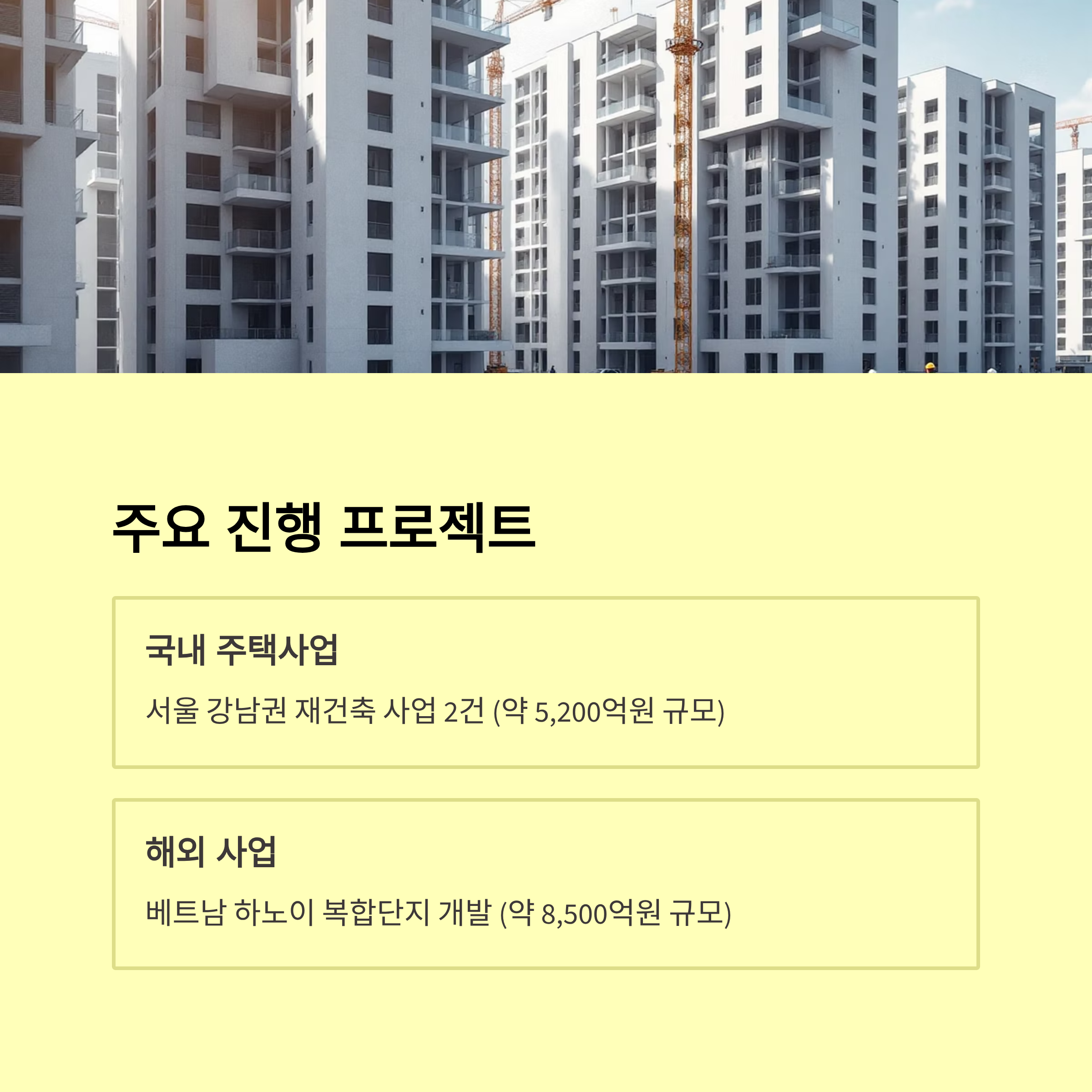 - 2025년 현재 주력 사업: 수도권(서울/경기/대구/부산 등) 아파트, 도시개발 사업, 토목/인프라 공사
