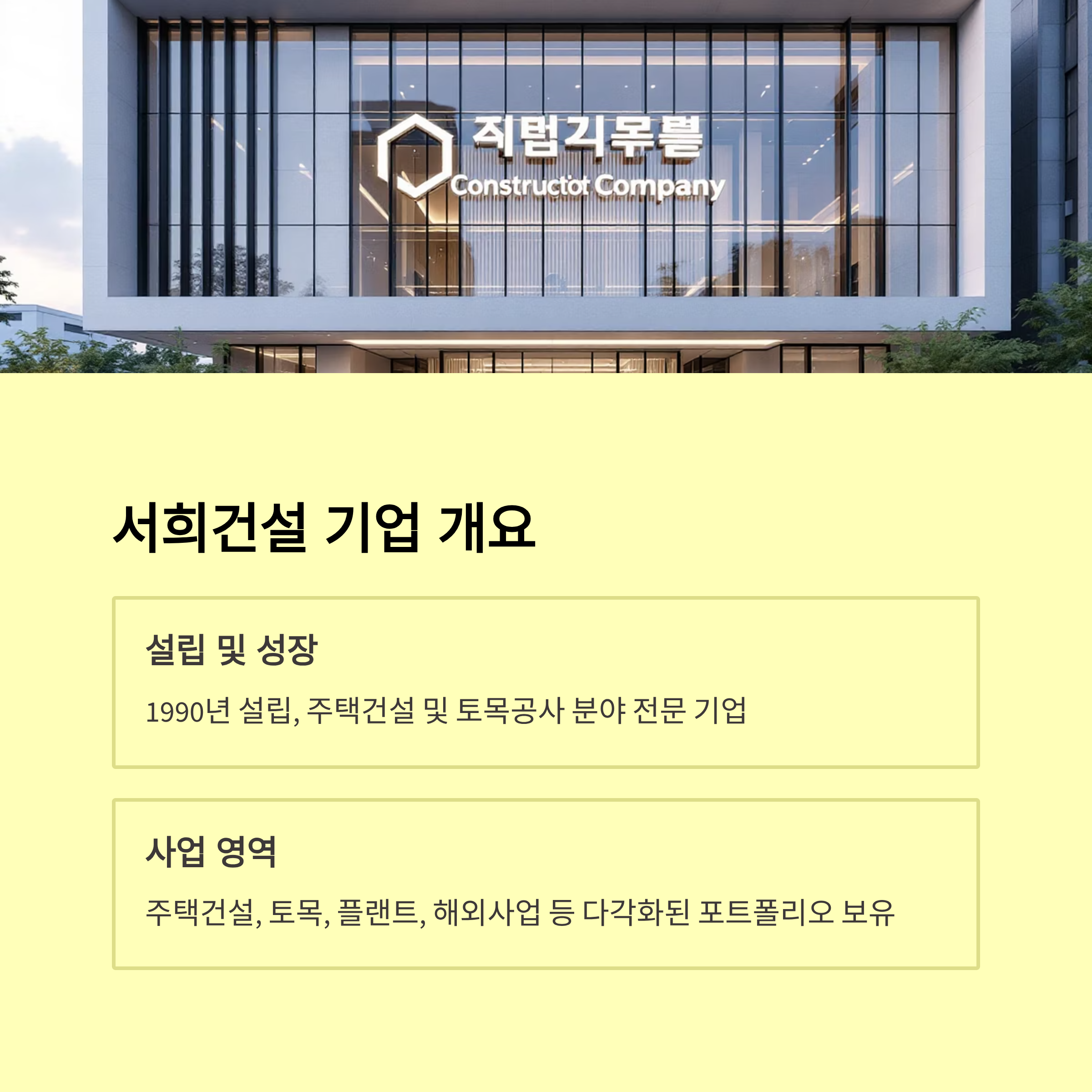 서희건설(035890)은 중견 도시개발·아파트 전문 건설사로, 2025년 8월 현재 압수수색 등 강도 높은 시사 이슈와