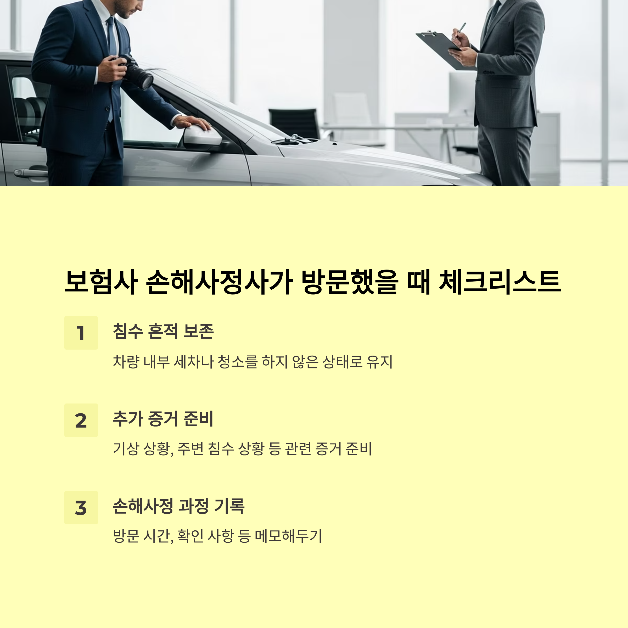 - 차량 내부·외부 침수 증거 확보 및 사진 촬영 철저