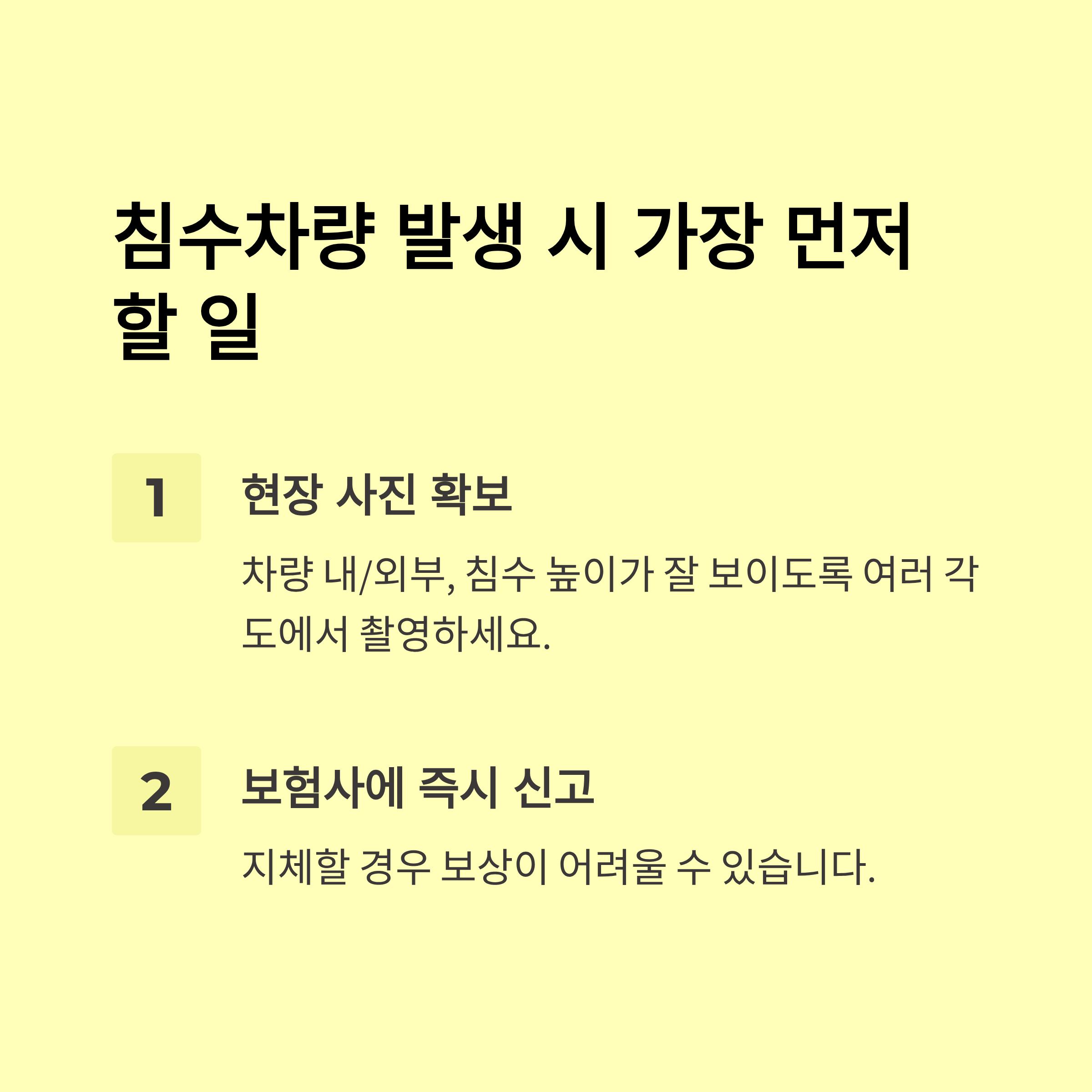 - 차량 상태 사진을 충분히 찍어 두어 침수 사실과 피해 정도를 객관적으로 입증
