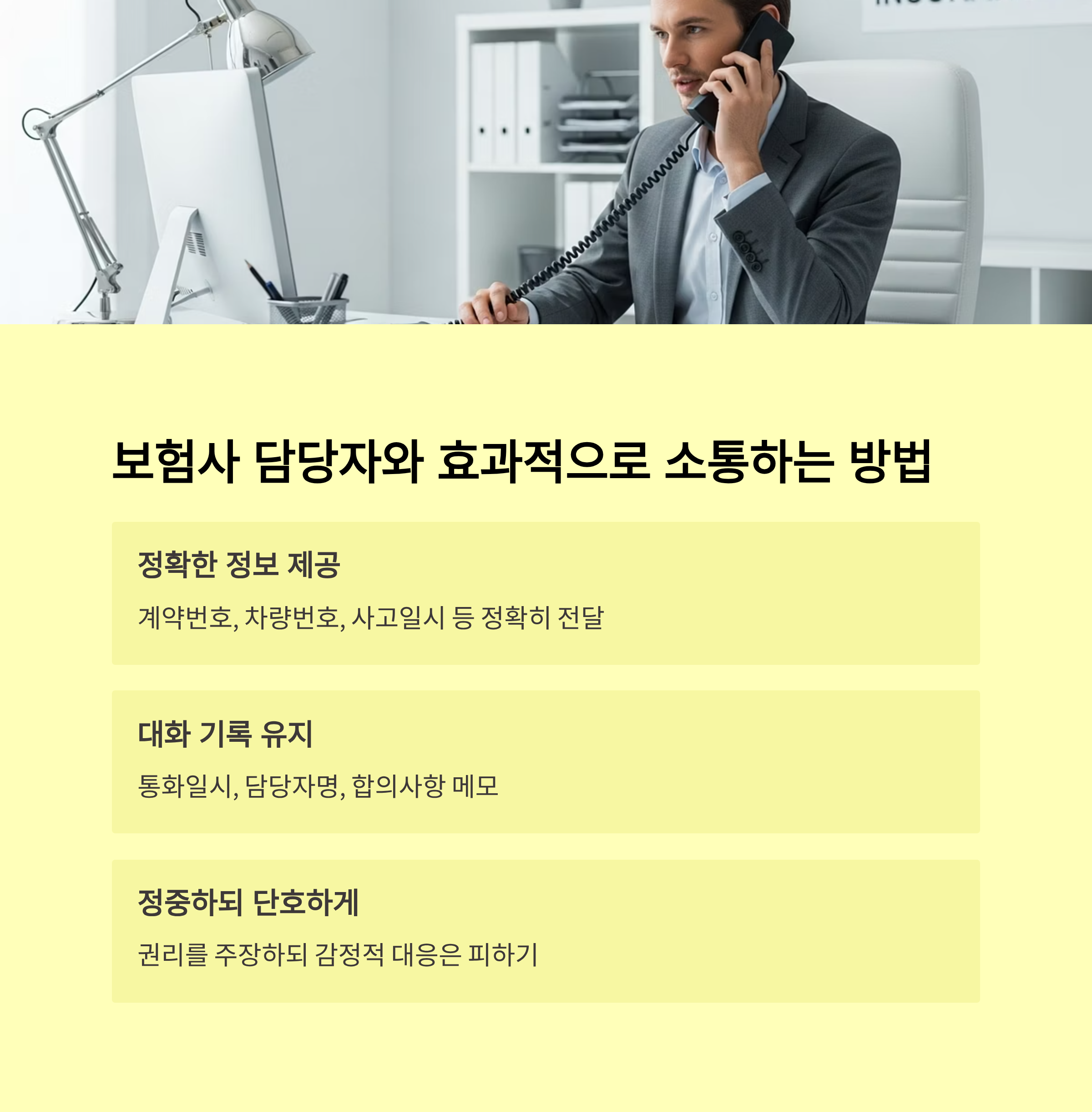 - 보험사 담당자와 통화 내용, 협의 기록은 꼼꼼히 메모하고 보관