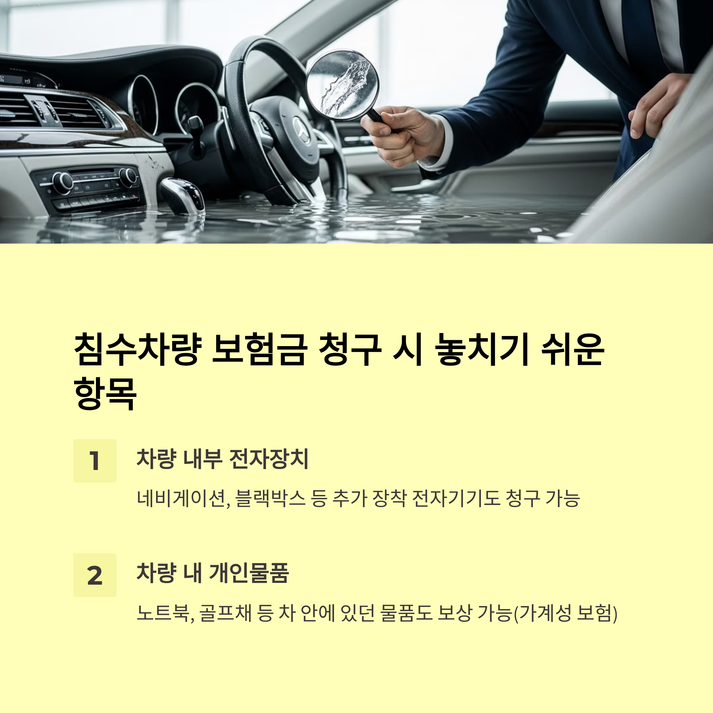 - 침수 피해 외 다른 사고 손상과 혼동하지 않도록 주의