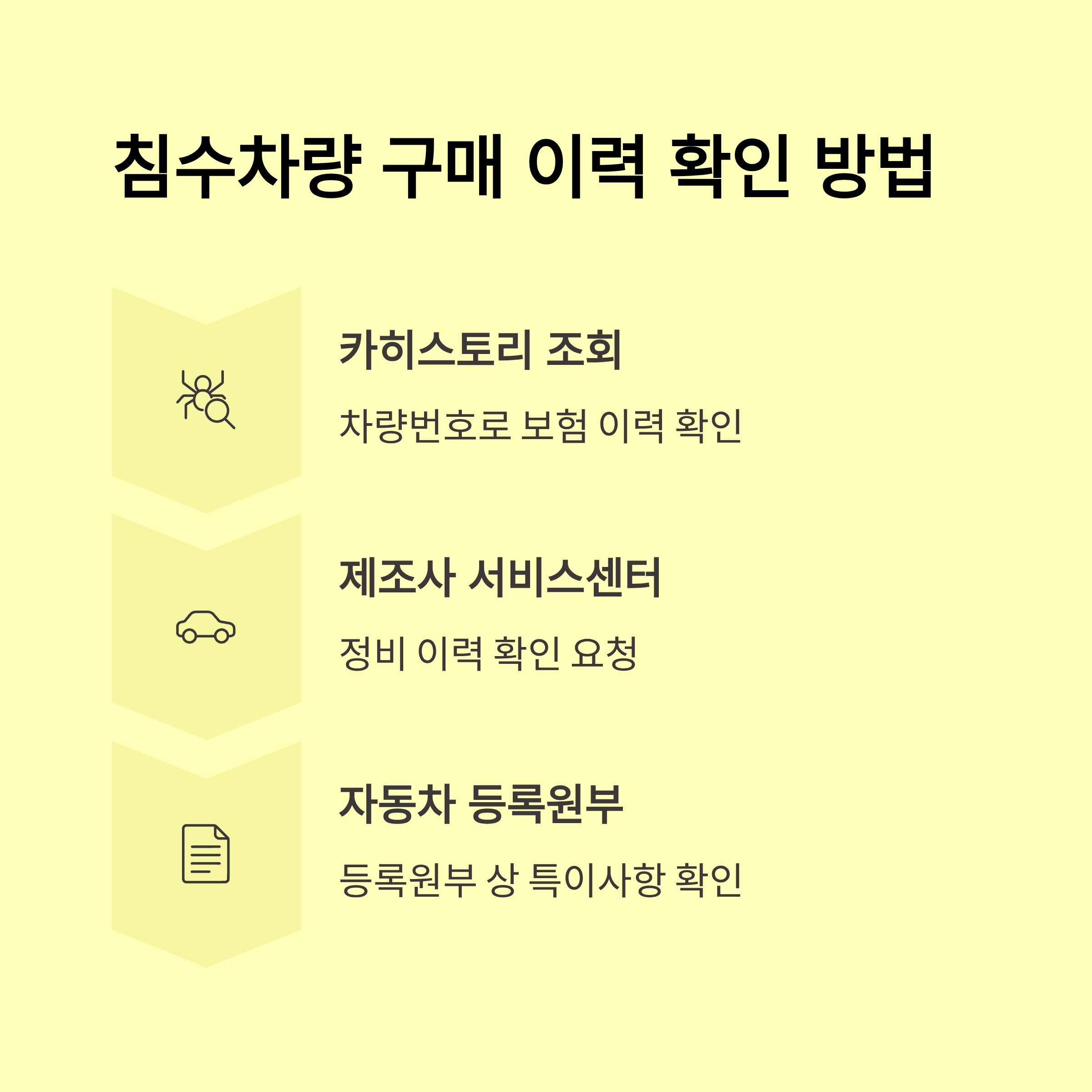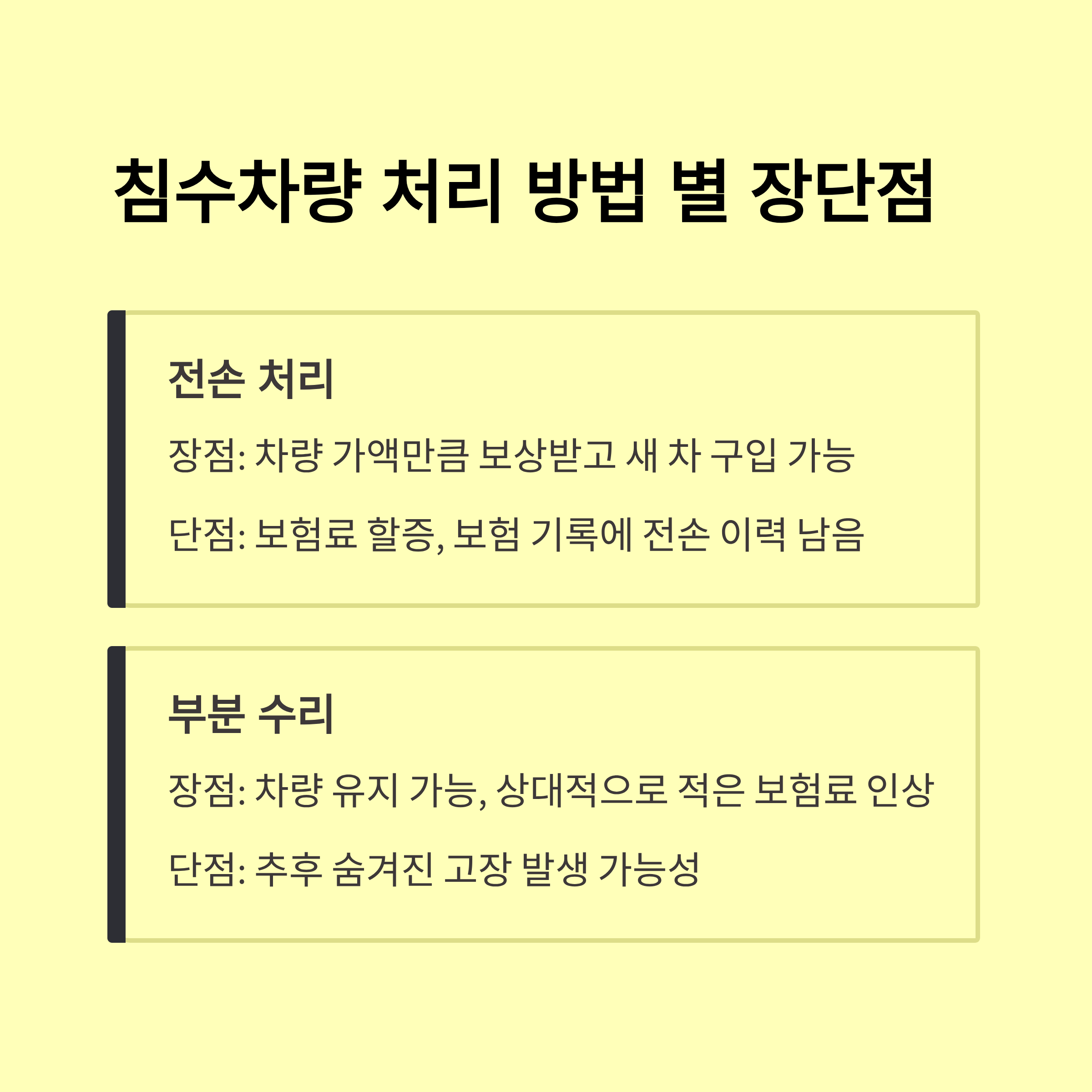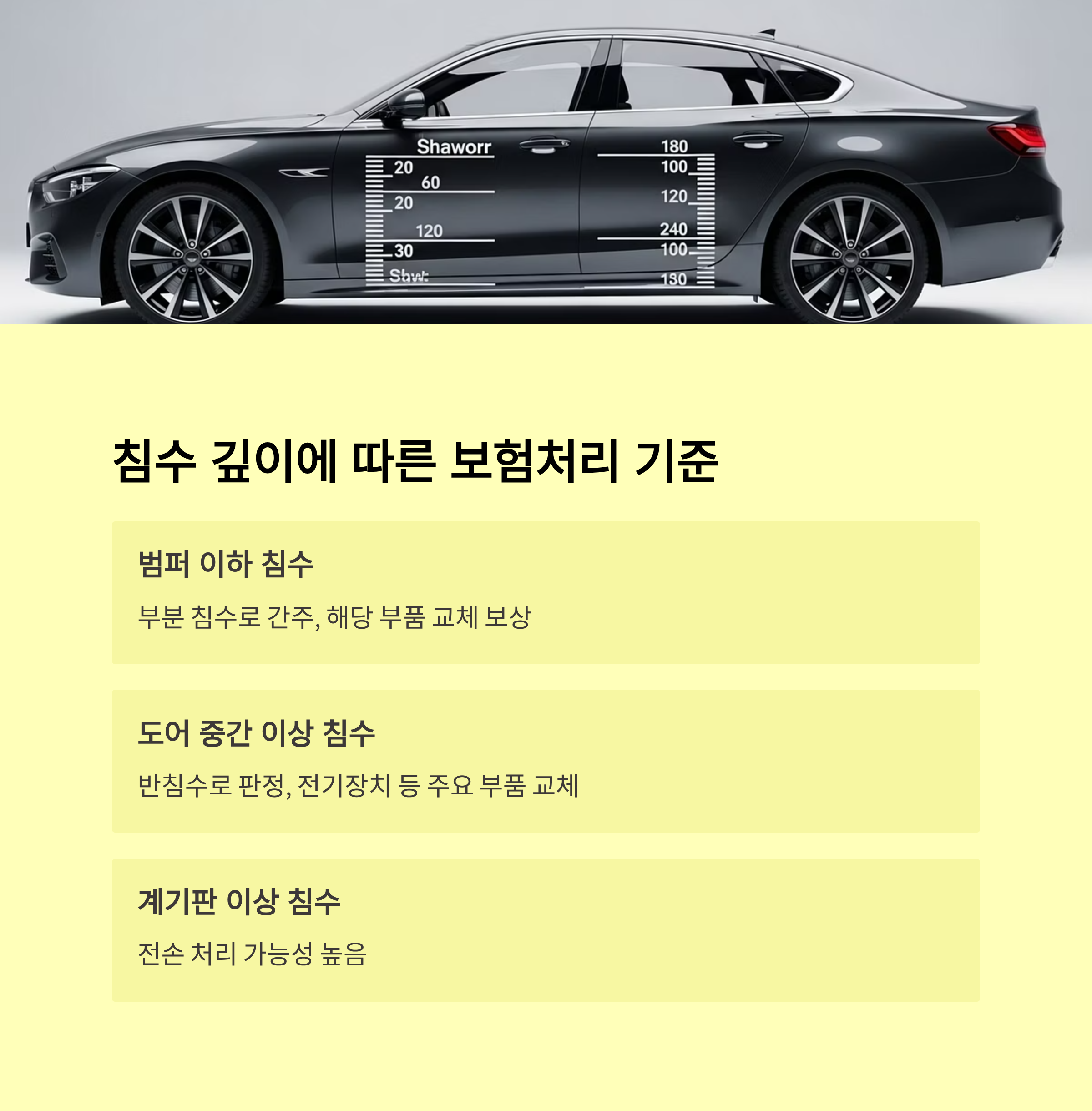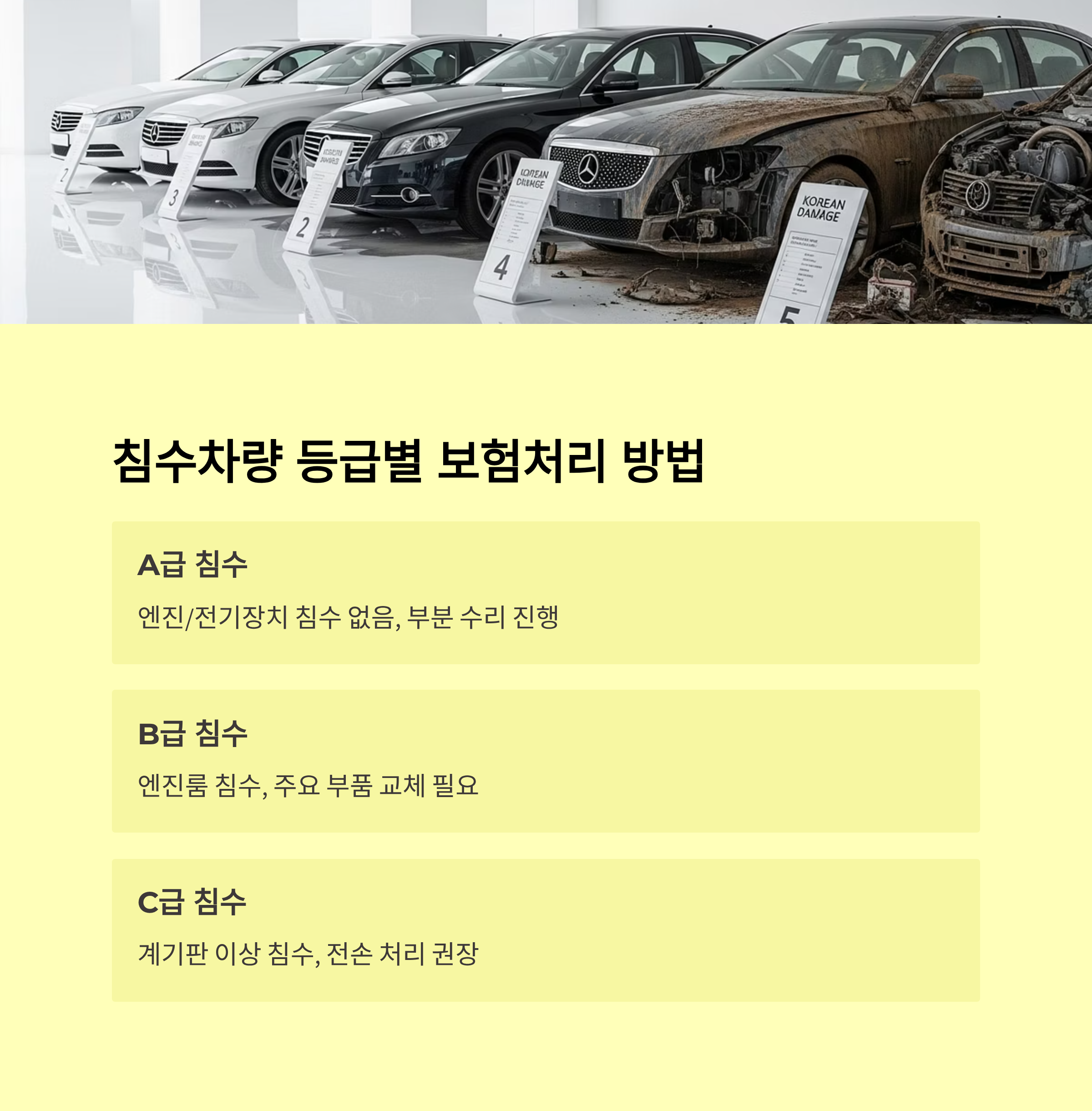 - 침수차량: 물에 잠겨 차량 내부·외부가 손상된 차량
