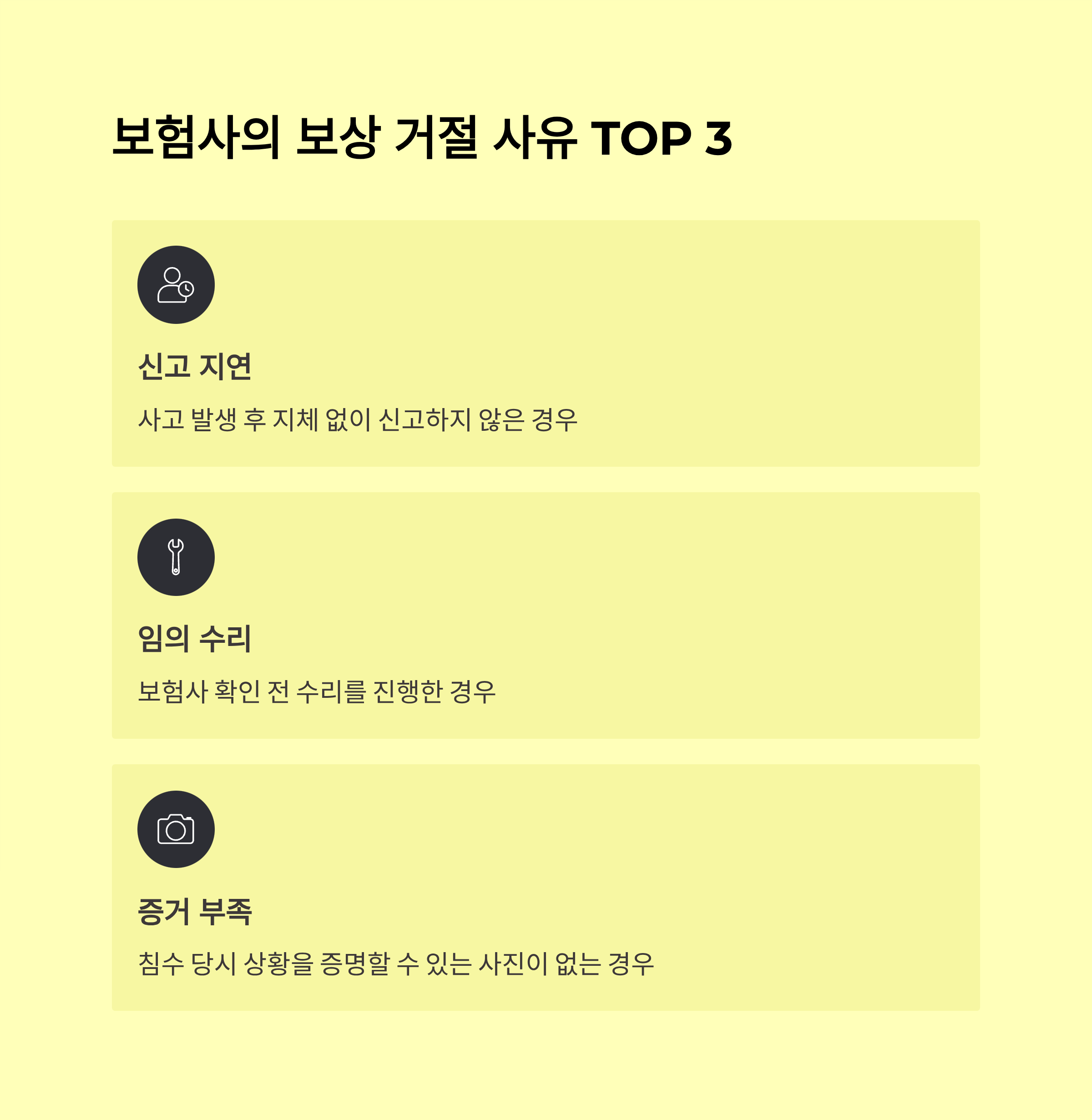 - 사고 차량 임의 수리 후 발견된 추가 침수 손상에 대해서는 보험금 지급 보류 가능