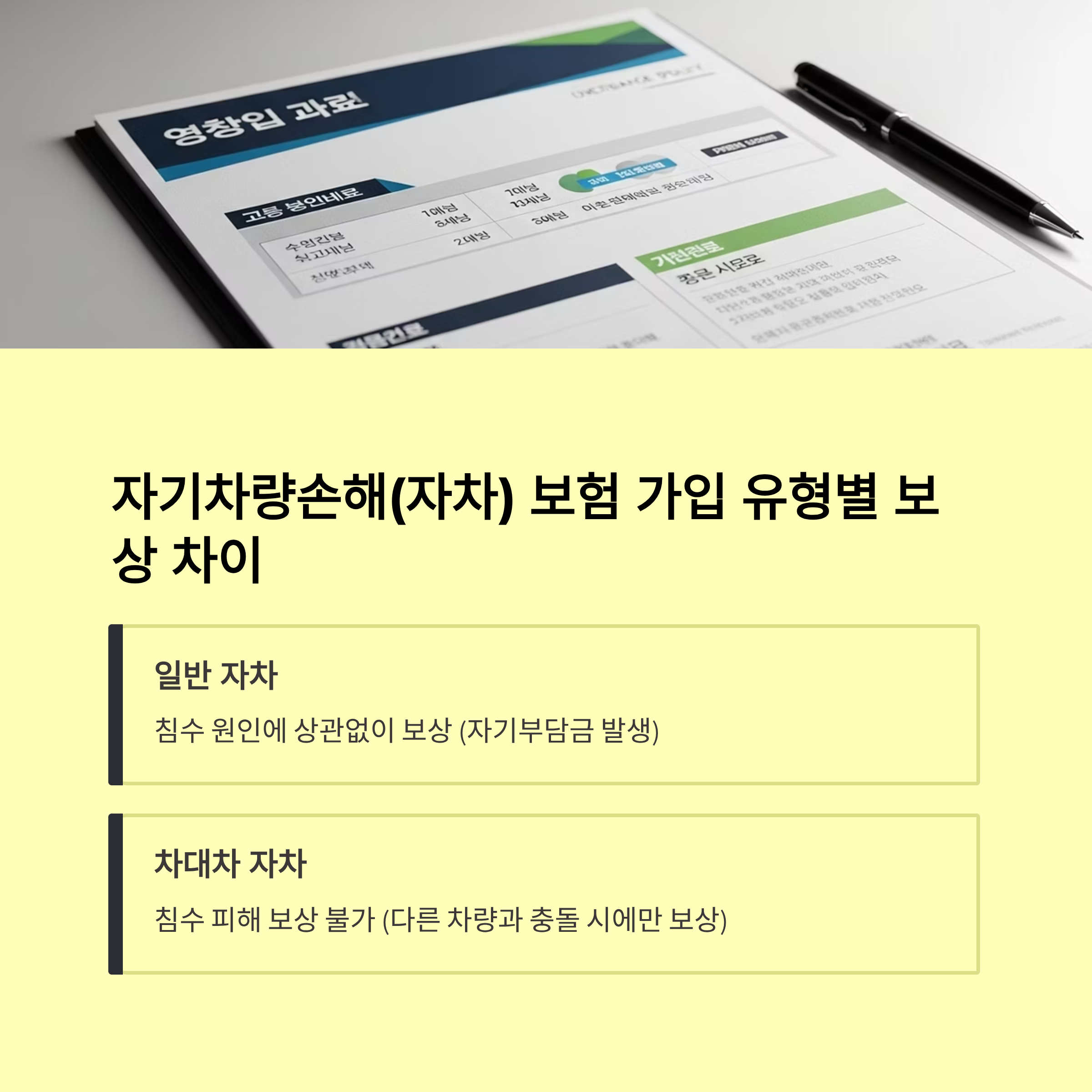 | 책임보험 | 다른 차량 피해만 보상, 자기차 침수 보상 불가 | 침수차량 보상 대상 아님 주의 |
