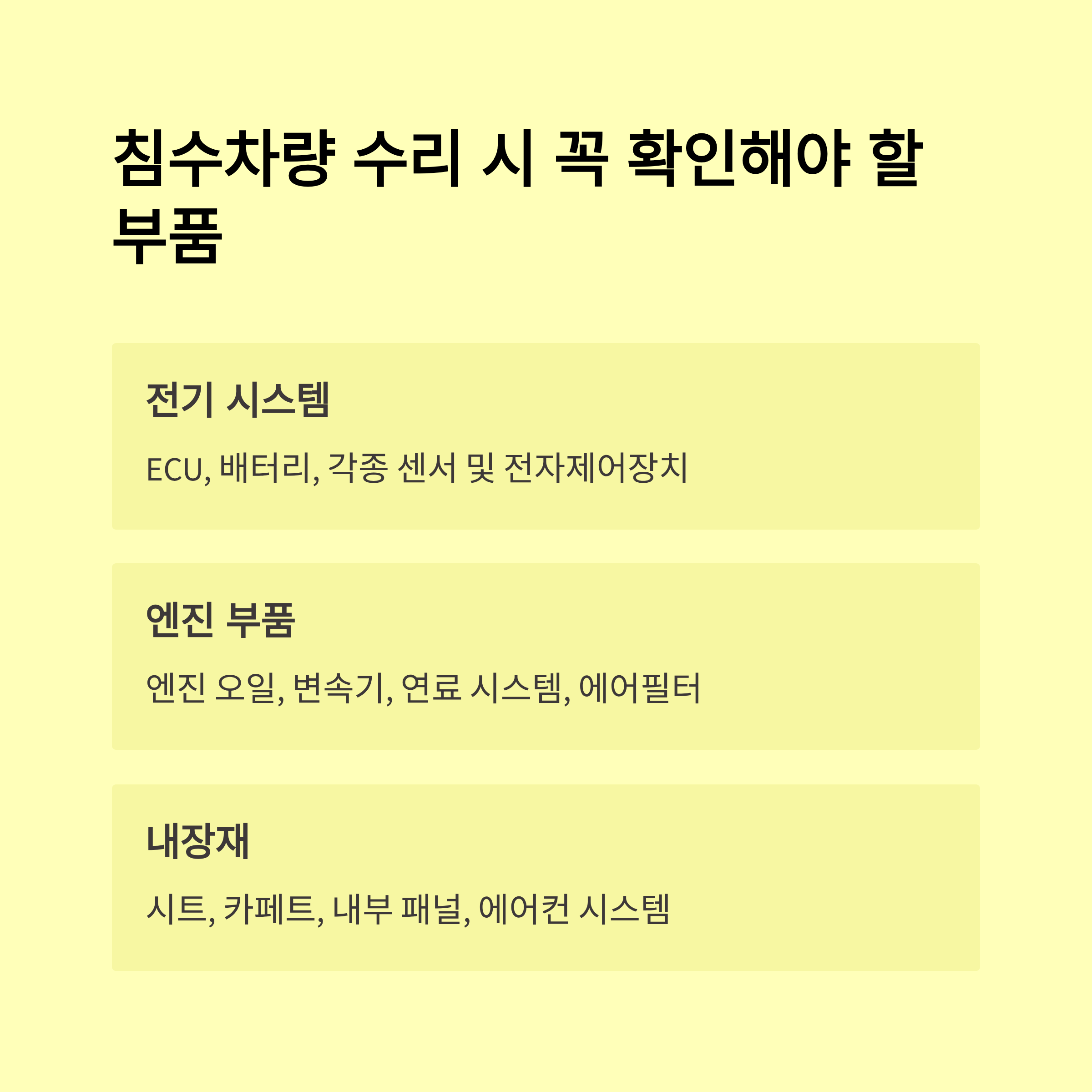 수리 과정에서는 차량 내부 전자부품, 엔진, 변속기, 배선류, 냉난방 시스템 등의 침수 피해 여부가 상세 점검됩니다.