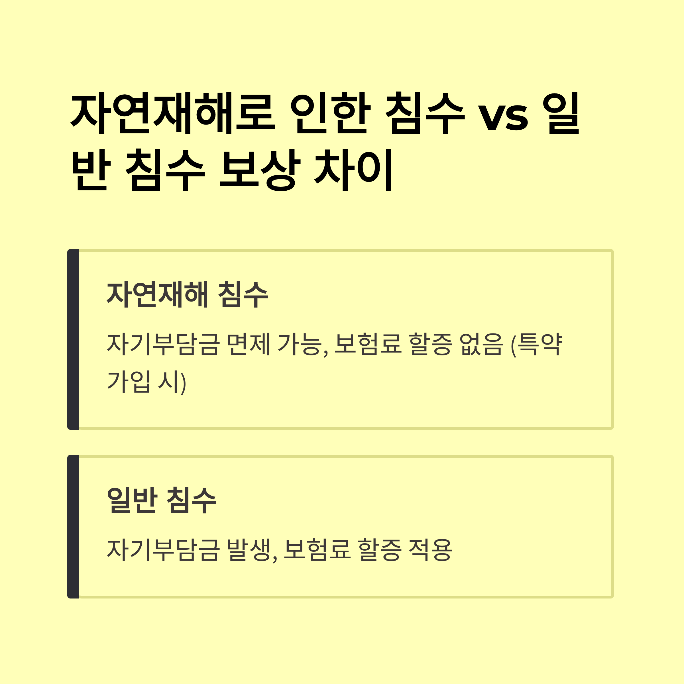 | 자연재해 특약 | 홍수, 태풍, 폭우 등 자연재해 침수 손해 보장 | 특약 가입자만 적용, 일부 보험사에서 제공 |