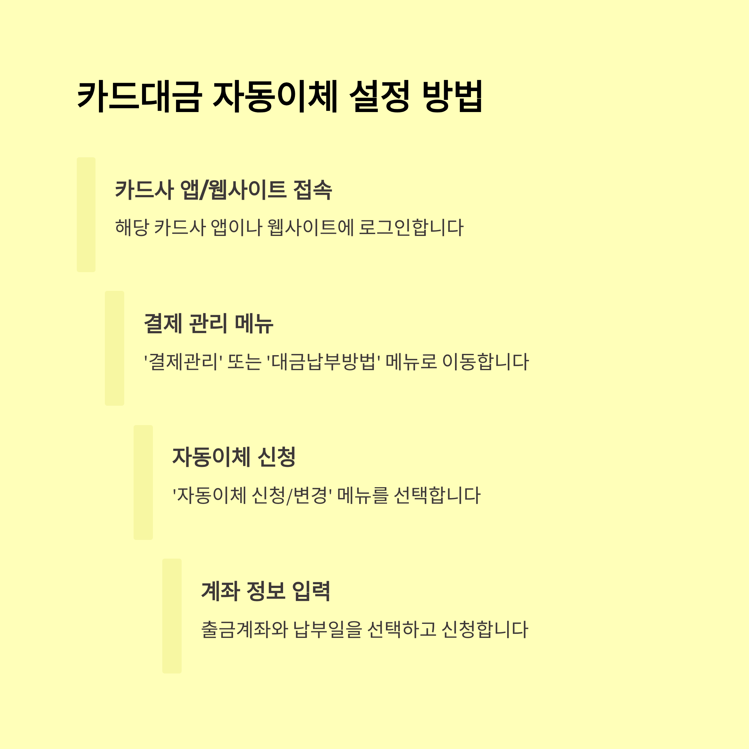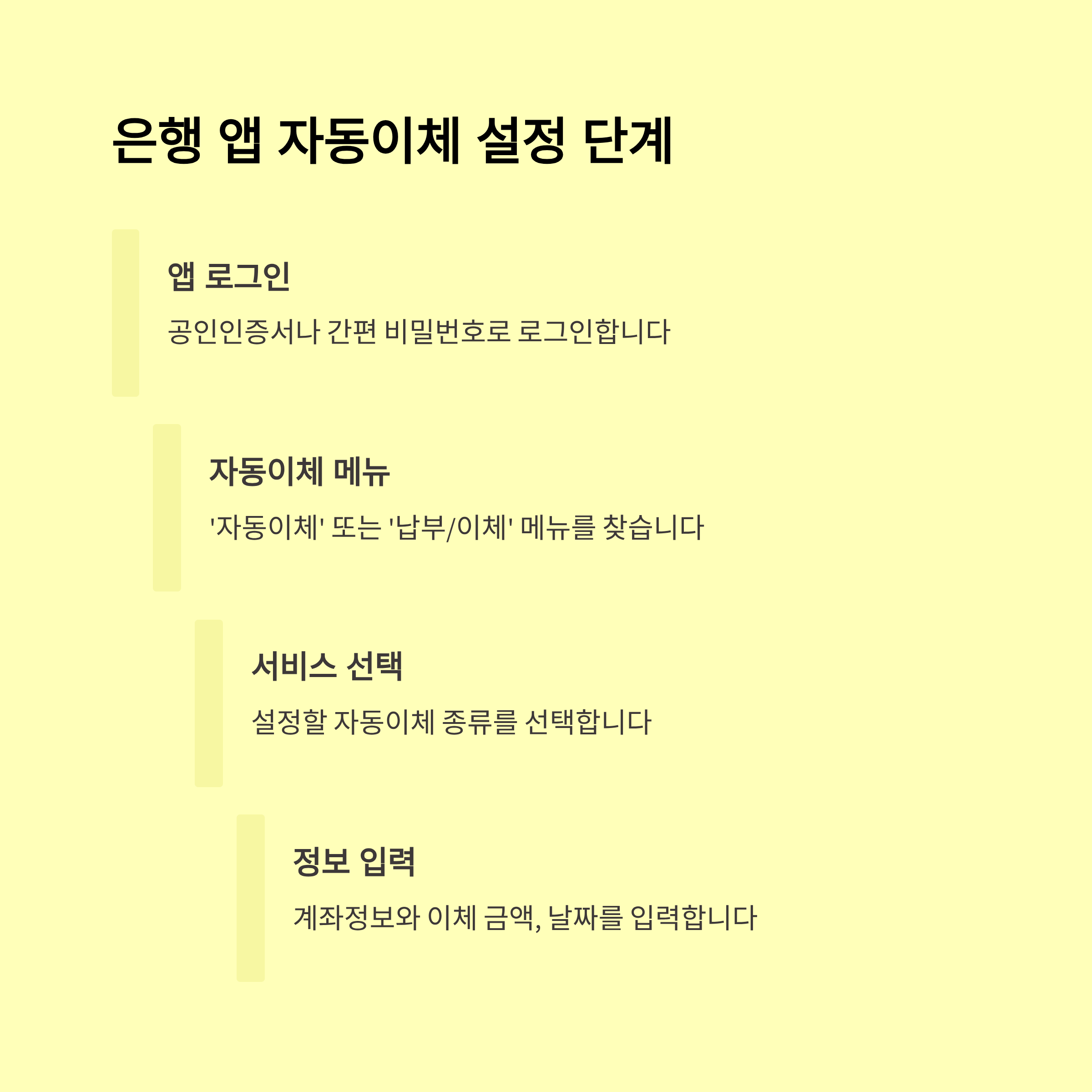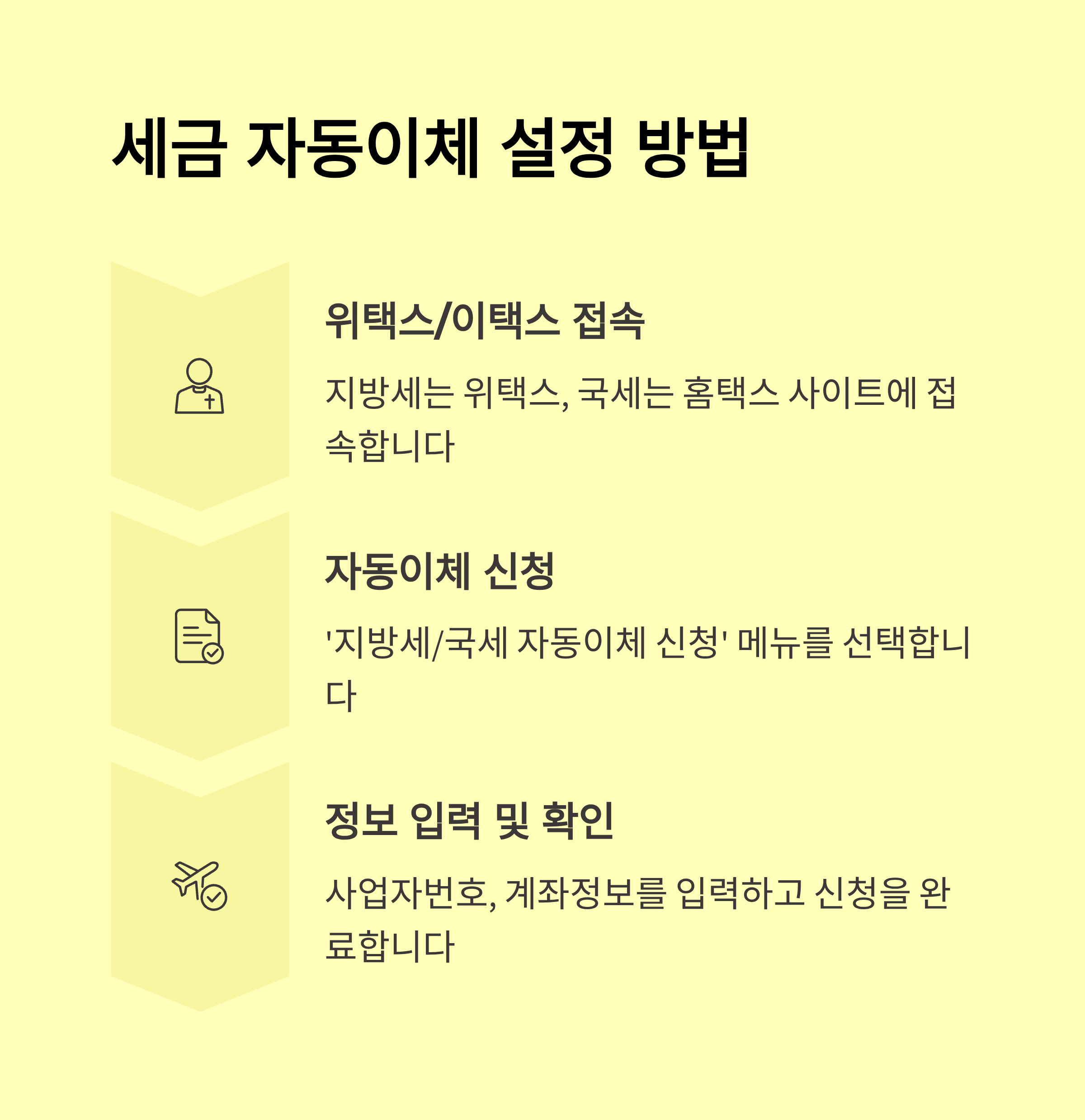 - 납부정보 입력: 세금·보험료 등 자동이체 대상과 계좌 지정