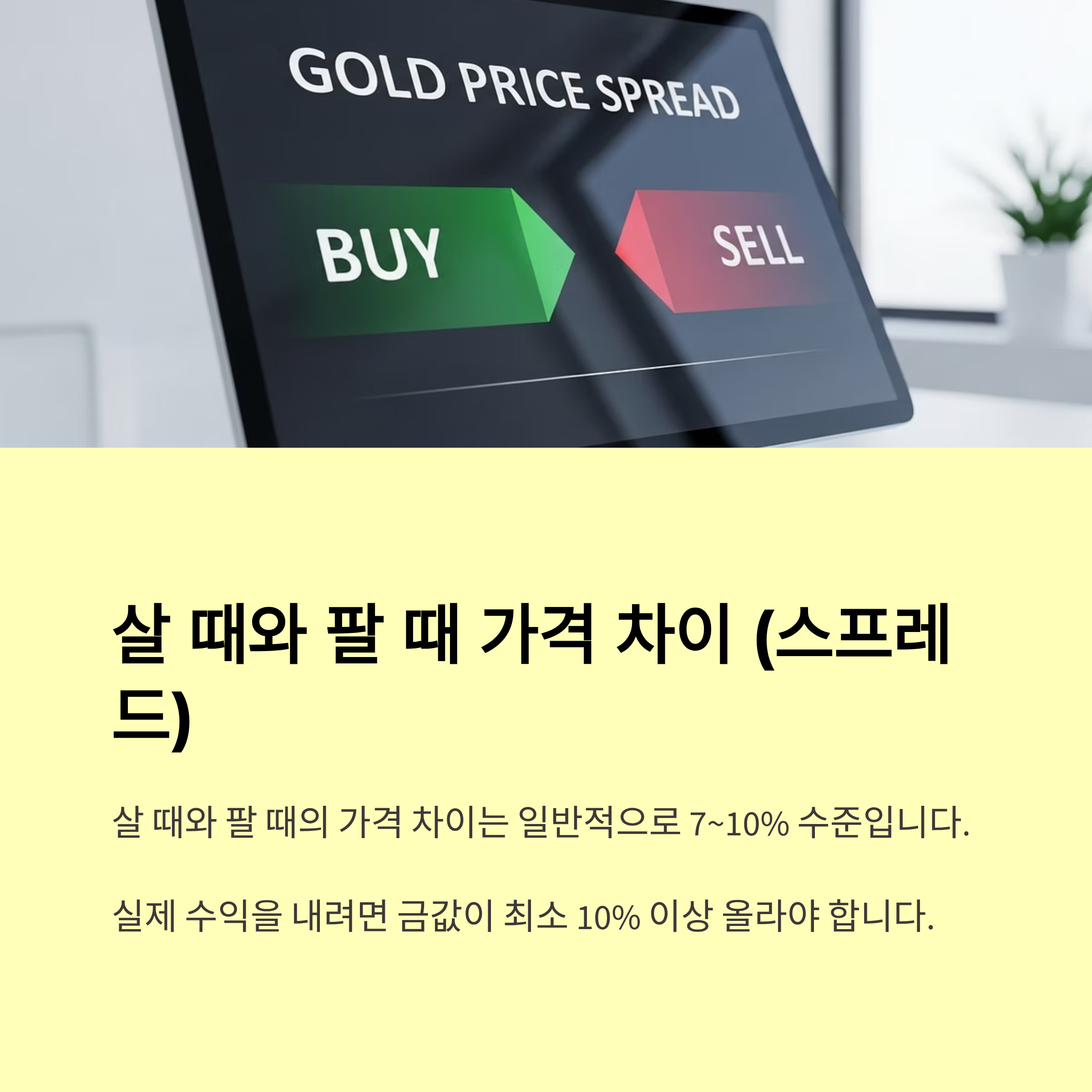 이 차이는 바로 ‘스프레드’라고 부르는 부분이에요. 금을 보유하고 있다가 나중에 이득을 보려면 이 스프레드 이상의 시세 상승이 있어야 수익이 발생하는 거예요.