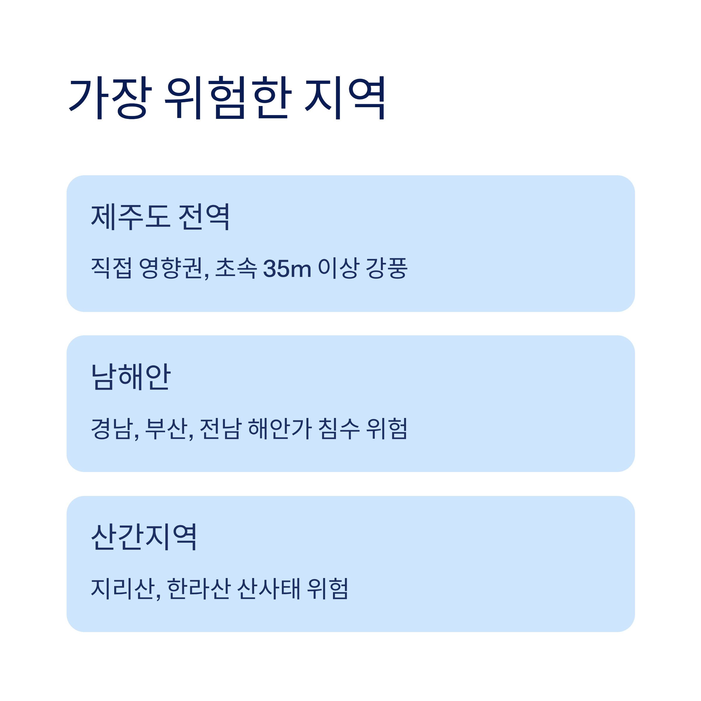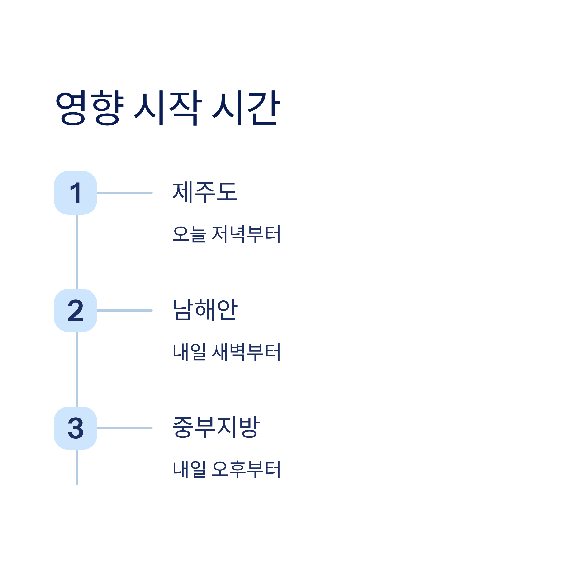 - 제주 및 남해안: 태풍 직접 상륙 가능성은 낮지만, 해상 강풍과 높은 파도 발생 우려로 해상 교통과 항공편 변동 가능성이 큽니다.