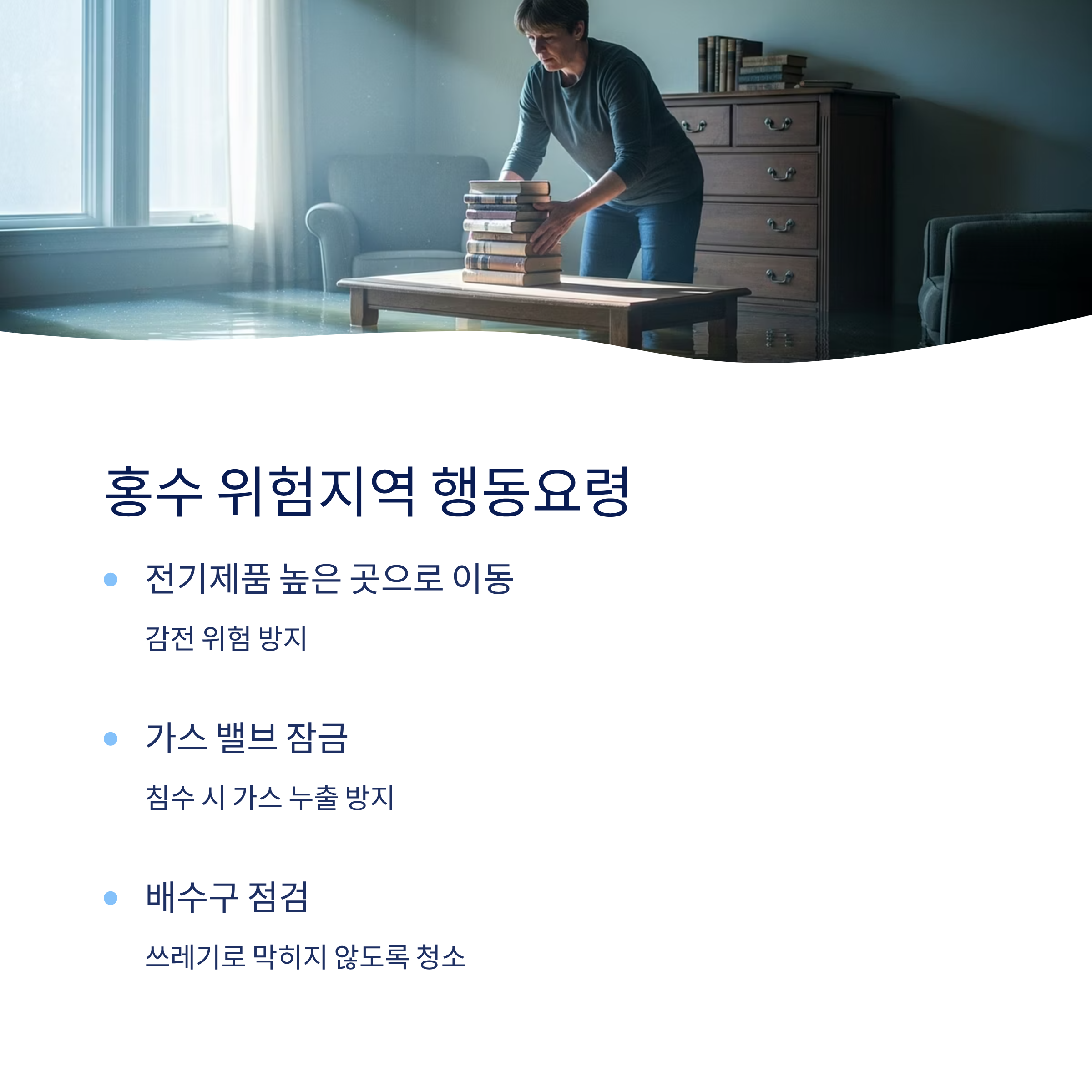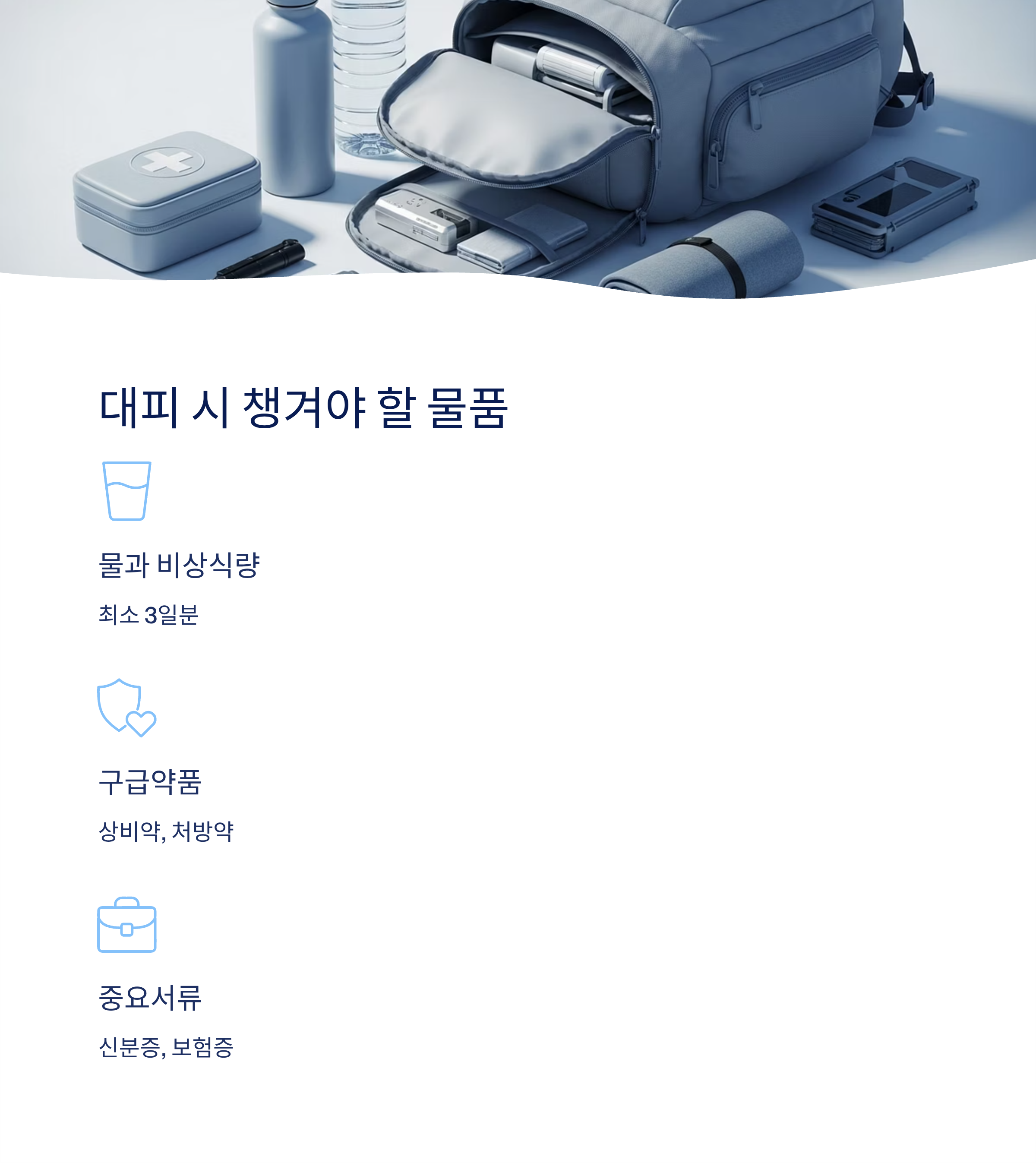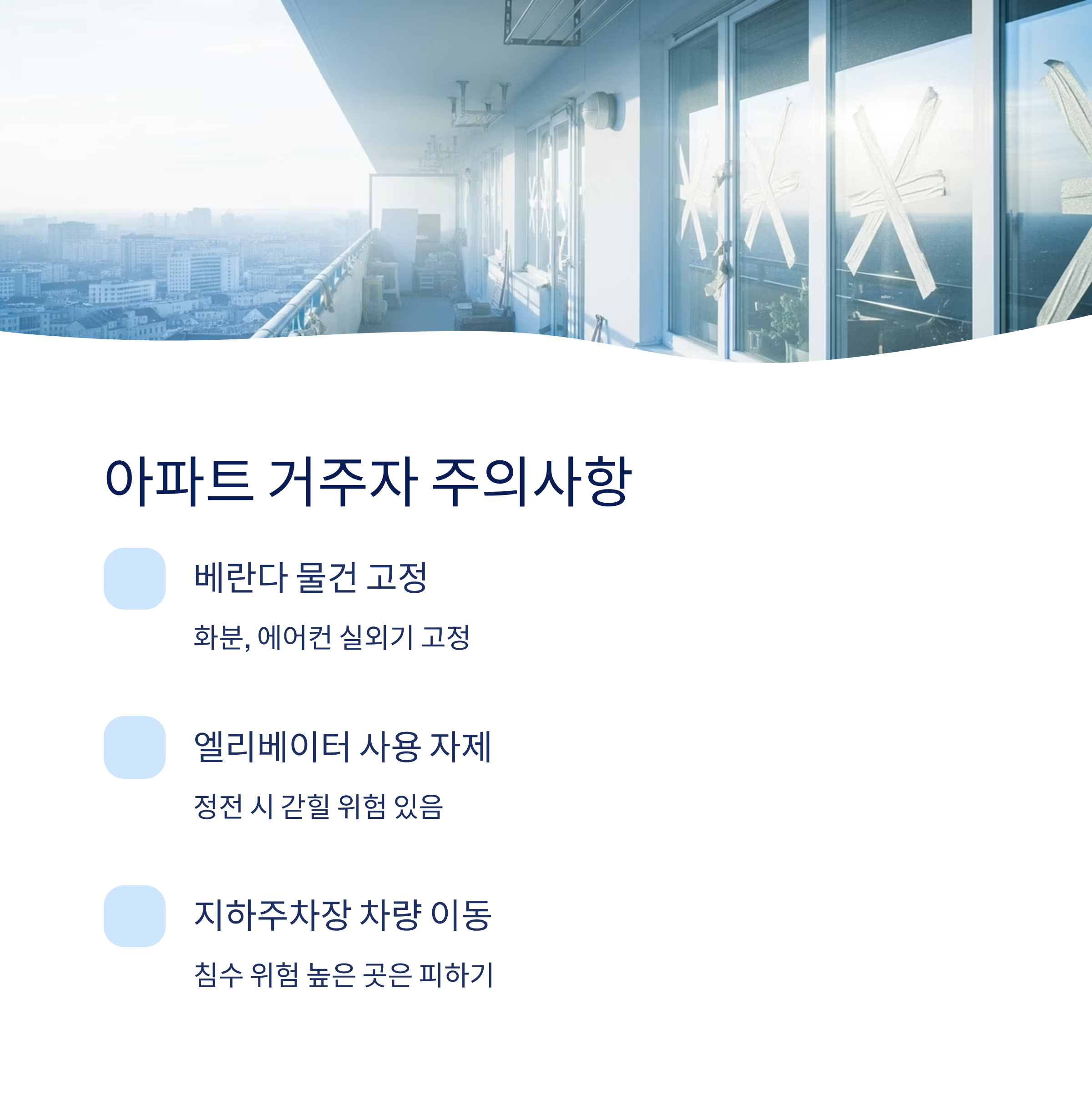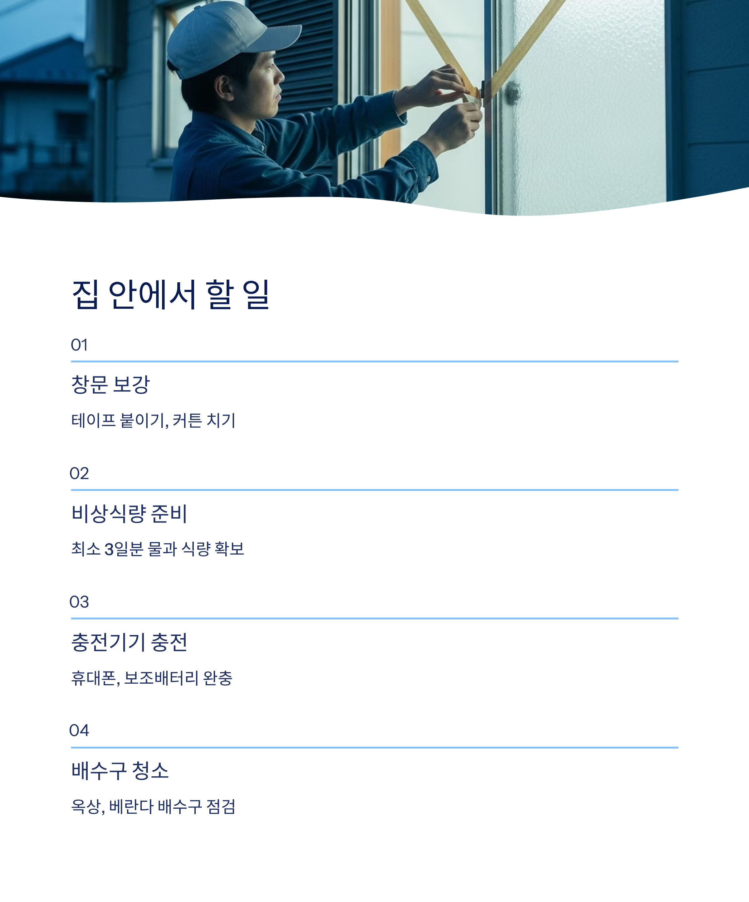 - 전기, 가스, 수도 점검 및 비상용품(식량, 물, 약품) 준비를 사전에 완료하세요.