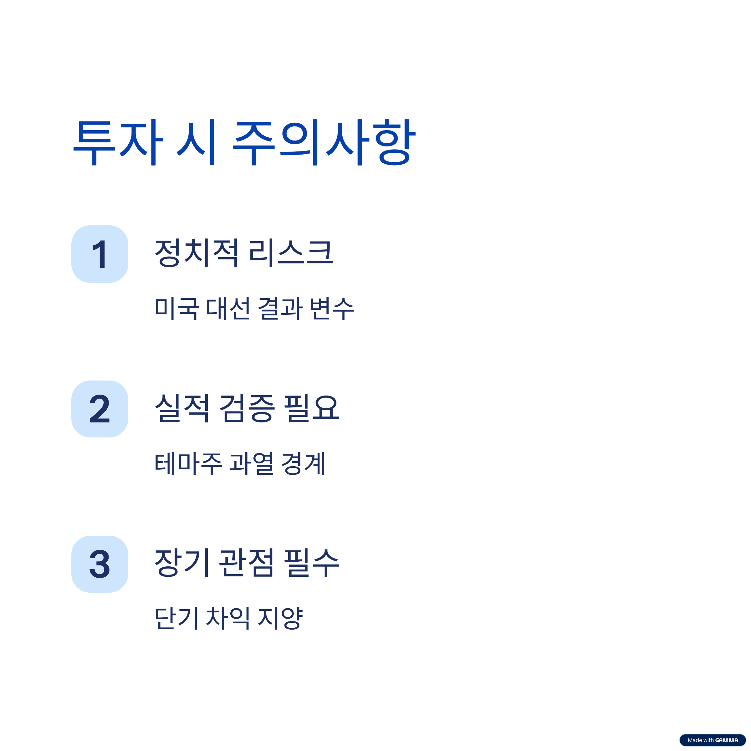 짧은 뉴스에도 급등할 수 있는 테마지만, 반대로 하락 시 손실이 클 수 있으니 절대 몰빵은 금물! 🎯 분할매수와 분할매도 전략이 생명이에요.