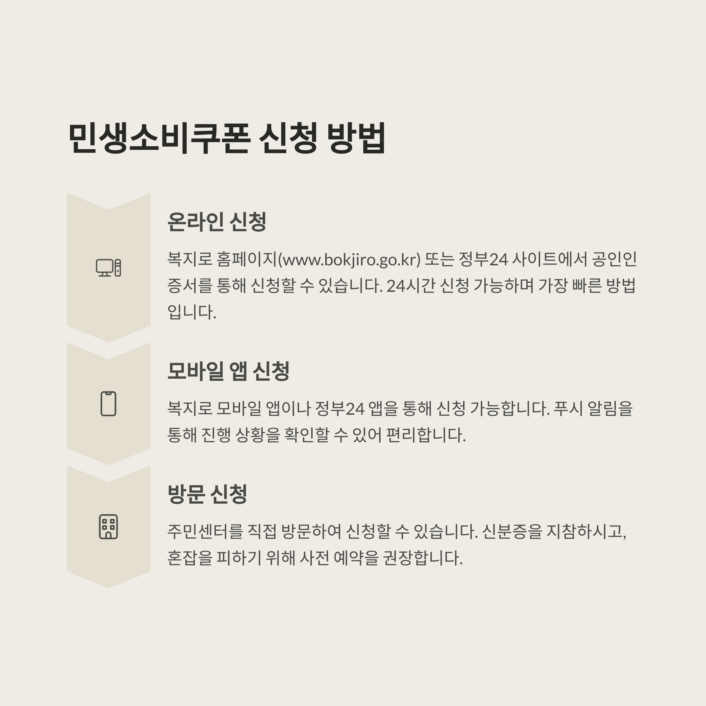 1. 정부24(www.gov.kr) 사이트 접속 및 로그인 (공동인증서, 금융인증서, 간편인증 등) 2. 메인 화면의 '민생회복 소비쿠폰 신청' 배너 클릭 3. 본인 인증 및 개인정보 제공 동의 4. 지급 대상 여부 실시간 확인 5. 지급받을 카드사 또는 지역사랑상품권 선택 6. 신청 완료 및 접수 확인 문자 수신
