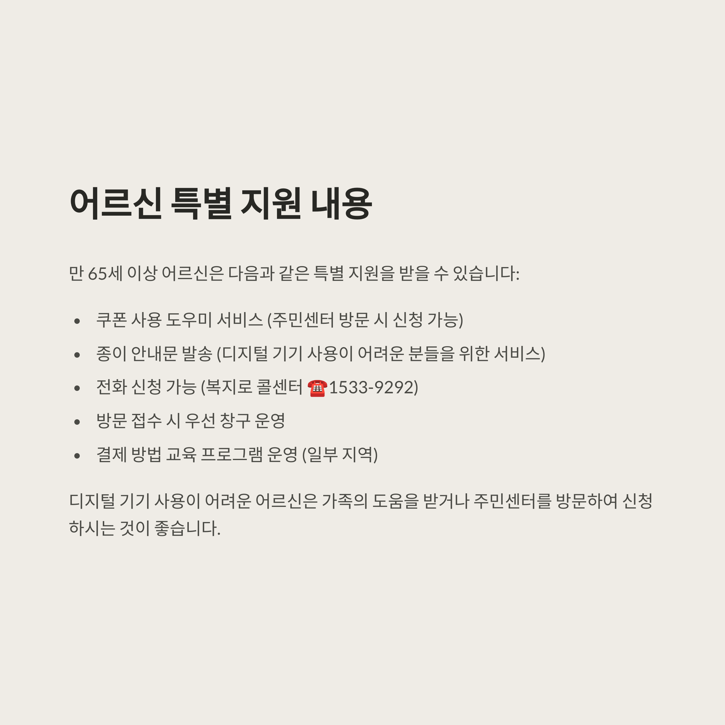 PC나 스마트폰 사용이 어려운 분들을 위해 오프라인 현장 접수도 병행될 예정입니다. 주소지 관할 주민센터(행정복지센터)나 카드사와 연계된 은행 창구에서 신청할 수 있습니다.
