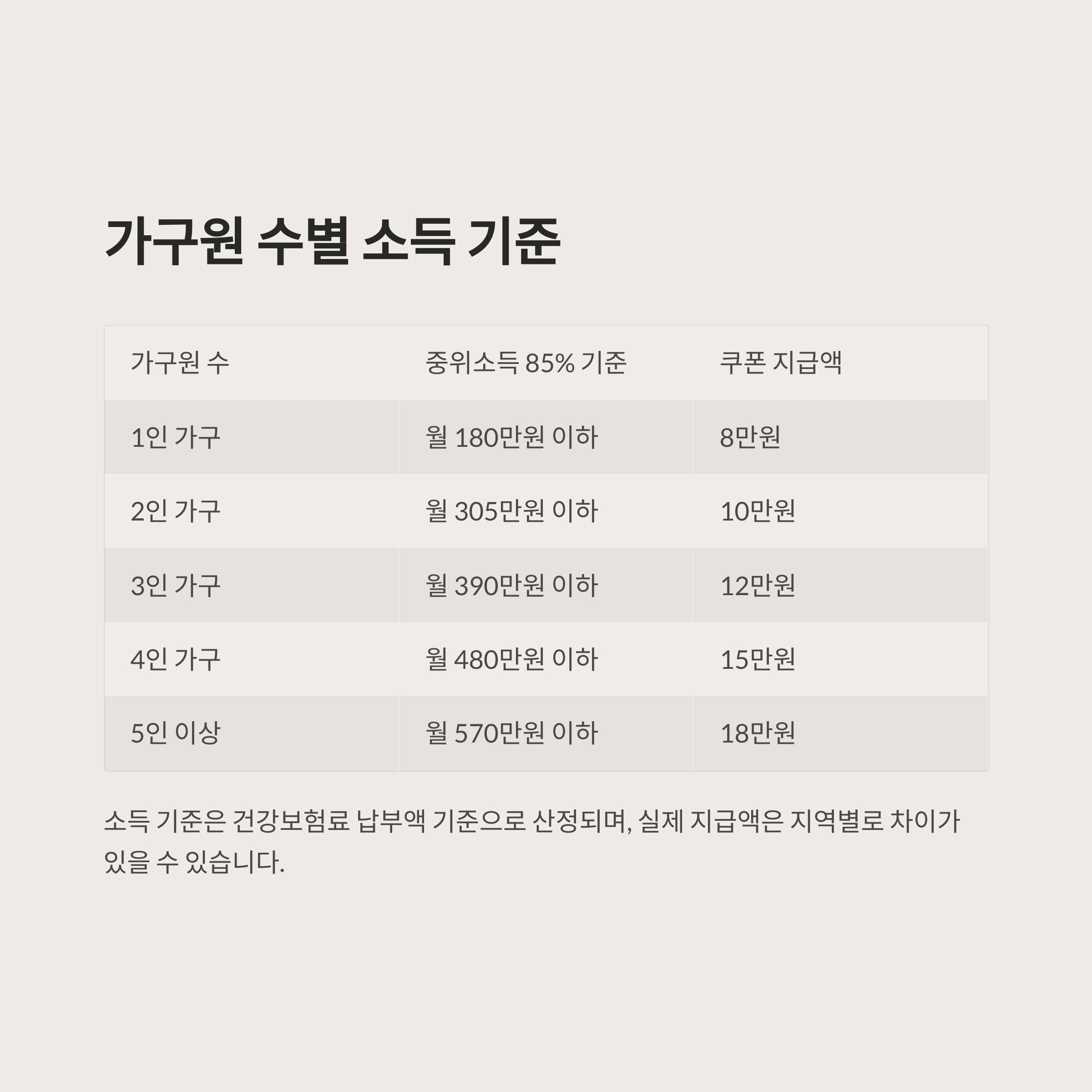 선별 지급 방식으로 결정될 경우, 건강보험료 납부액이 주요 기준이 될 가능성이 높습니다. 가구별 소득과 재산을 종합적으로 반영하는 건강보험료를 기준으로 중위소득 일정 비율(예: 80% 또는 100%) 이하 가구를 대상으로 할 수 있습니다. 정확한 기준은 정부 발표를 통해 확정되므로, '국민건강보험' 홈페이지에서 미리 우리 가족의 건강보험료를 확인해보는 것이 좋습니다. (국민건강보험공단 바로가기)