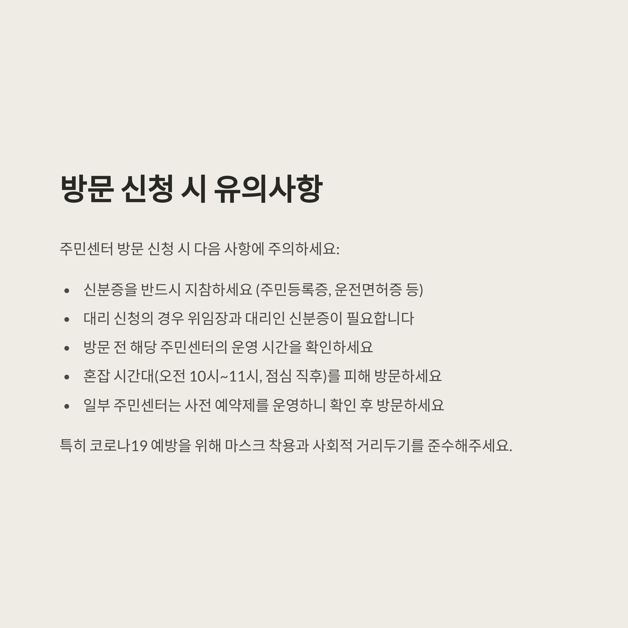 - 본인 신청 시: 본인 신분증 (주민등록증, 운전면허증, 여권 등) - 대리 신청 시: 위임장, 신청인 및 대리인의 신분증, 가족관계증명서 등 관계 증명 서류 대리 신청의 경우, 허용되는 대리인의 범위(예: 동일세대 가구원)가 정해져 있을 수 있으므로 사전에 확인이 필요합니다. 서류 미비 시 재방문해야 하는 번거로움을 피하기 위해 꼼꼼히 챙겨가세요.